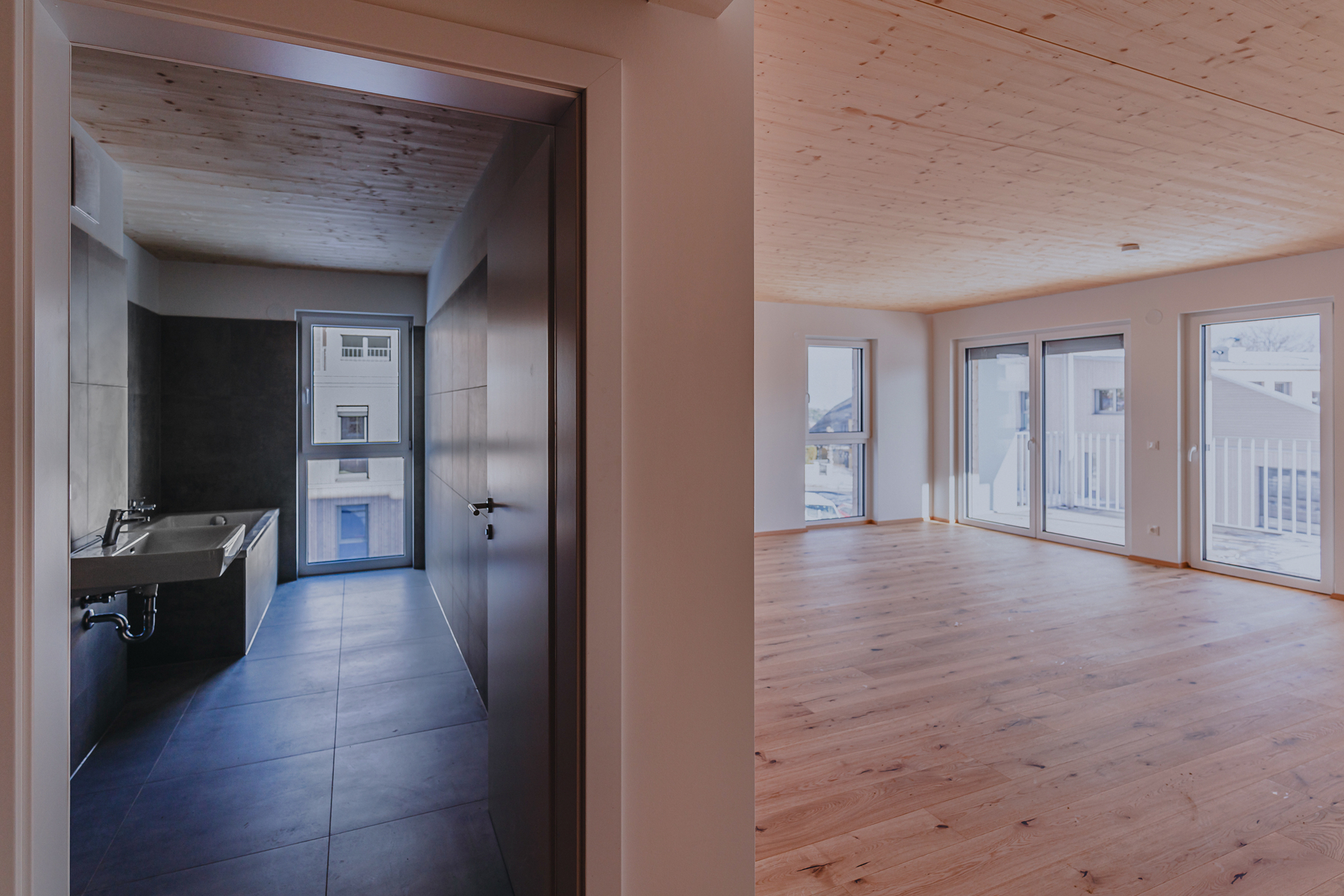 Fertigteildecke aus Holz und Beton in flacher Ausführung.
