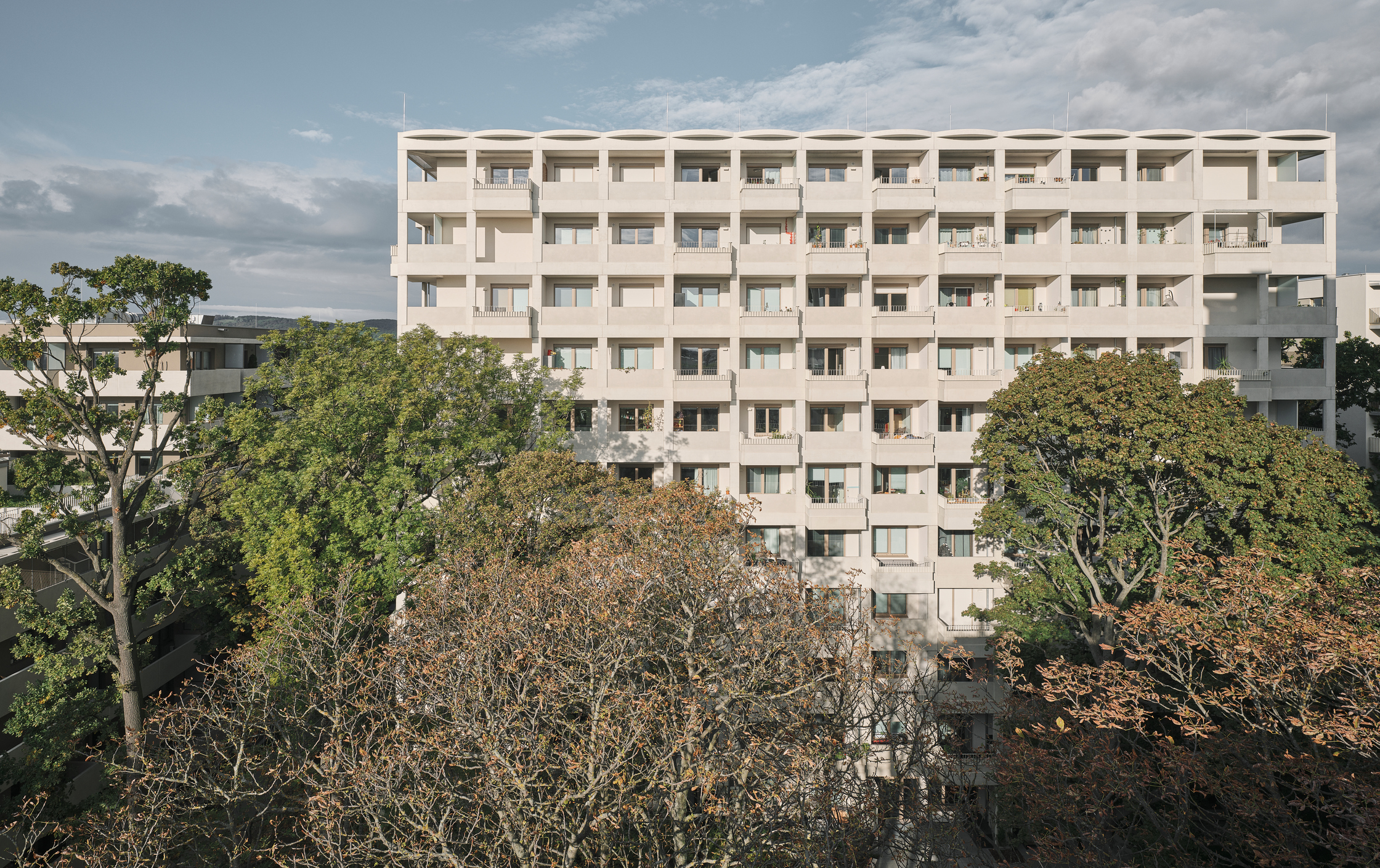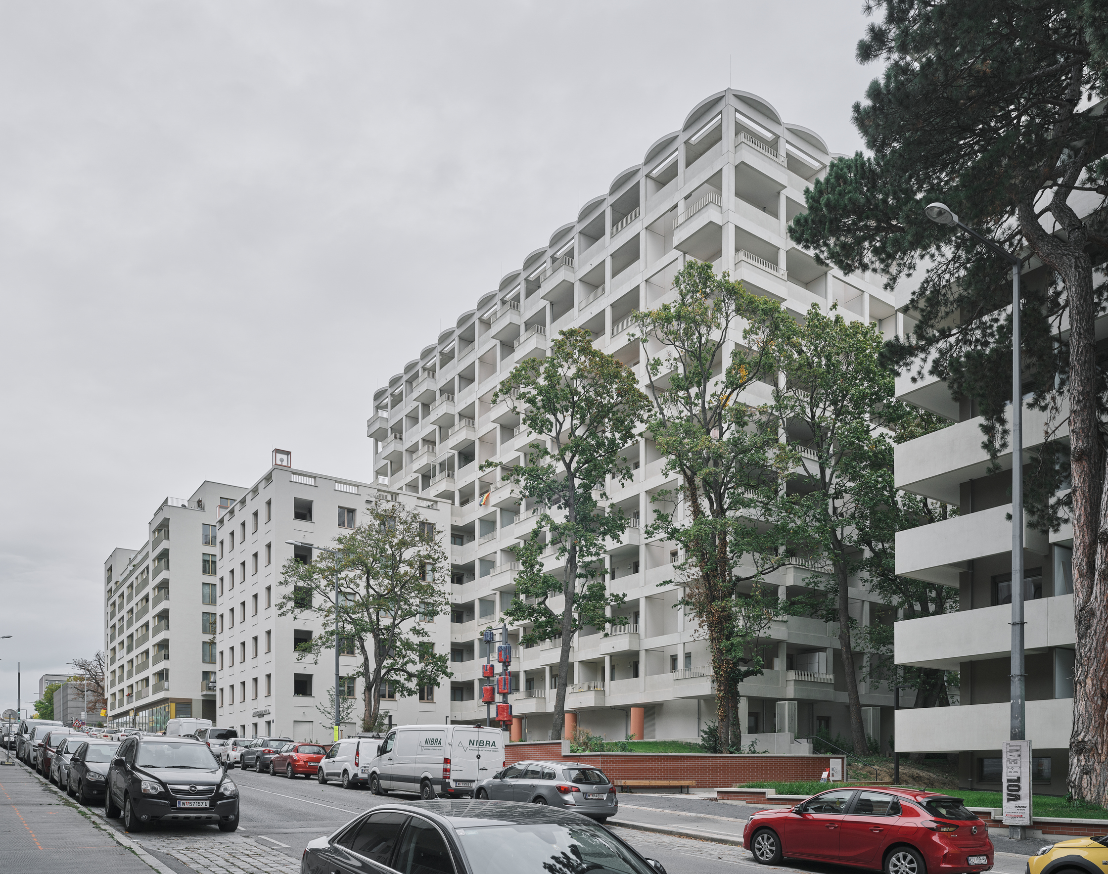 »Der große Vorteil der Fertigteilbauweise offenbart sich in den Details«, sagt Projektleiter Troppan. »Denn mit einer Bauteilstärke von nur 11 cm schaffen wir Betonbrüstungen in Rekordschlankheit.« Hinzu kommt, dass es die Norm und die Richtlinien bei Fertigbauweise aufgrund der hohen Fertigungsqualität erlauben, bei Vorsprüngen, Balkonüberdachungen und horizontalen Parapetabschlüssen auf eine Verblechung sowie auf die Abdichtungen zu verzichten, die bei Ortbetonbauweise notwendig gewesen wären. Dies kommt v. a. dem poetischen Attikaabschluss über dem zehnten Stockwerk zugute: Ohne Blech und ohne jeden Schnickschnack ragen die dicken Kreissegmente über die Fassade und schenken dem Haus ein subtiles Krönchen. Ein wenig erinnert die Formalität an eine Tortenunterlage oder an Omas gehäkeltes Spitzendeckchen. So viel Süß, bei all der Strenge, das Schmunzeln ist nicht zu unterdrücken.