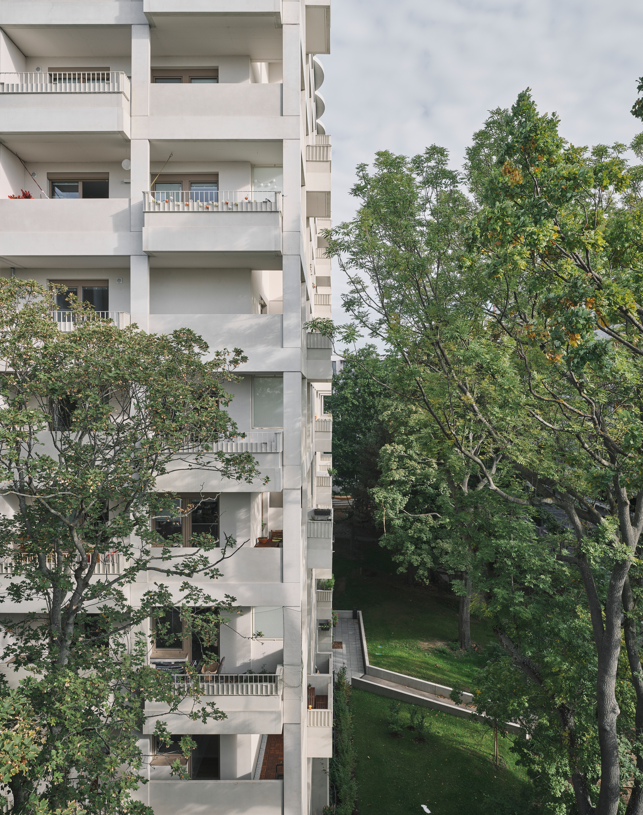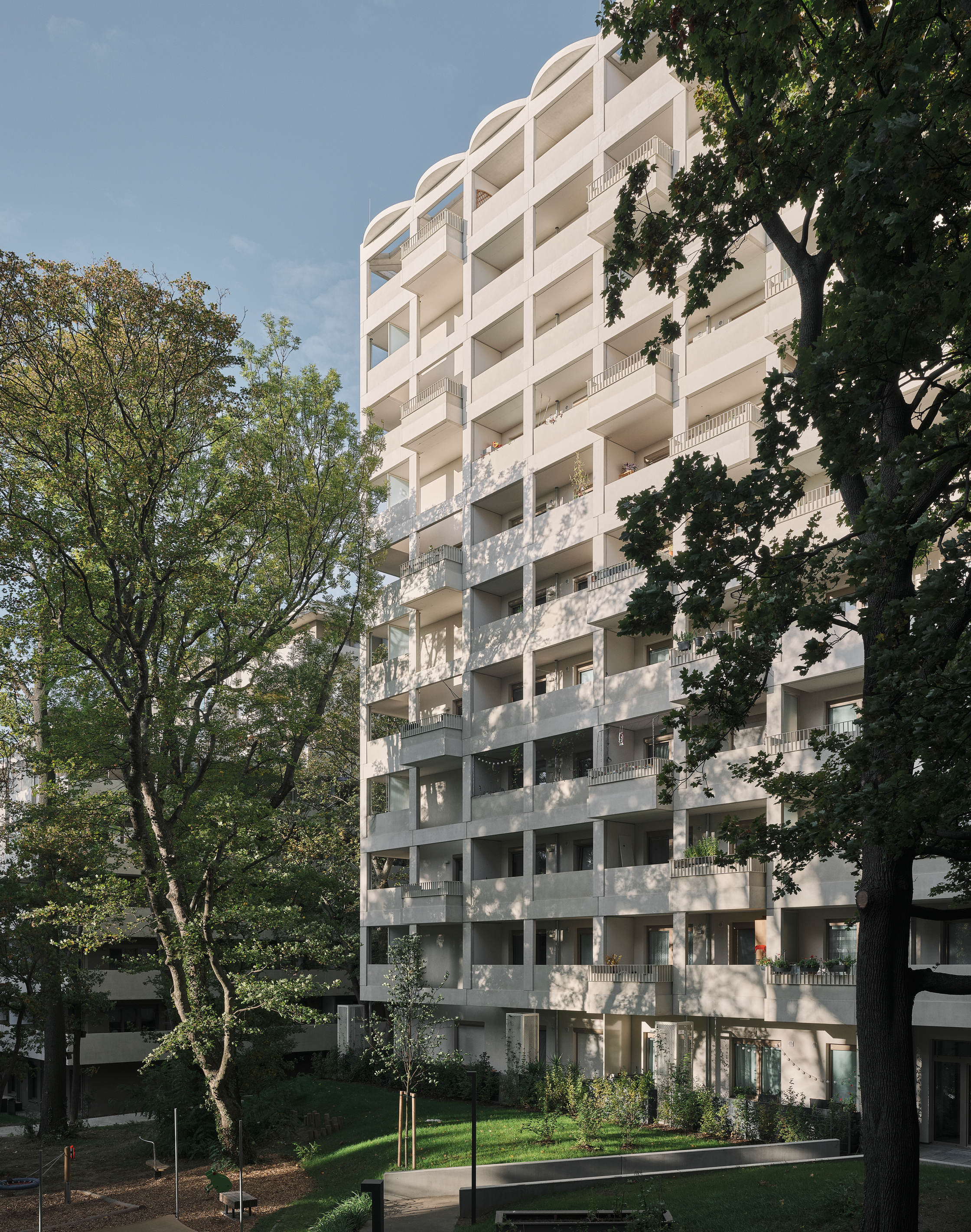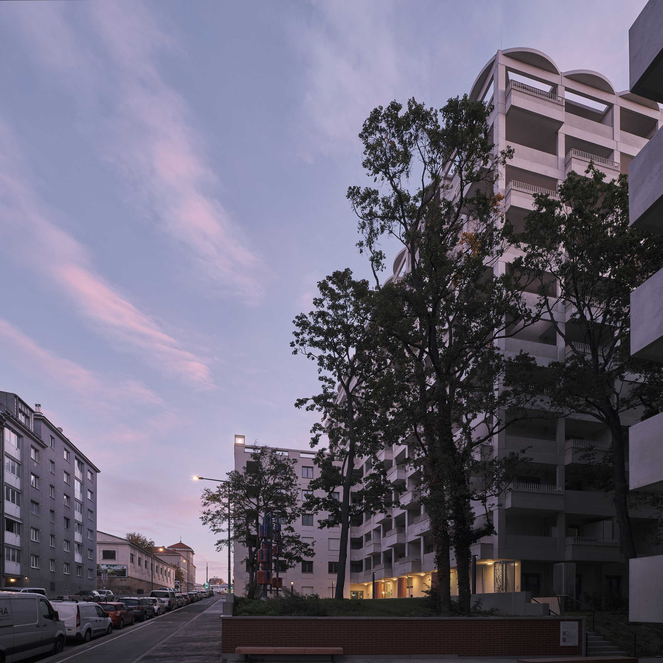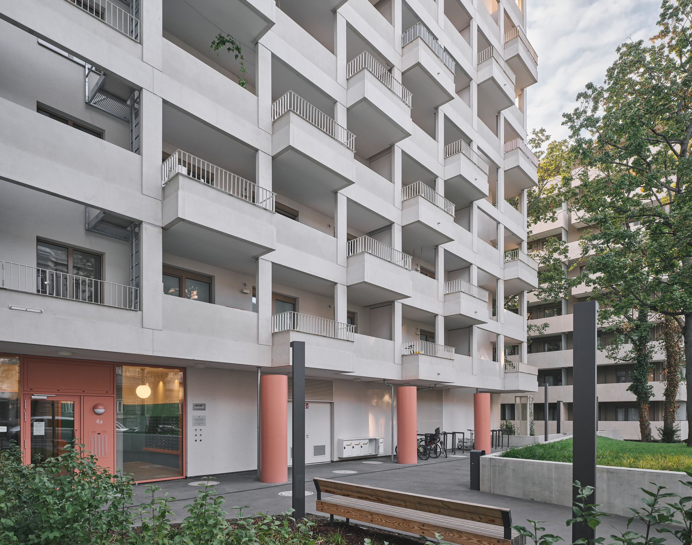 Und der Anspruch an die Hauptrolle ist mehr als ernst gemeint: Auf Basis eines städtebaulichen Wettbewerbs 2016 und des siegreichen Masterplans von driendl*architects wurde die Bebauung mit knapp 1 000 geförderten und frei finanzierten Wohnungen an die Ränder des 4,1 ha großen Areals gedrängt – in Form von kompakten, bis zu 12-geschossigen Baukörpern. Auf diese Weise konnte der Park mit seinen bis zu 20 m hohen Platanen zum überwiegenden Teil erhalten bleiben. Nachdem die Baustelle fertiggestellt und die Kräne wieder abgebaut waren, hat die Fauna mit Vögeln und Fledermäusen ihren Weg wieder zurückgefunden. Ab und zu, sagen die hier wohnenden Leute, seien auch schon Habichte gesichtet worden.