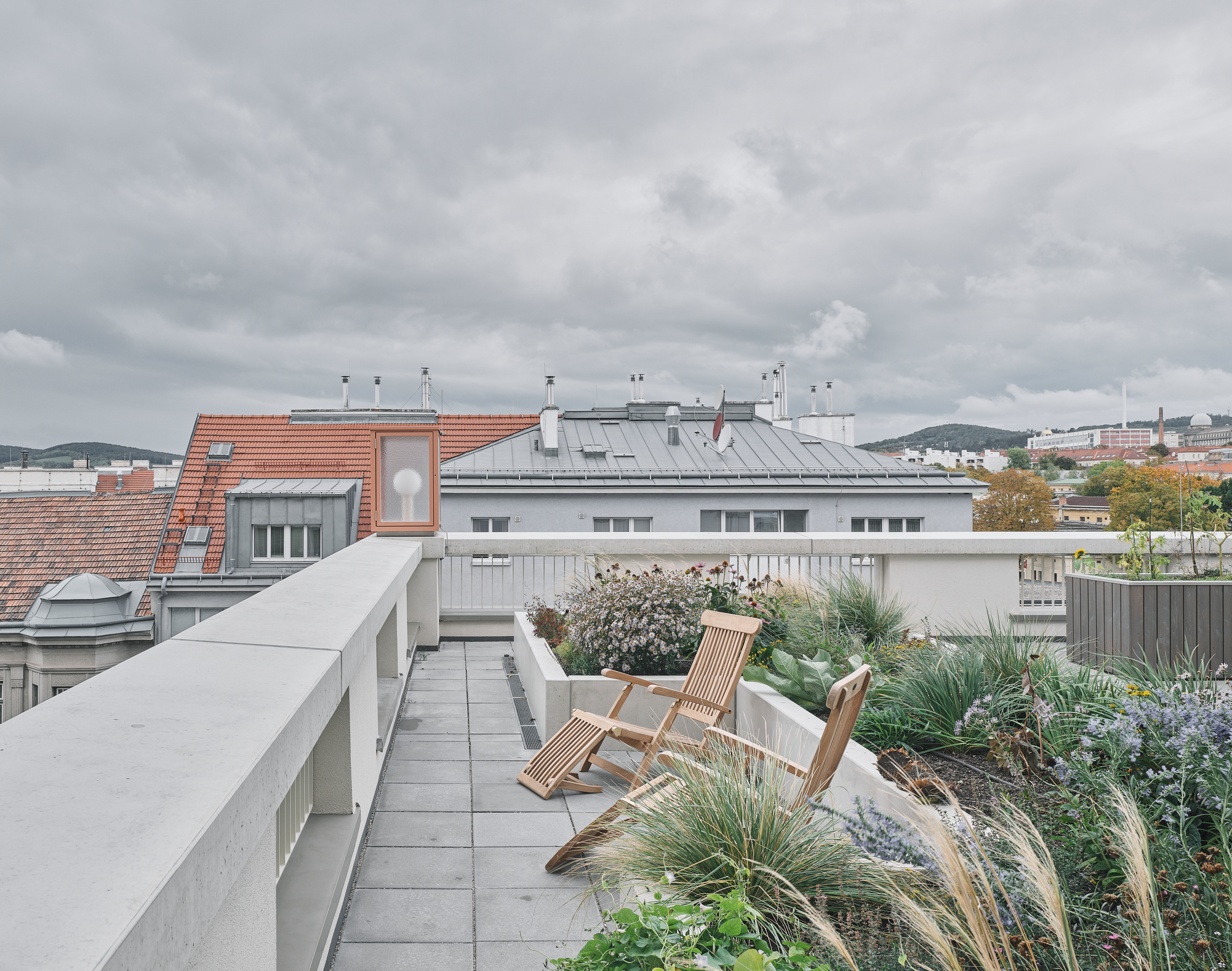 »Das ist ein wirklich schönes Wohnen hier, und am meisten gefällt mir«, sagt Stephan Gruber, »dass einem dieses Haus bei allem Kostendruck, dem der geförderte Wohnbau natürlich unterliegt, dennoch mit Schönheit und Respekt begegnet.« Gruber sitzt mit seiner Familie und seinen Nachbarn und Nachbarinnen auf der Dachterrasse im sechsten Stock, auf dem etwas niedrigeren Bauteil, der dem hohen Balkonturm wie ein kleines, kompaktes Stadthaus vorgelagert ist. Was für eine Aussicht, am Horizont die Otto-Wagner-Kirche am Steinhof.