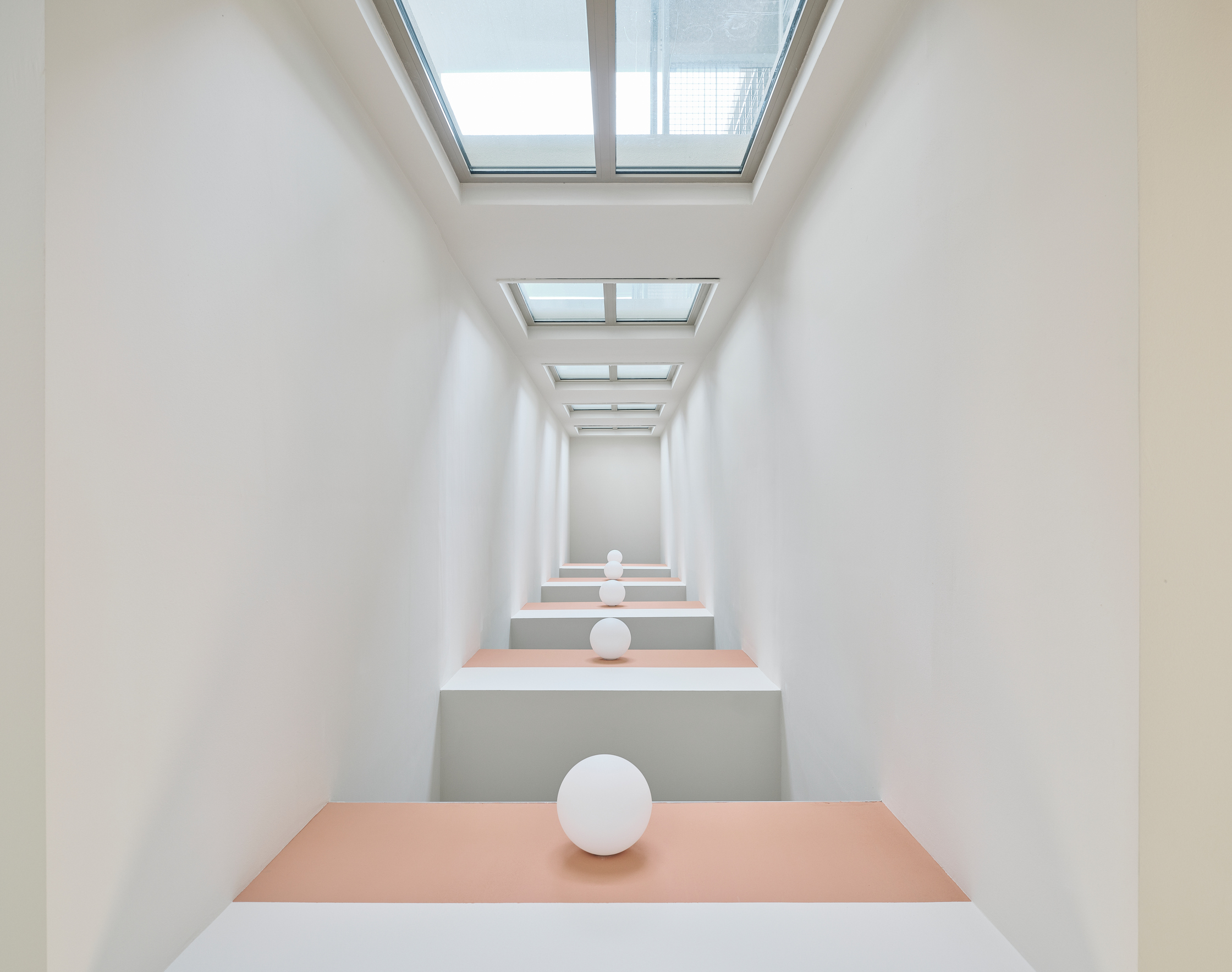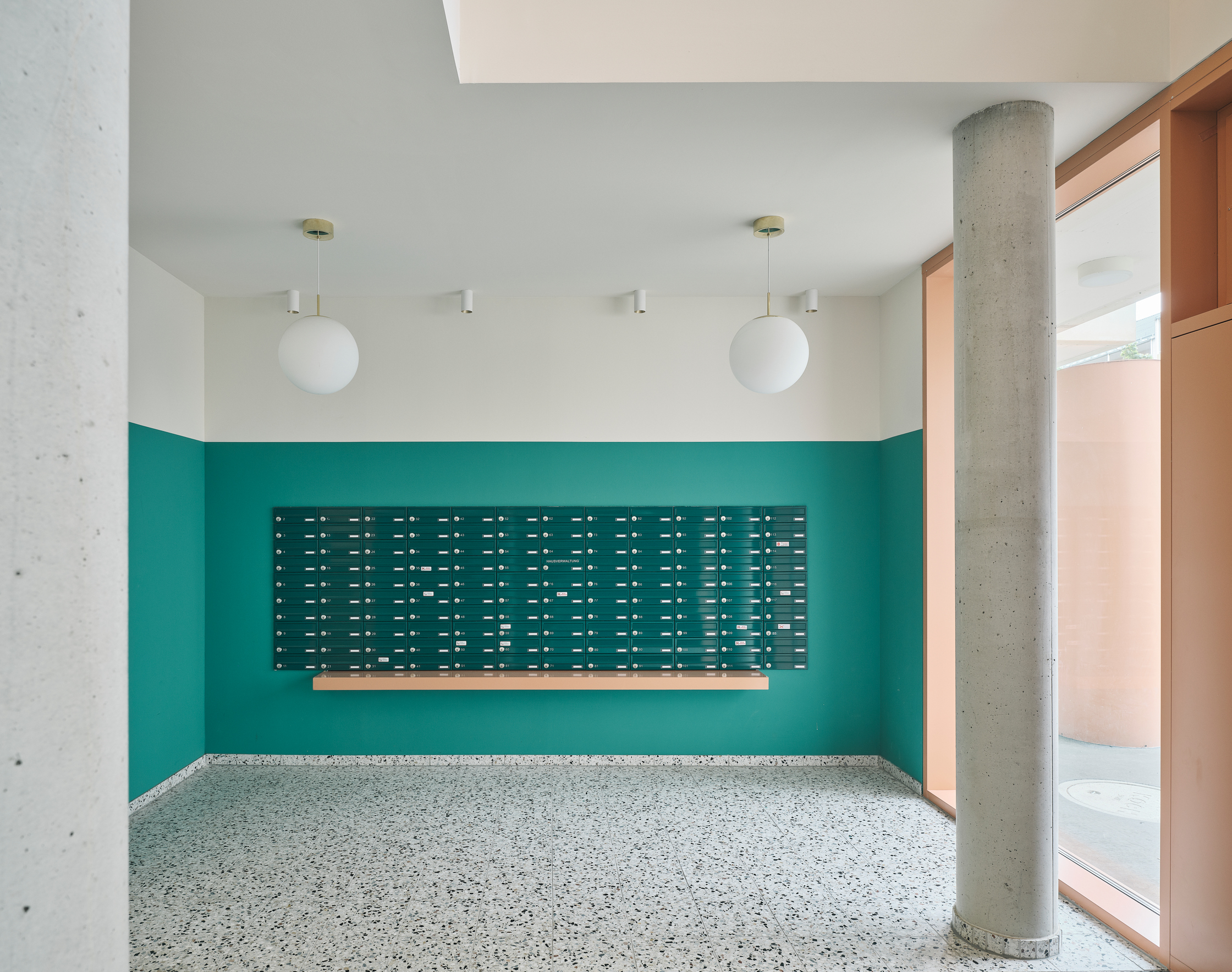 »All das«, meint Troppan, »hat in unseren Entwurf mit hineingespielt. Daher haben wir uns entschieden, das Haus in seiner Außenerscheinung farblich zurückzunehmen.« Während im Eingangsbereich und in den Treppenhäusern ein pastelliges Beigerot (RAL 3012) und ein kräftiges Opalgrün (RAL 6026) dominieren, präsentiert sich die Fassade mit ihrer dreidimensionalen Balkonmatrix in nacktem Sichtbeton mit Weißzement-Zuschlag. Lediglich die mal glatten, mal sandgestrahlten Oberflächen und die um 3 cm vor- und rückspringenden Betonfertigteile verleihen dem vermeintlich einheitlichen Hellgrau eine plastische, lebendige Schattierung.