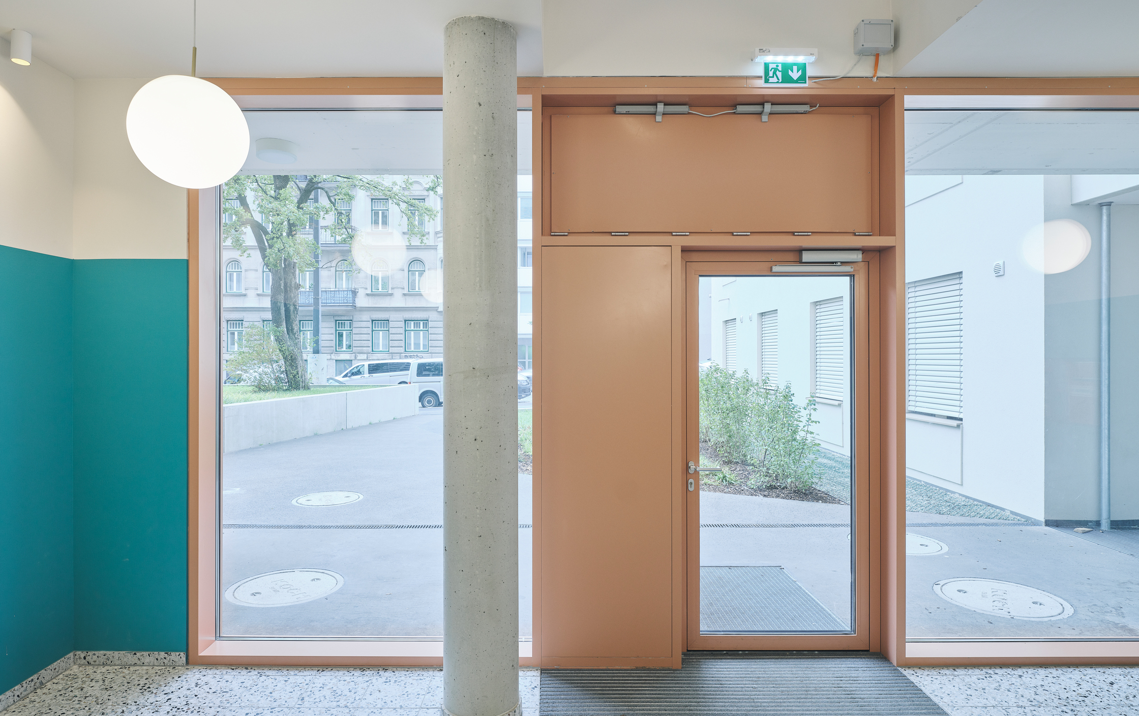 Insgesamt umfasst das Gebäude 115 Wohnungen mit Mittelgang-Erschließung, wobei jeweils ein Fenster bei der Liftgruppe und eines an einem Ende des Korridors für natürliche Belichtung in den halböffentlichen Bereichen sorgt. Im Geschäftslokal im EG, in dem ursprünglich ein Nahversorger geplant war, hat sich eine Augenklinik eingemietet. Nebenan gibt es einen Fahrrad- und Kinderwagen-Abstellraum sowie einen Kinderspielraum, von dem man in anderen Wohnhäusern nur träumen kann – hier gibt es Holzpuppenhäuser, Matratzenhöhle und sogar eine Kletterwand. Über eine riesige Glasscheibe gibt es eine Sichtverbindung in die angrenzende Waschküche. Damit ist die Rosalie – außen wie innen – ohne jeden Zweifel einer der aktuell sympathischsten Sozialwohnbauten Wiens.