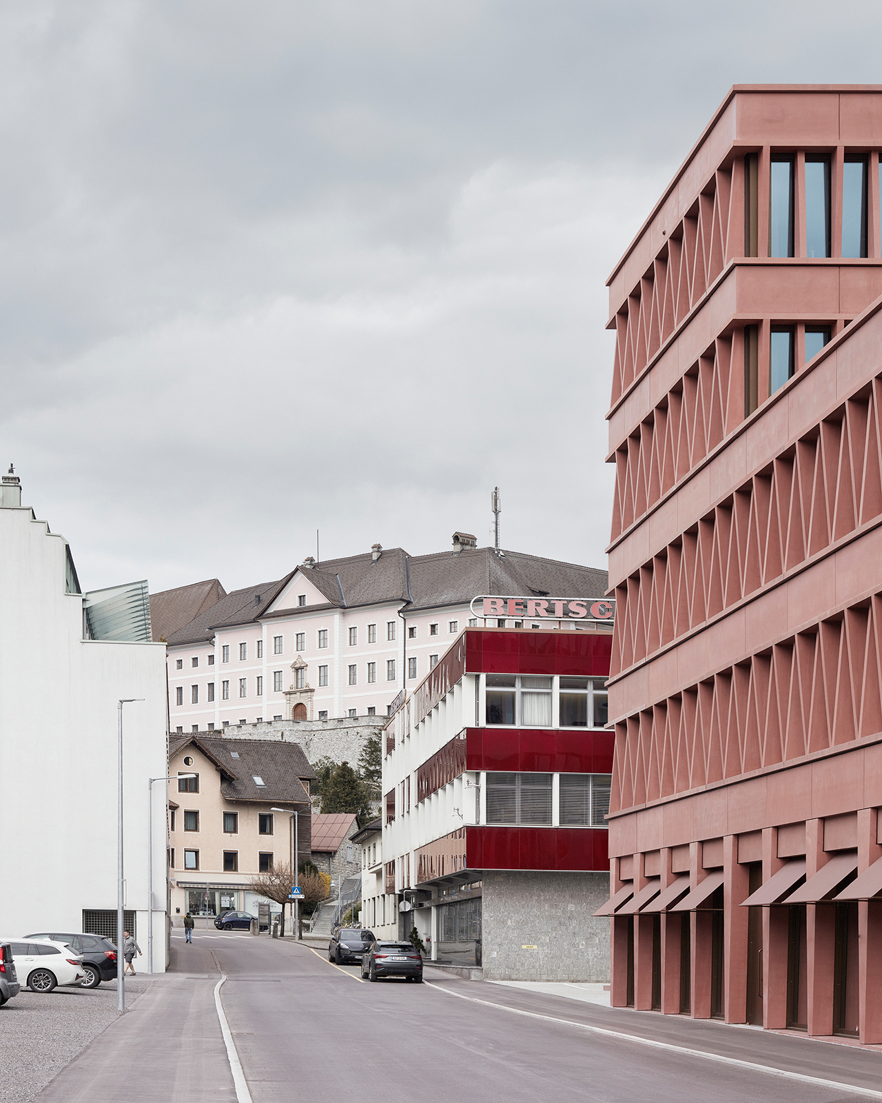 Doch der Reihe nach. Schauplatz dieser Geschichte ist die im Süden Vorarlbergs gelegene Bezirkshauptstadt Bludenz. Der Ort hat rund 16 000 Einwohner:innen, bildet das Zentrum von fünf umliegenden Alpentälern und gehört dem Tourismusverband der »Kleinen Historischen Städte« Österreichs an, die sich dadurch auszeichnen, dass sie ein geschlossenes, historisches Stadtbild mit zahlreichen Sehenswürdigkeiten aufweisen. Zu den schönsten Baudenkmälern in Bludenz zählt die barocke St.-Laurentiuskirche, die über der Altstadt auf einem Felsvorsprung thront. Zu ihren Füßen verläuft die Herrengasse, die, nachdem sie das historische Stadtzentrum in südöstlicher Richtung durchquert hat, in ein vorstädtisches Wohngebiet führt. Zwischen Kern- und Vorstadt liegt ein von mehrgeschossigen Geschäftsbauten geprägter Straßenabschnitt. Eins dieser Gebäude ist der auf dem Areal des ehemaligen Viehmarkts errichtete, im Januar 2023 fertiggestellte Jägerbau.