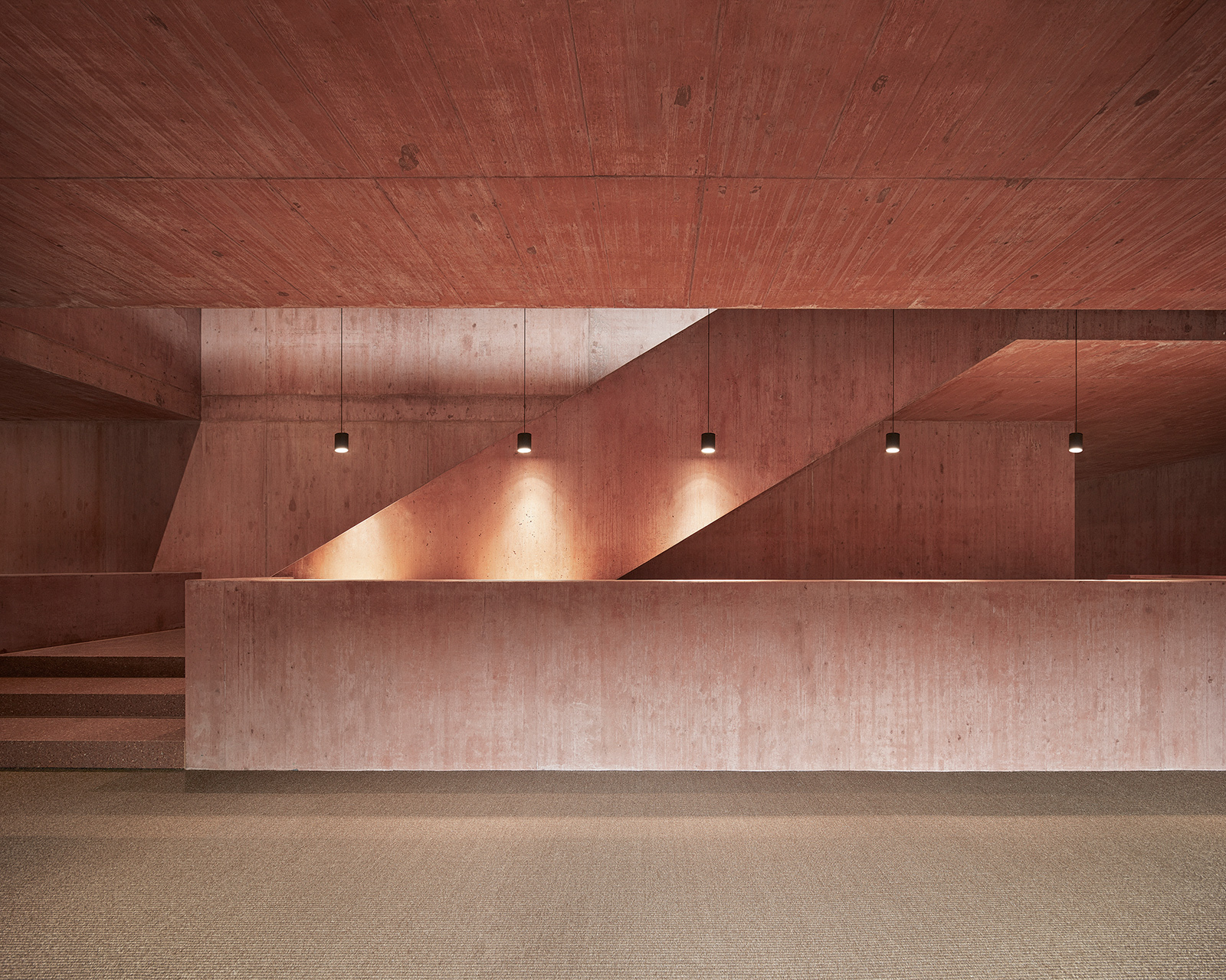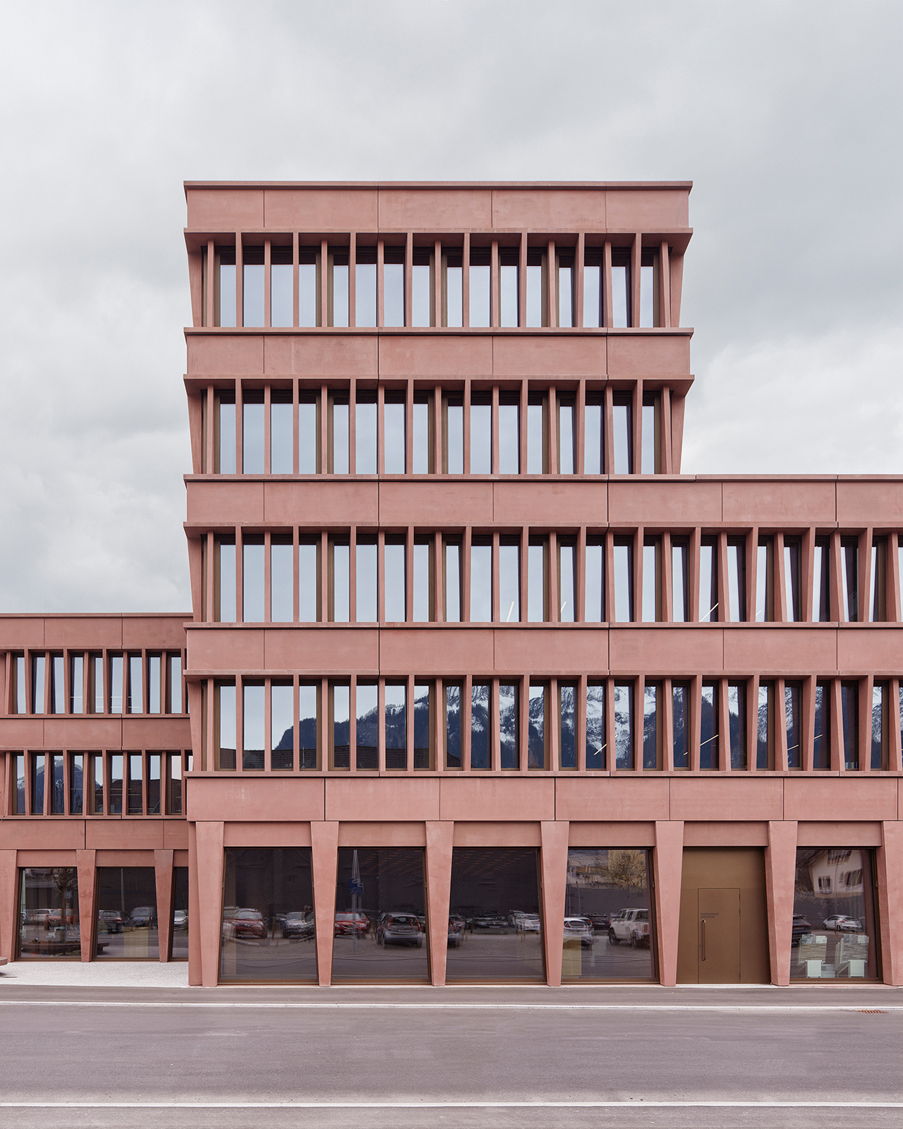 Außen und innen prägt rötlicher Sichtbeton die neue Zentrale des Vorarlberger Unternehmens Jäger Bau. Doch das monochrome Bauwerk in Bludenz wirkt alles andere als monoton. Kubatur, Fassade und Interieur setzen grandiose Kontrapunkte zum farblichen Gleichklang.