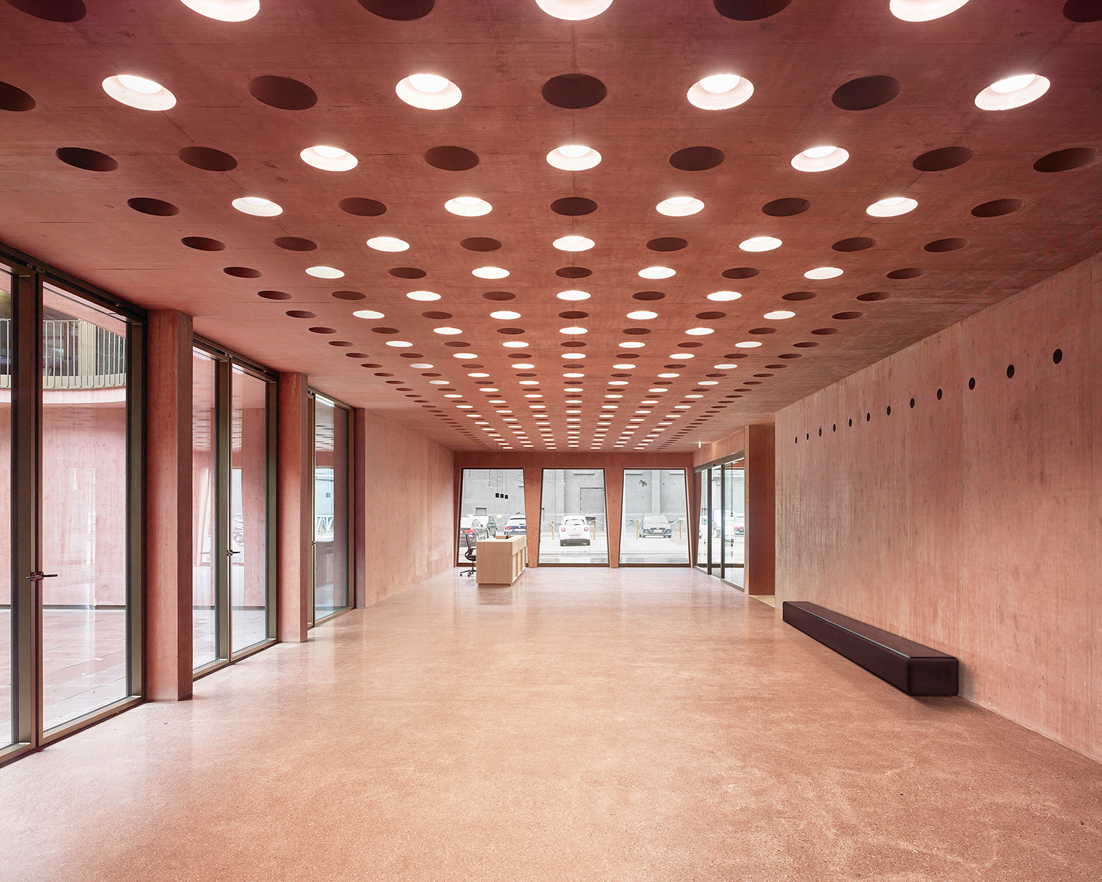 Nicht zuletzt ist die Firmenzentrale ein gebautes Zeichen, das der Imagebildung und der Kommunikation der Unternehmensidentität dienen soll. Als Baufirma legte man deshalb großen Wert darauf, die eigenen Kompetenzen für alle Mitarbeitenden und Besucher:innen sicht- und erlebbar zu machen. Das Versprechen qualitätvollen Bauens, das die Firma ihrer Kundschaft gibt, ist im Gebäude tatsächlich überall spürbar, so etwa im Foyer mit seiner von über 300 Betonaussparungen strukturierten Decke oder im Innenhof mit seinen elegant gerundeten Geschossdecken. Auch draußen ist es der rötliche Sichtbeton der Betonfertigteilfassade und Tragstruktur, der die handwerklichen Fertigkeiten der Firma Jäger Bau anschaulich werden lässt.