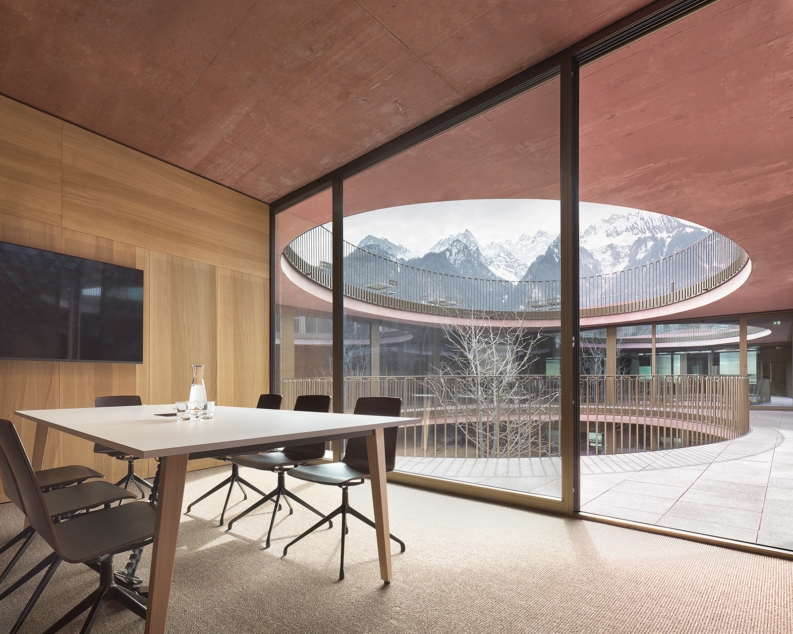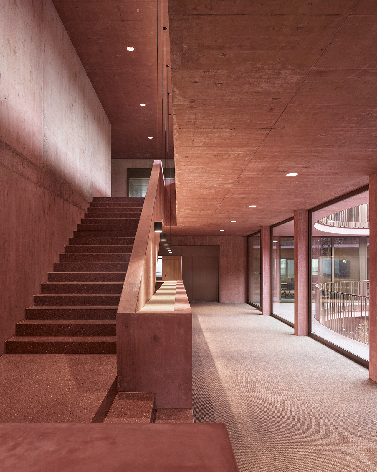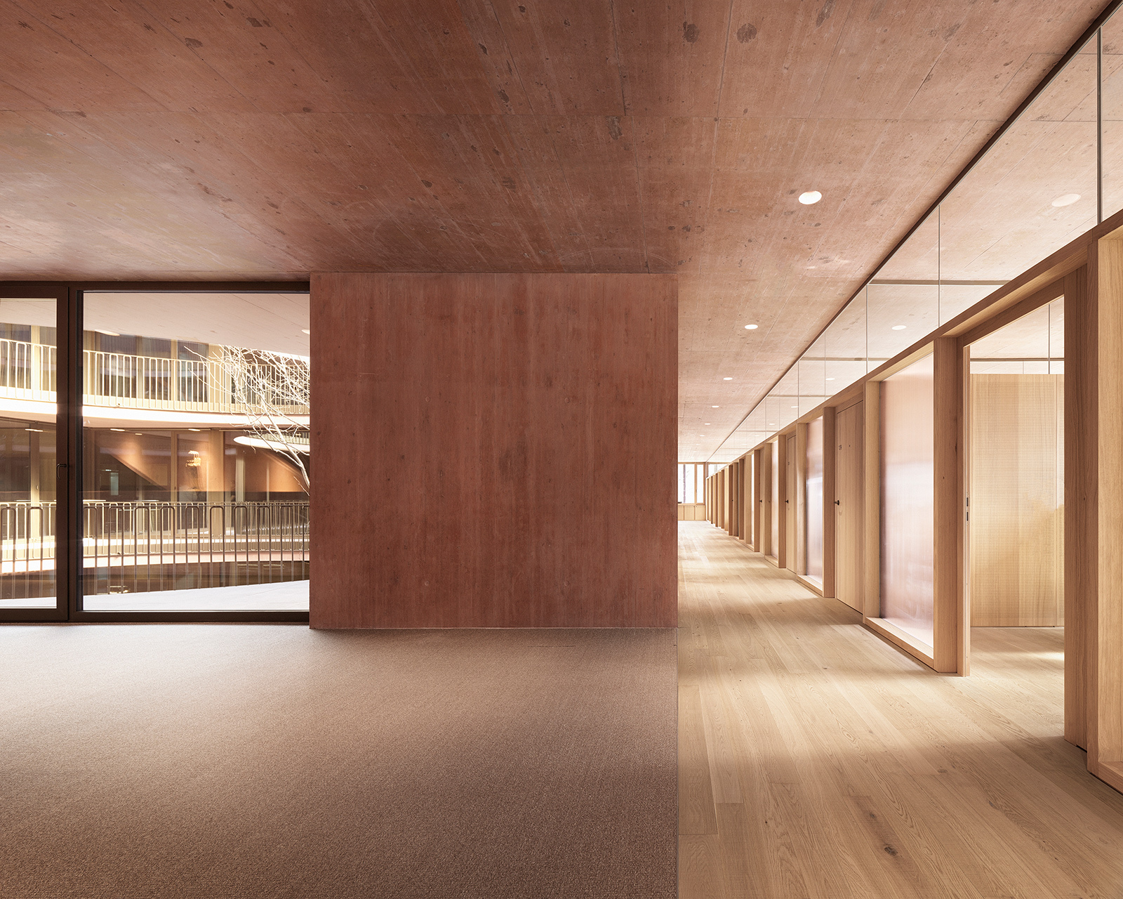 Zwar ist der rötliche Sichtbeton auch im Inneren des »Edelrohbaus« allgegenwärtig, doch dort kontrastiert er immer wieder mit anderen Stoffen und Farben, so etwa mit hellen Eichendielen, roten Terrazzoböden, braunen Naturfaserteppichen und messingfarben lackierten Metallgeländern. Nicht zuletzt dank der feinen, exzellent verarbeiteten Materialien fühlt man sich im Jägerbau vielerorts wie in einem modernen Museum oder einem vornehmen Bankhaus. Doch mehr noch als jede raumbegrenzende Fläche ist es eine einzige raumbildende Form, die den Blick im Gebäudeinneren beinahe von jedem Standort aus auf sich zieht: Der ellipsenförmige, von Balkonen gesäumte Innenhof im Zentrum des Gebäudes ist sein lebendiges Herz und architektonisches Highlight. Im EG öffnet sich das weitläufige Foyer, das auch als Veranstaltungssaal dient, mit raumhohen Glastüren auf diesen Hof. Im ersten und zweiten OG, wo sich die Bürozonen entlang der Außenwände erstrecken, sind die Besprechungszimmer, Teeküchen und Aufenthaltsbereiche direkt dem Hof zugeordnet.