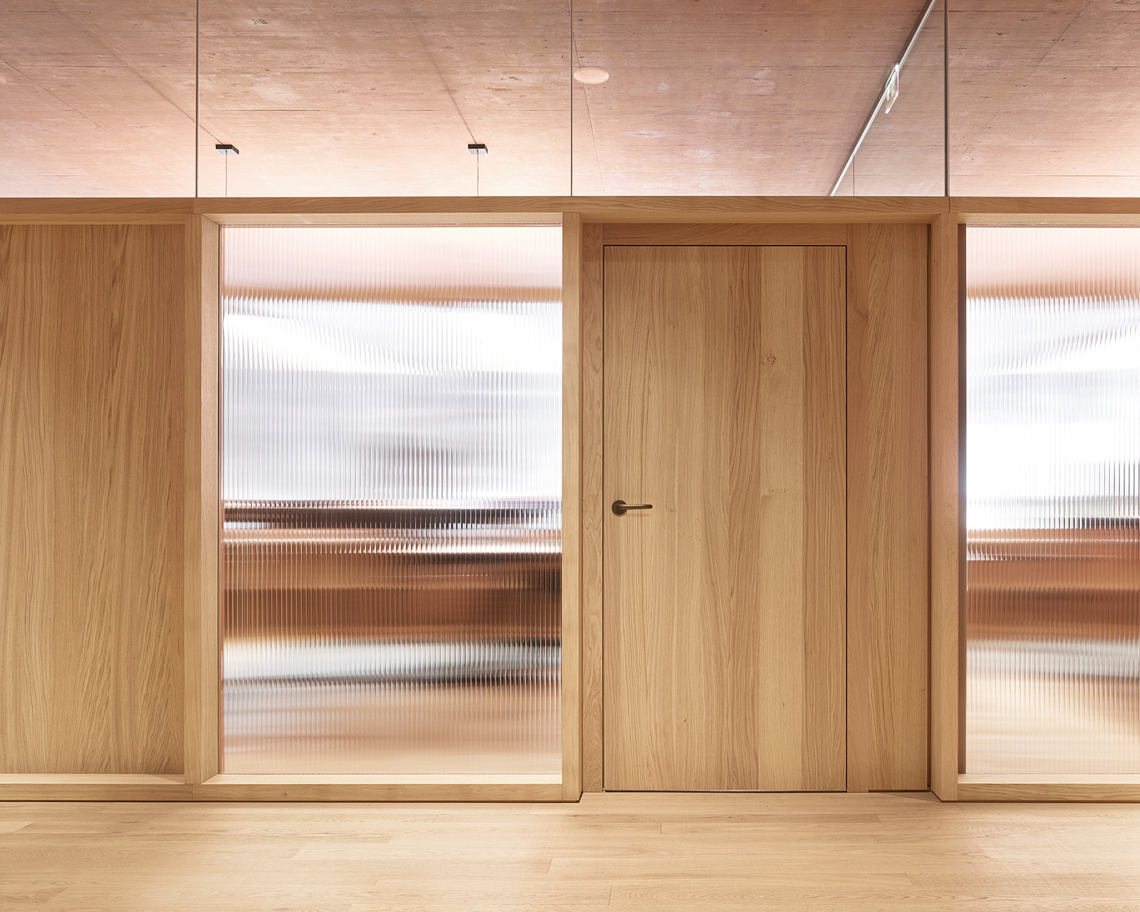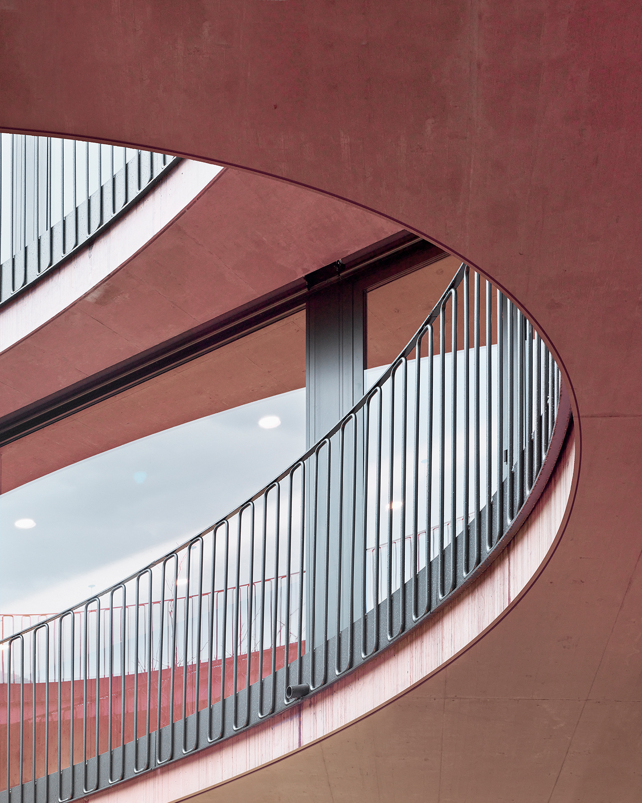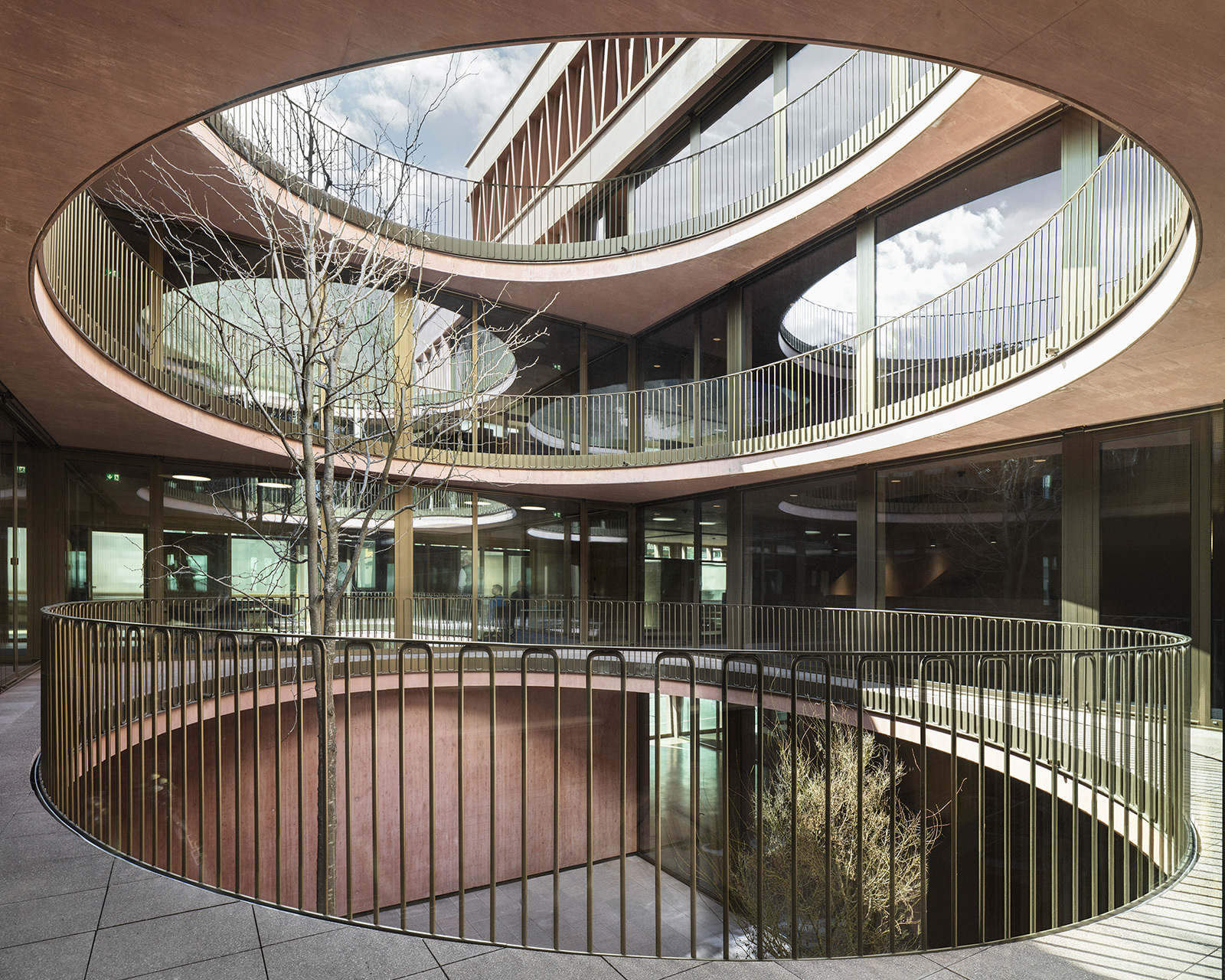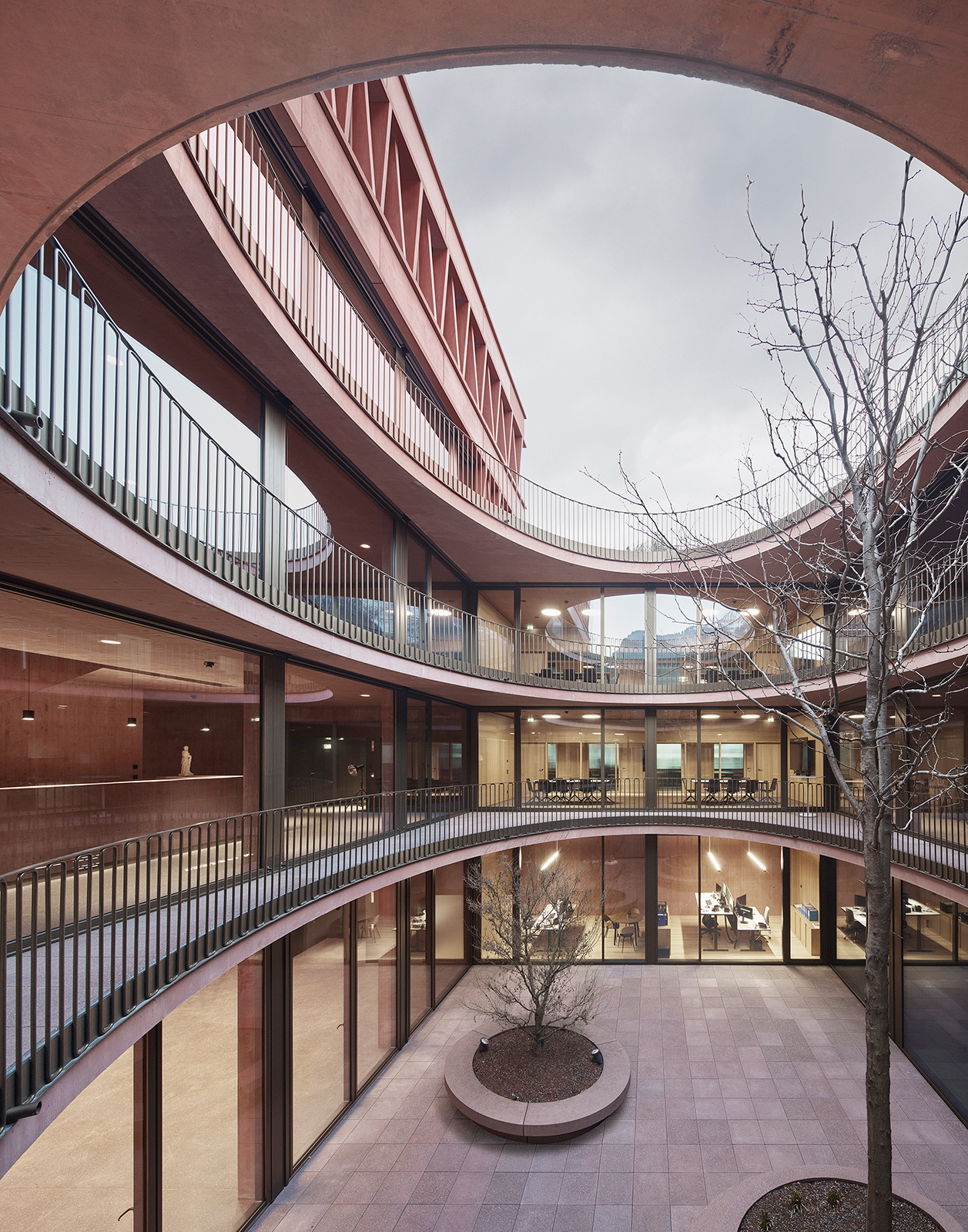 Zwar ist der rötliche Sichtbeton auch im Inneren des »Edelrohbaus« allgegenwärtig, doch dort kontrastiert er immer wieder mit anderen Stoffen und Farben, so etwa mit hellen Eichendielen, roten Terrazzoböden, braunen Naturfaserteppichen und messingfarben lackierten Metallgeländern. Nicht zuletzt dank der feinen, exzellent verarbeiteten Materialien fühlt man sich im Jägerbau vielerorts wie in einem modernen Museum oder einem vornehmen Bankhaus. Doch mehr noch als jede raumbegrenzende Fläche ist es eine einzige raumbildende Form, die den Blick im Gebäudeinneren beinahe von jedem Standort aus auf sich zieht: Der ellipsenförmige, von Balkonen gesäumte Innenhof im Zentrum des Gebäudes ist sein lebendiges Herz und architektonisches Highlight. Im EG öffnet sich das weitläufige Foyer, das auch als Veranstaltungssaal dient, mit raumhohen Glastüren auf diesen Hof. Im ersten und zweiten OG, wo sich die Bürozonen entlang der Außenwände erstrecken, sind die Besprechungszimmer, Teeküchen und Aufenthaltsbereiche direkt dem Hof zugeordnet.