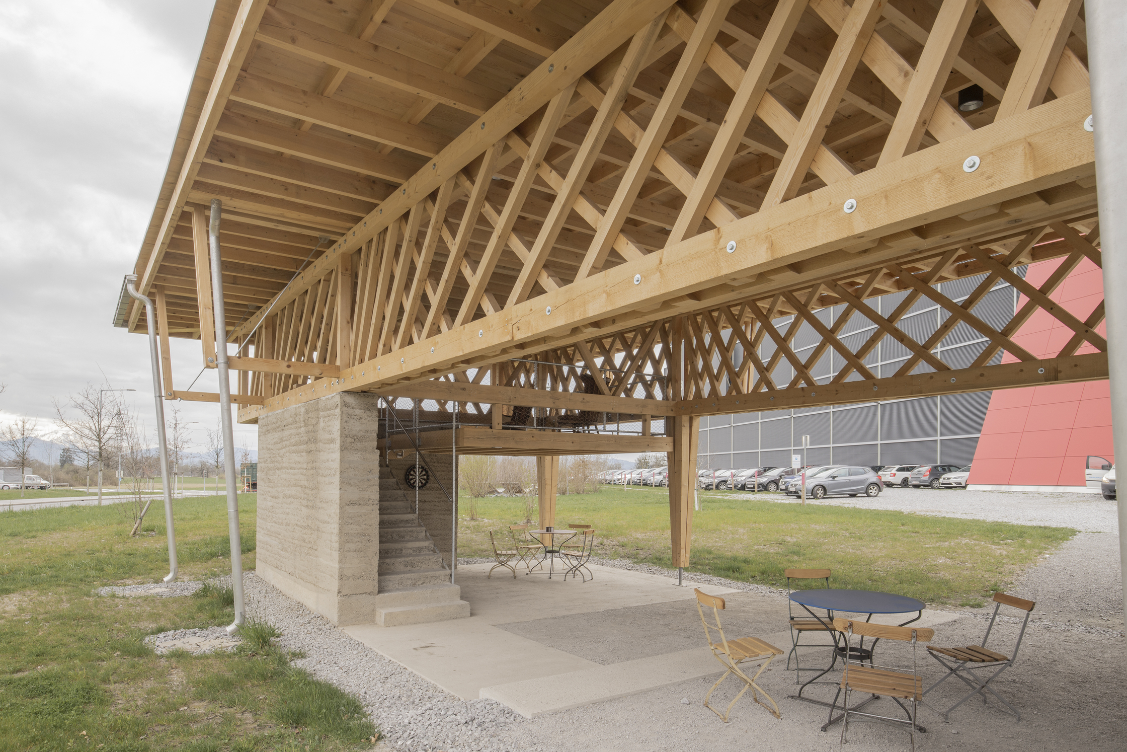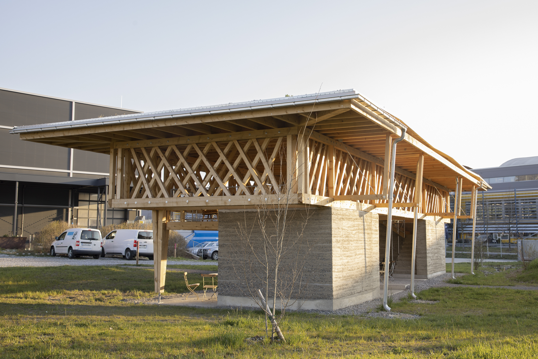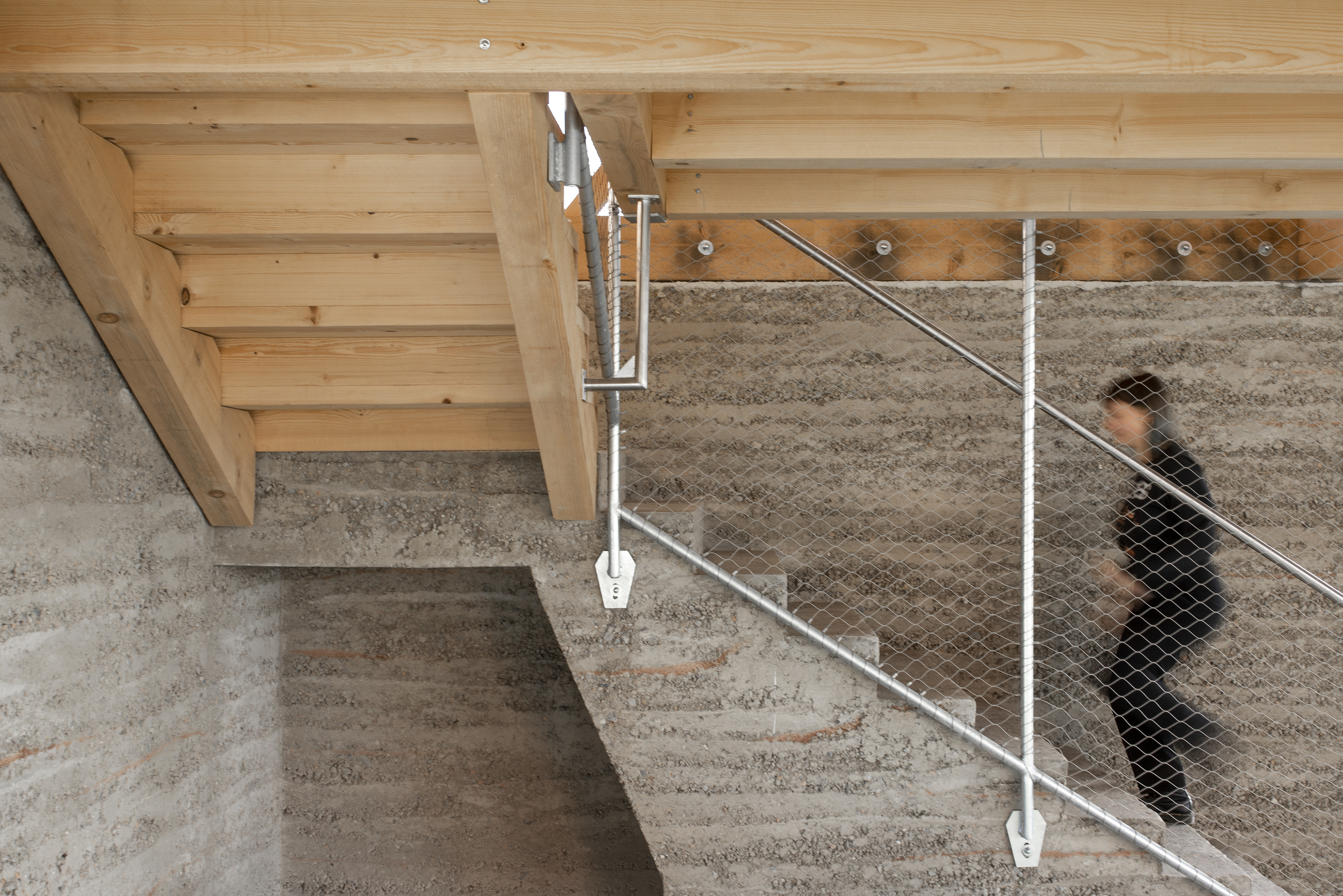Stampflehm kam als ressourcenschonendes, wiederverwertbares Material für die tragenden Wände zum Einsatz.