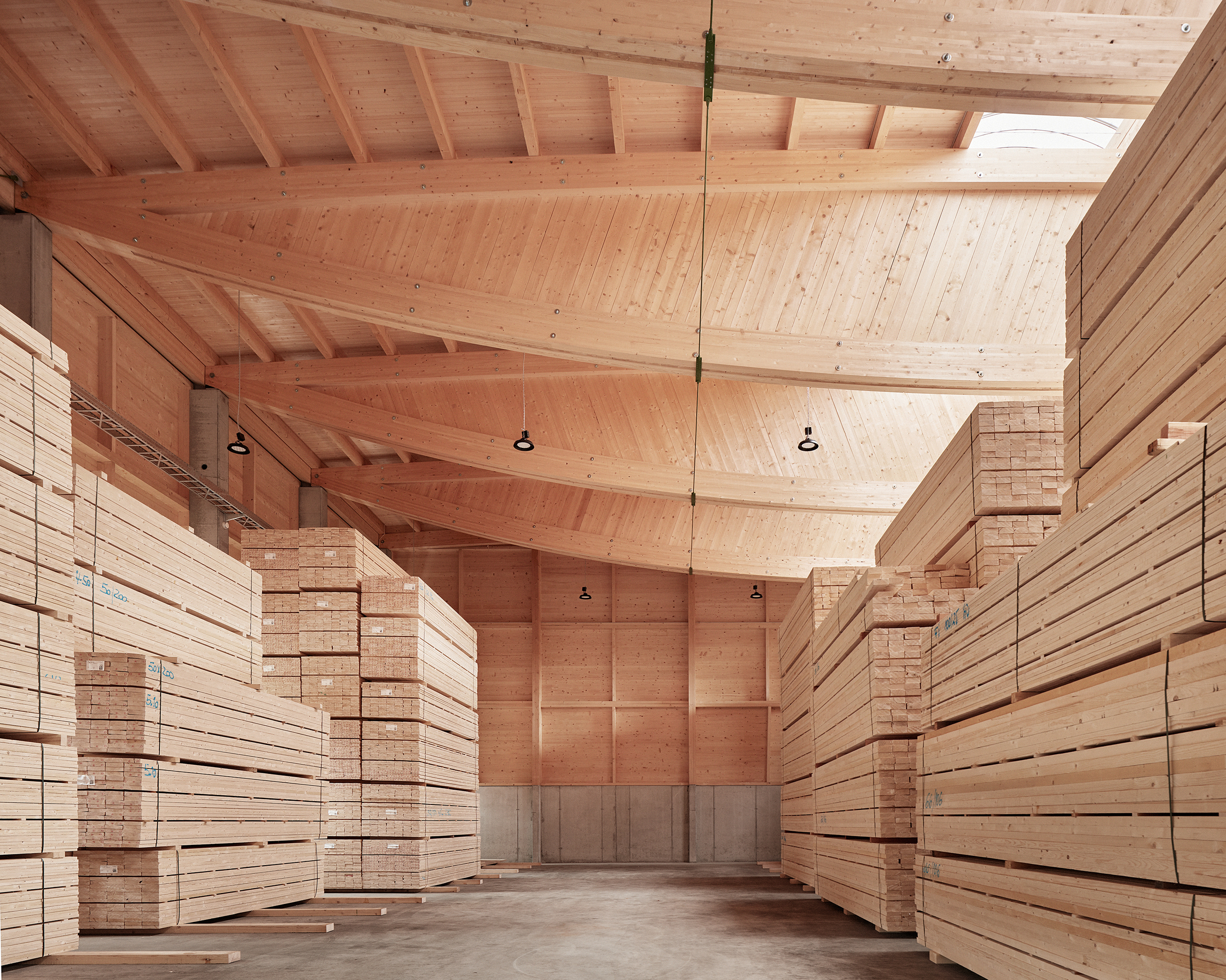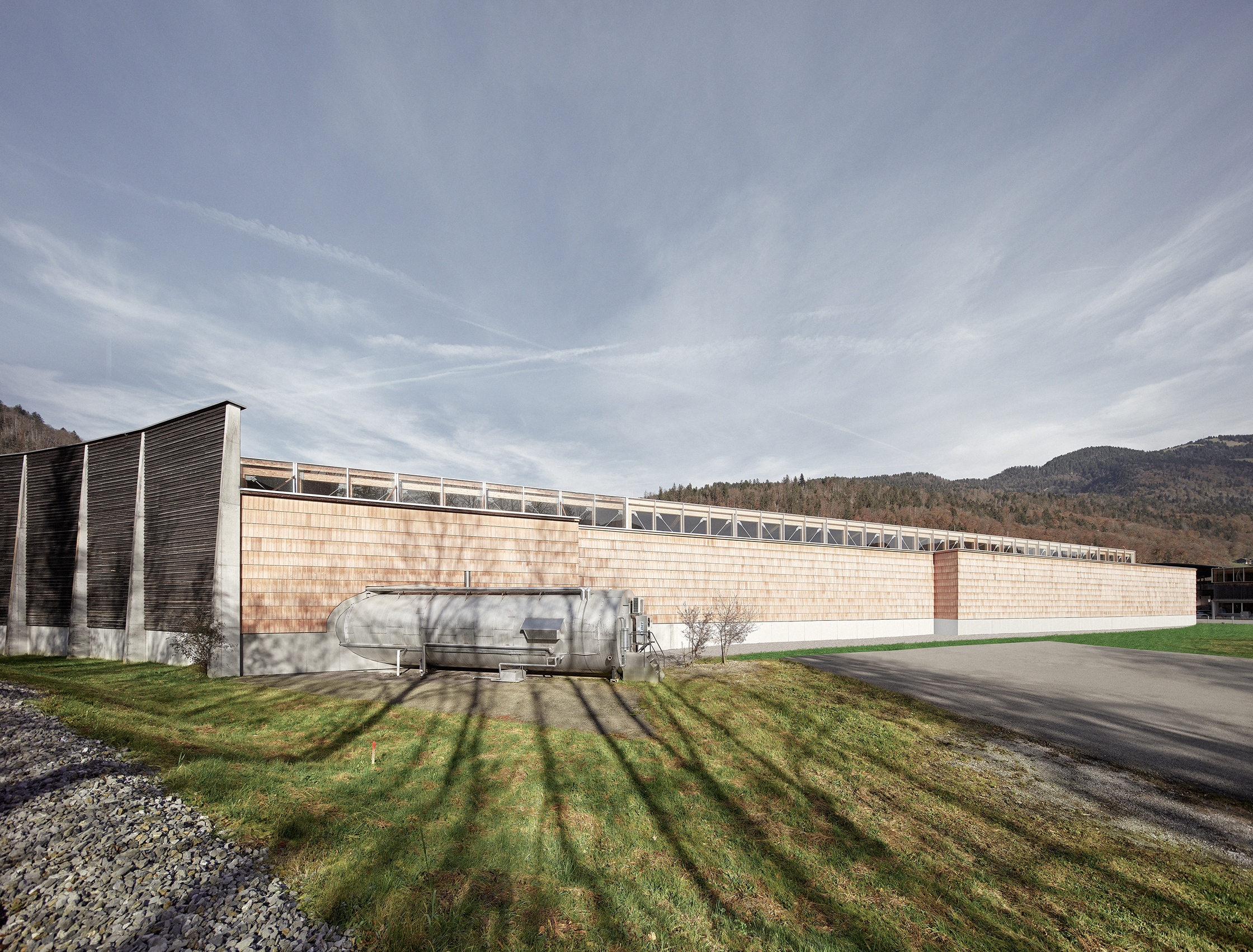 Auf der vorhandenen Geländesohle des bestehenden Betriebsareals wurde der südliche Flugdachbaukörper, samt begleitender Schallschutzwand, für Lagerzwecke und zur Abschirmung der Nachbarn Richtung Osten verlängert. Am neuen zentralen Eingangshof liegen am Kopf der bestehenden geschlossenen Halle der Verwaltungstrakt mit den Aufenthaltsbereichen und Toilettenanlagen der Mitarbeiter sowie die neue straßenbegleitende Produktionshalle mit Umstapelungsanlage. Die Neubaukubatur ist unbeheizt.