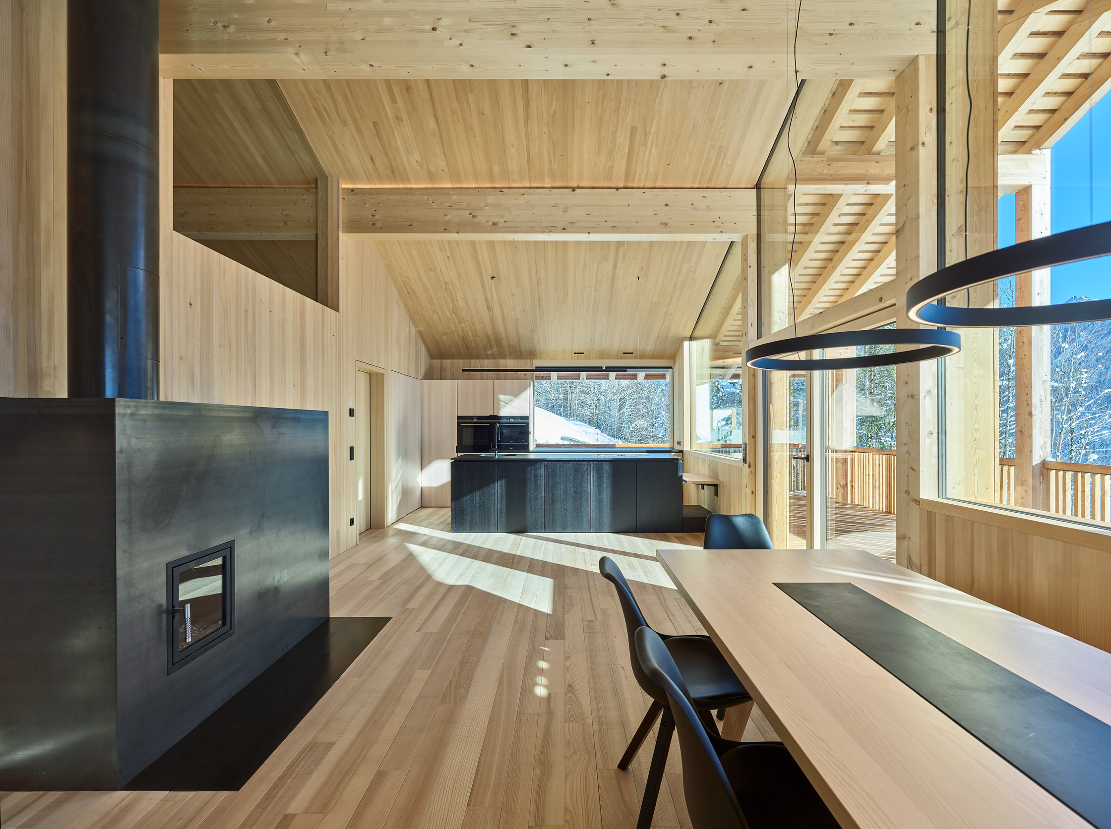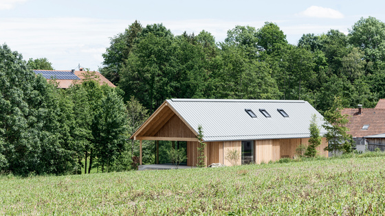 Verwendung von regionalem Holz. Nachhaltiges Haustechnikkonzept mit Wärmepumpe und PV-Anlage.