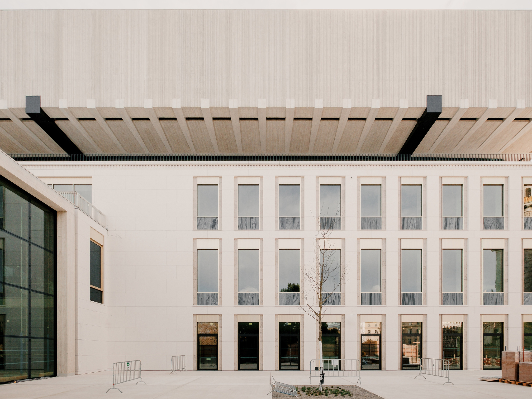 Die Respektsbekundungen vor Haerdtl waren glaubhaft, und das zeigt sich jetzt im Ergebnis – vor allem in der Arbeit mit dem Material. Die alt-neue Fassade beantwortet die Frage, wie viel Originalsubstanz in einem Denkmal stecken muss, wohlüberlegt. Die in den 1980er-Jahren ersetzten Steinplatten wurden durch hellen Kalkstein ersetzt, der dem ursprünglichen Charakter nahekommt. Die Fenster-Trilogie aus Aluminium, grauem Kalkstein und blaugrauem Marmor wurde harmonisch-historisch abgestimmt, die denkmalgeschützte Stiege im Inneren elegant mit den heutigen Normen in Einklang gebracht, an sich eine Unmöglichkeit.