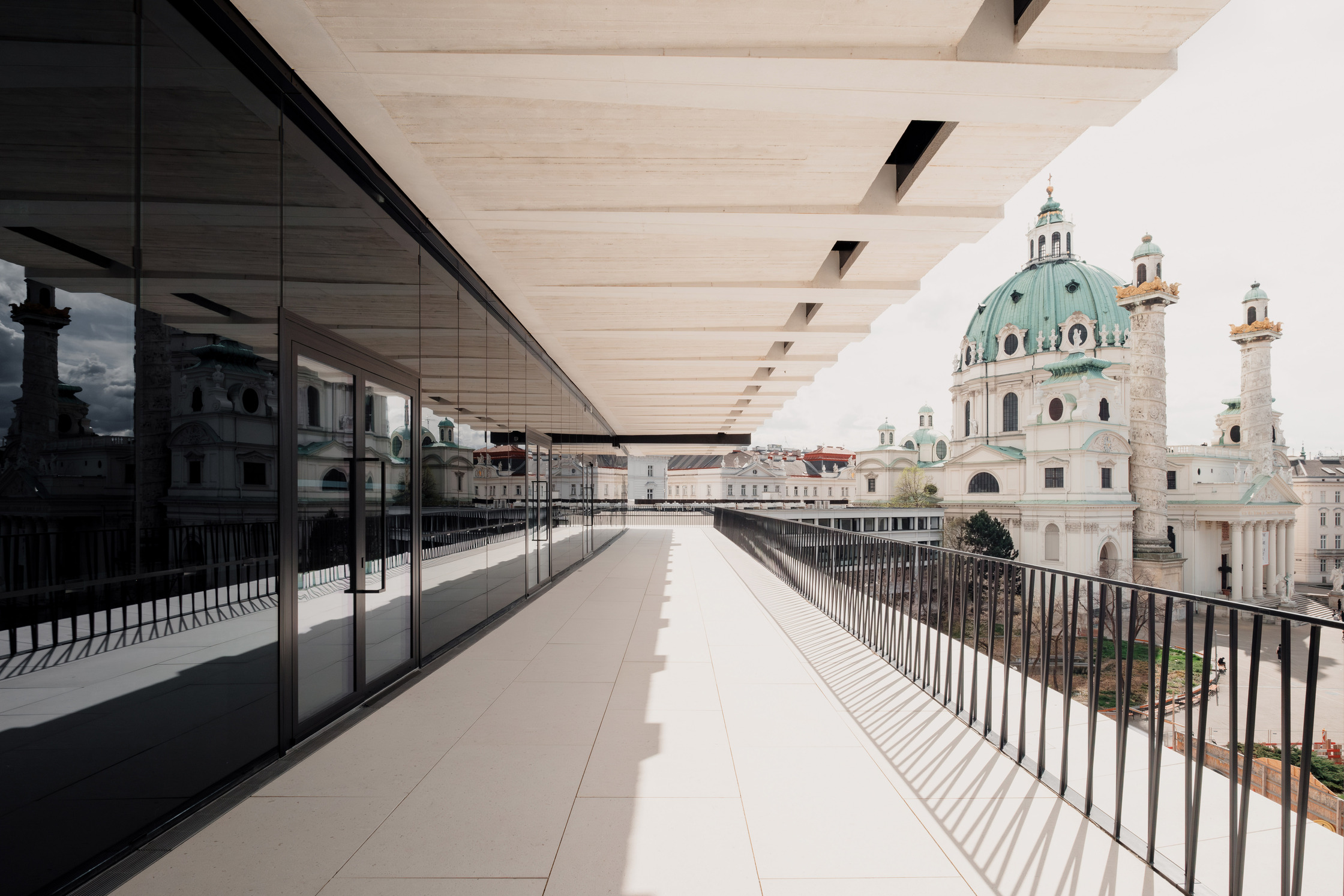 Während sich dieser Kubus ganz nach innen wendet, ist das darunterliegende verglaste Fugengeschoß das große Geschenk an die Wiener, denn von hier aus lässt sich die unklare Gegend namens Karlsplatz erstmals visuell erfassen. Selfies von hier werden künftig die sozialen Medien fluten, so viel ist sicher.