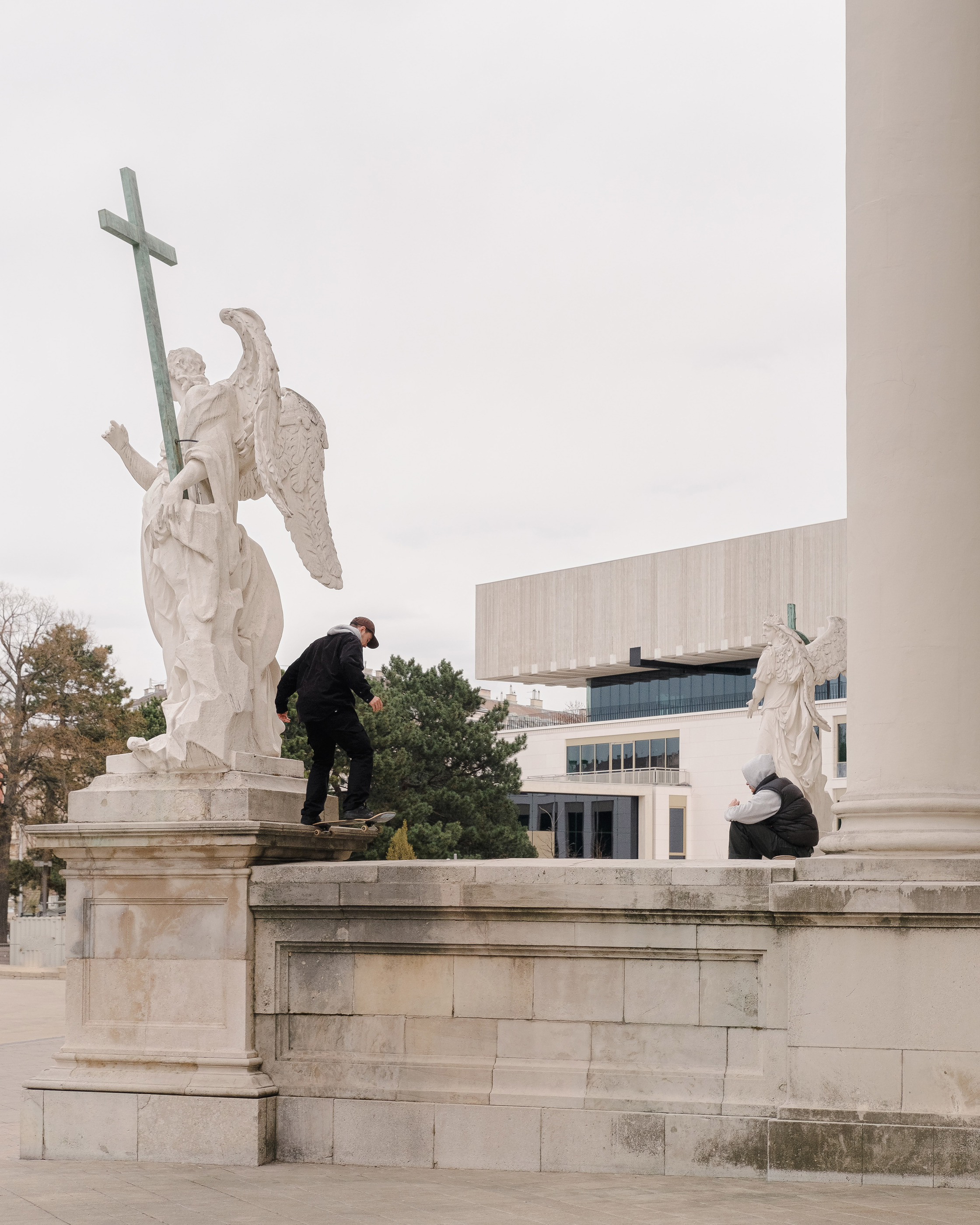 Während sich dieser Kubus ganz nach innen wendet, ist das darunterliegende verglaste Fugengeschoß das große Geschenk an die Wiener, denn von hier aus lässt sich die unklare Gegend namens Karlsplatz erstmals visuell erfassen. Selfies von hier werden künftig die sozialen Medien fluten, so viel ist sicher.