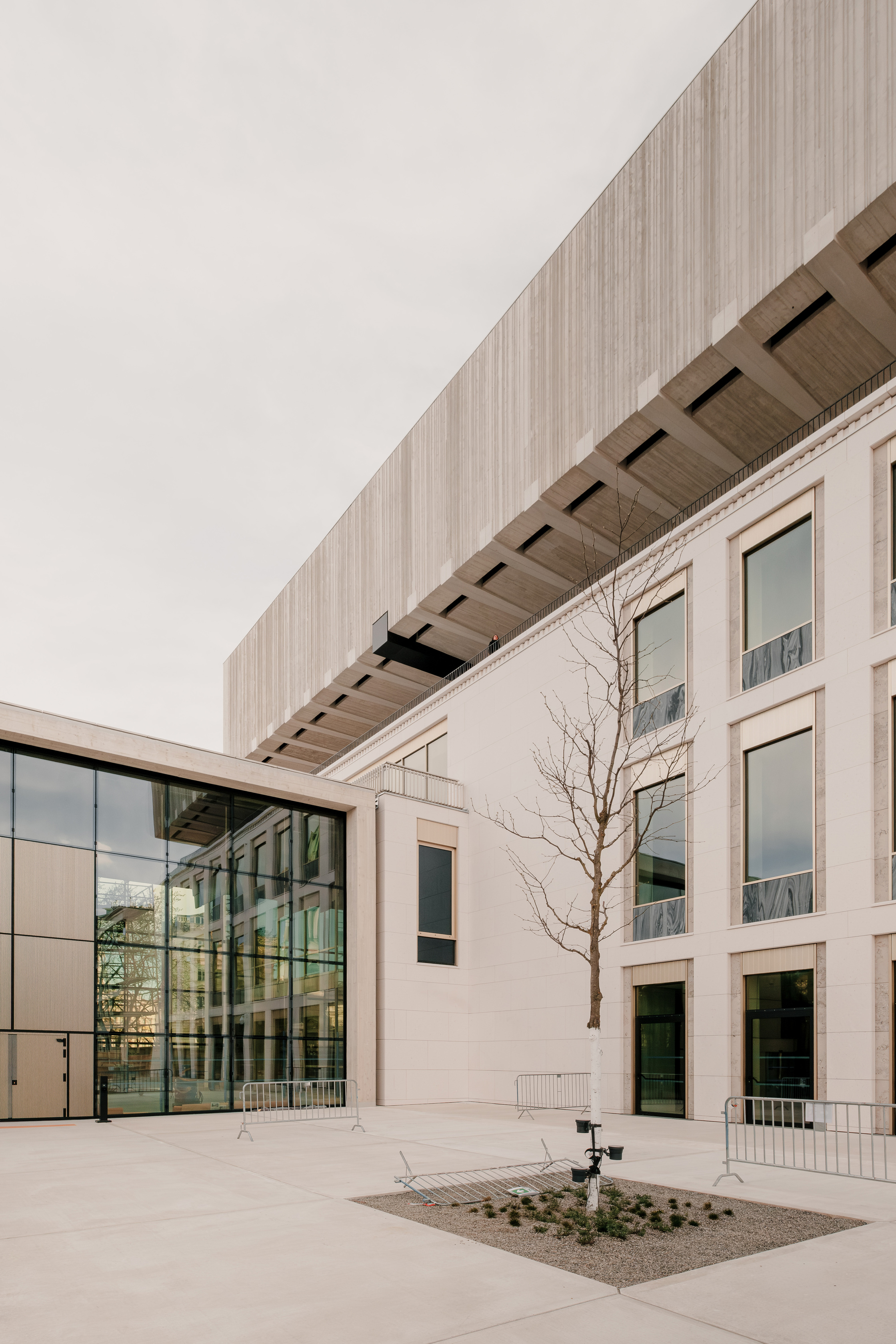 Die Respektsbekundungen vor Haerdtl waren glaubhaft, und das zeigt sich jetzt im Ergebnis – vor allem in der Arbeit mit dem Material. Die alt-neue Fassade beantwortet die Frage, wie viel Originalsubstanz in einem Denkmal stecken muss, wohlüberlegt. Die in den 1980er-Jahren ersetzten Steinplatten wurden durch hellen Kalkstein ersetzt, der dem ursprünglichen Charakter nahekommt. Die Fenster-Trilogie aus Aluminium, grauem Kalkstein und blaugrauem Marmor wurde harmonisch-historisch abgestimmt, die denkmalgeschützte Stiege im Inneren elegant mit den heutigen Normen in Einklang gebracht, an sich eine Unmöglichkeit.