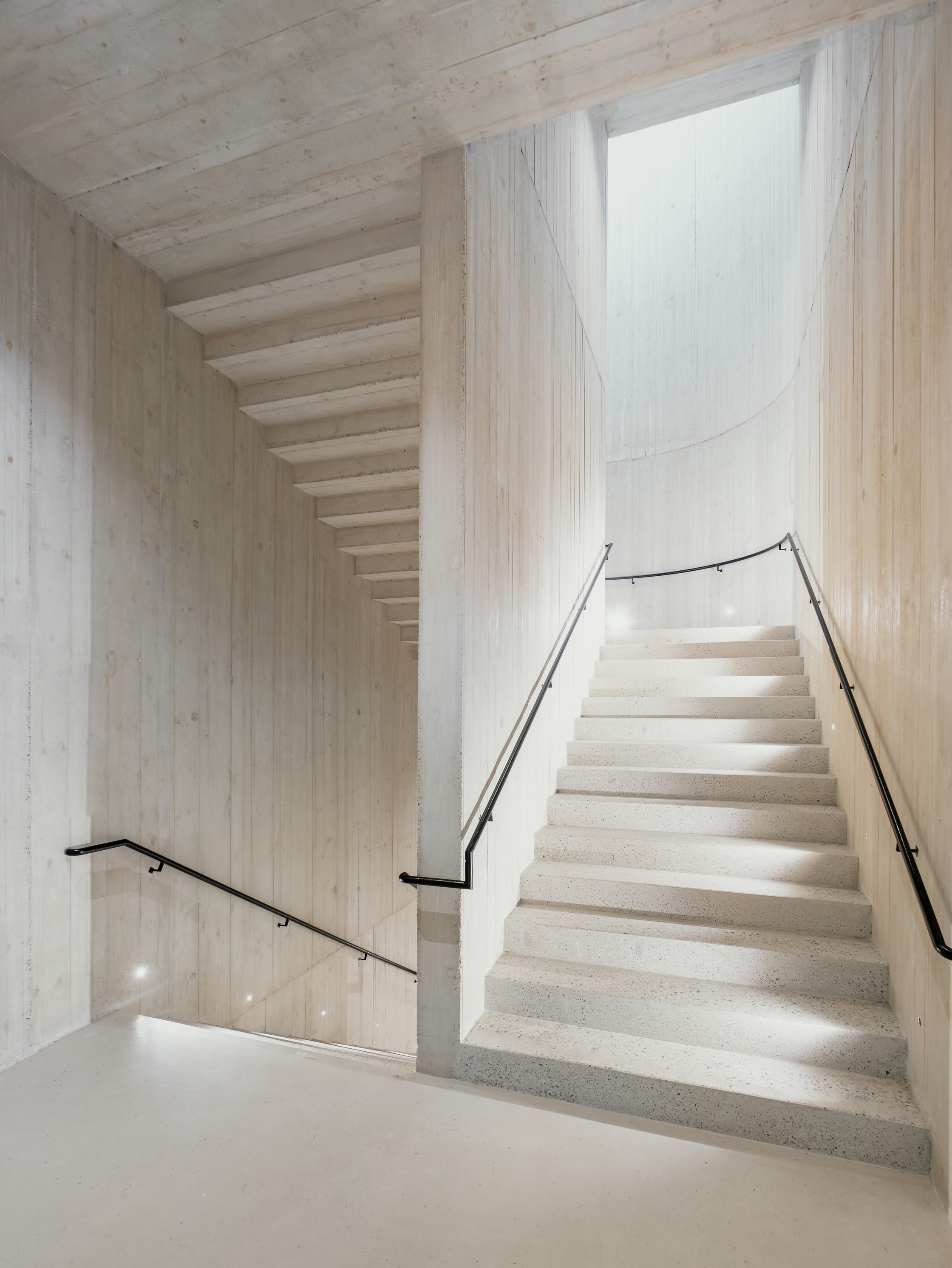 Doch die „energetische Präsenz ist vor allem den zwei neuen Geschoßen zu verdanken, die das Museum endlich zu angemessenem Selbstbewusstsein im Stadtraum verhelfen. Die Fassade der ganz oben thronenden Halle für Wechselausstellungen, verkleidet in Sichtbeton mit unregelmäßig geriffelten vertikalen Graten der Bretterschalung, verbindet rurale Handwerklichkeit mit urbaner Industrie. Im offiziellen Wording ein „Schwebegeschoß“, weil im Wettbewerb eine Aufstockung nicht gewünscht war. Zwar können tausend Tonnen Stahl nicht schweben, doch die Entscheidung, dem Altbau keinen Zweitbau aufzusetzen, sondern einen oberen Abschluss zu geben, war richtig.