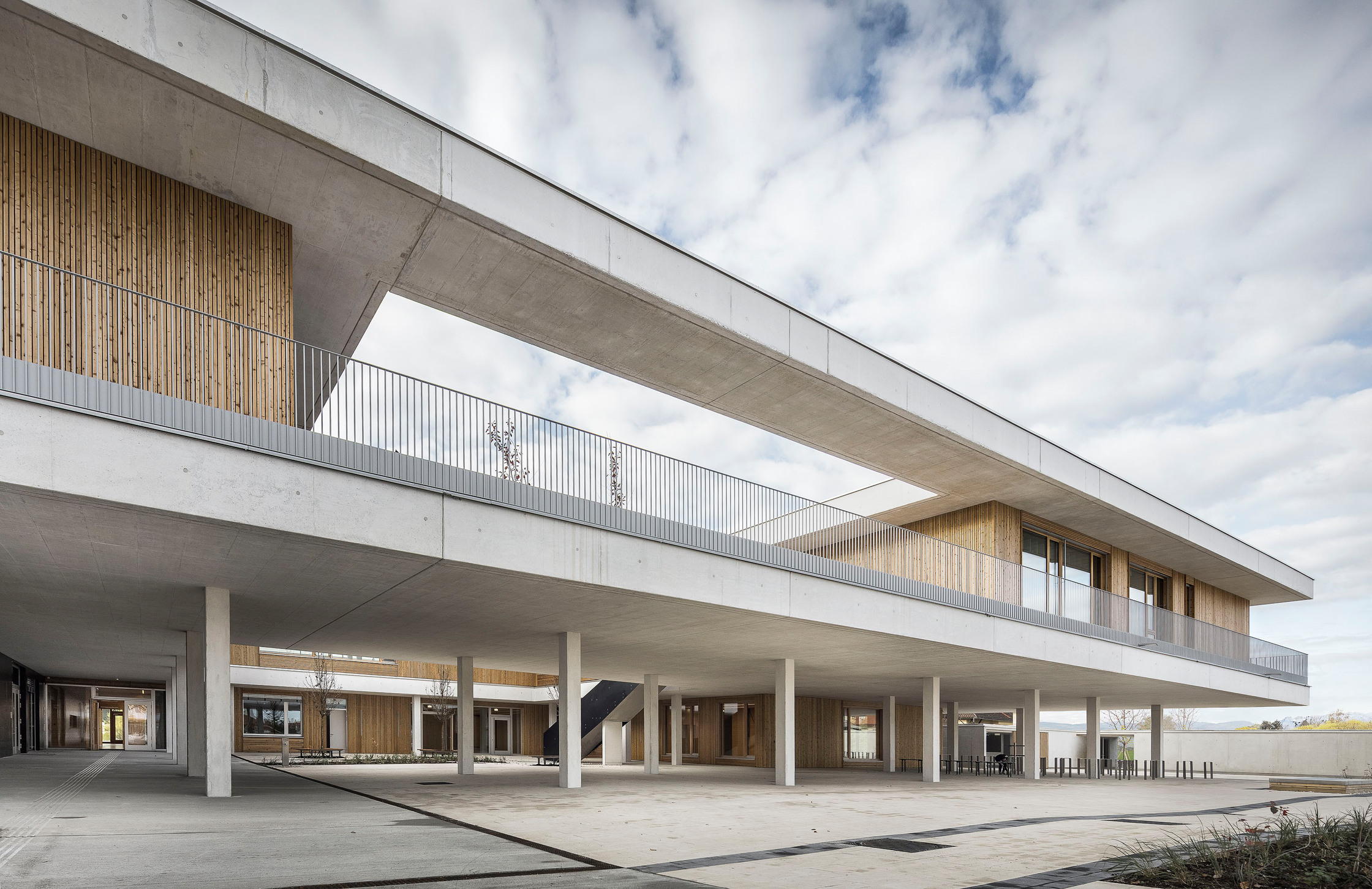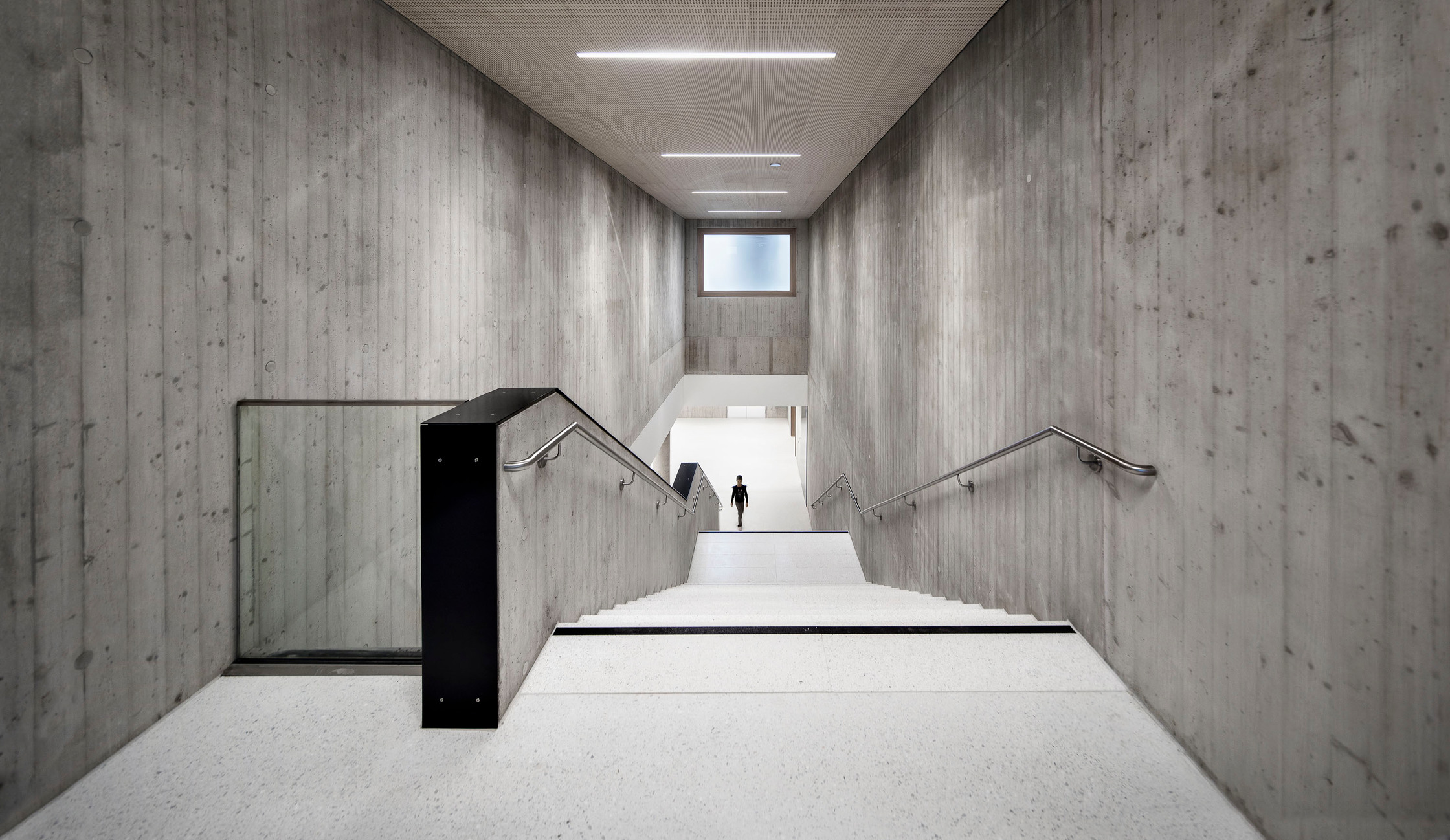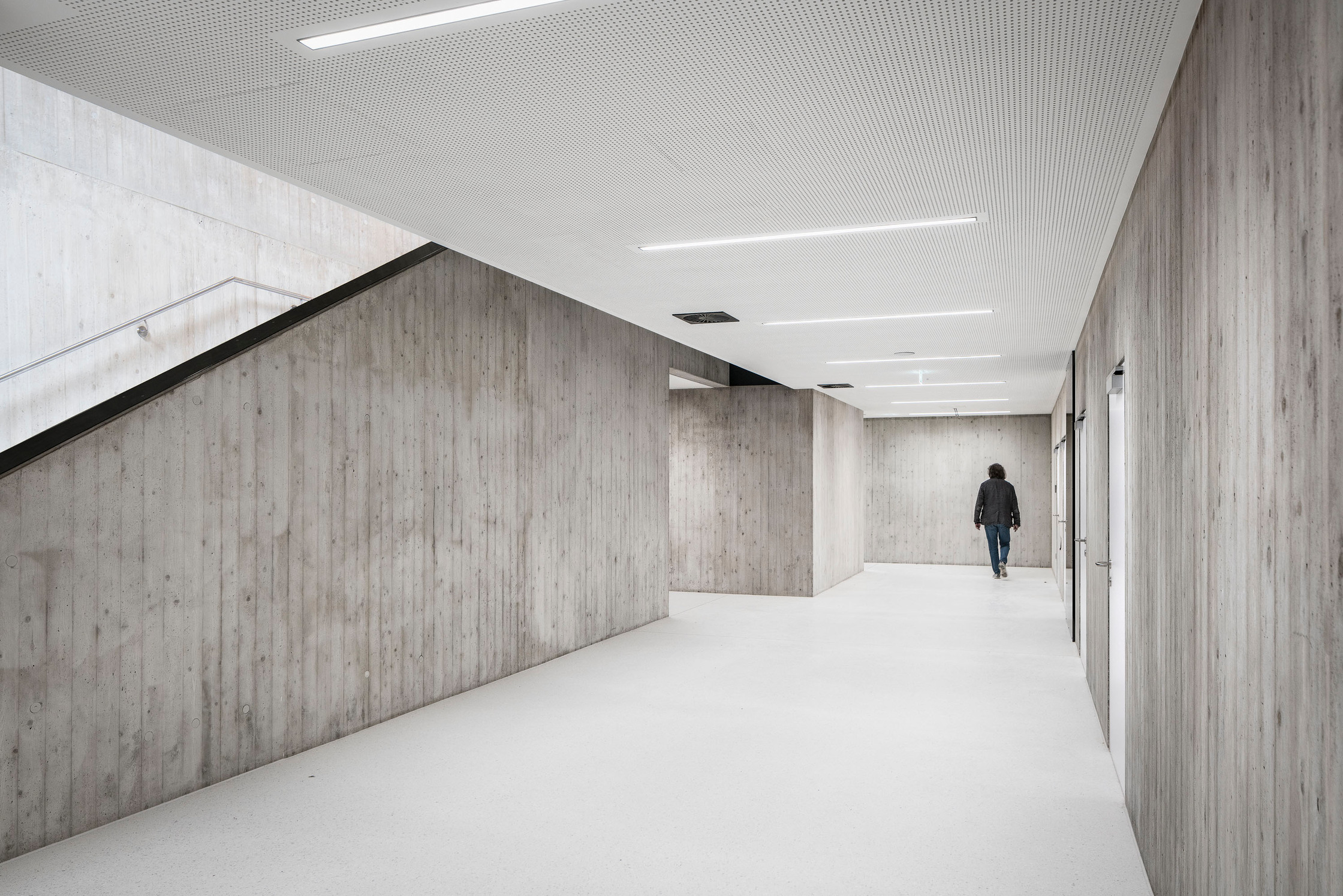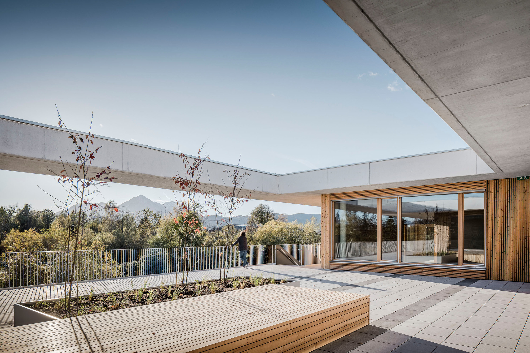 Materialität im Wesentlichen reduziert auf Sichtbeton und Holz. Holzverkleidung Außen Lärche unbehandelt.