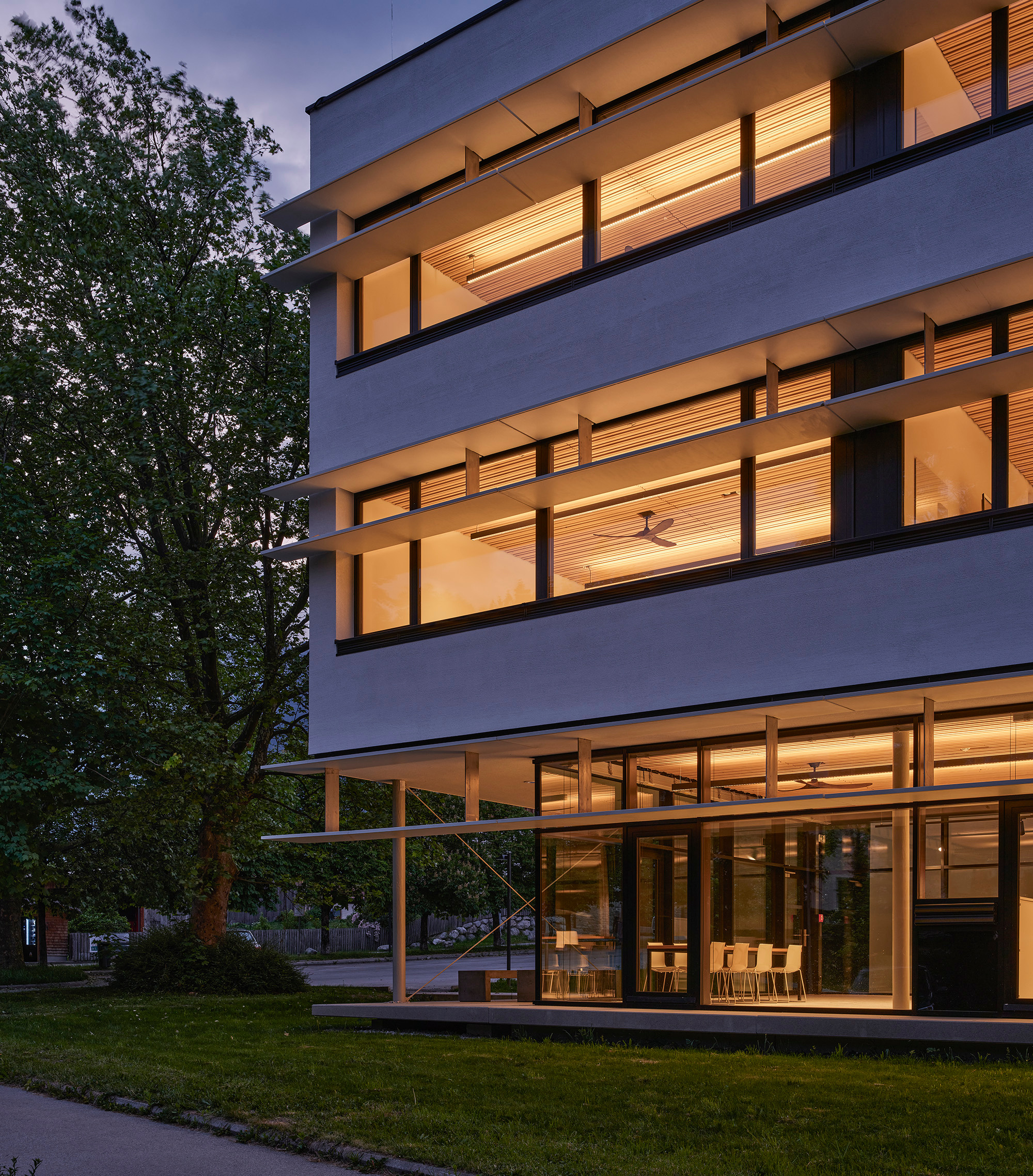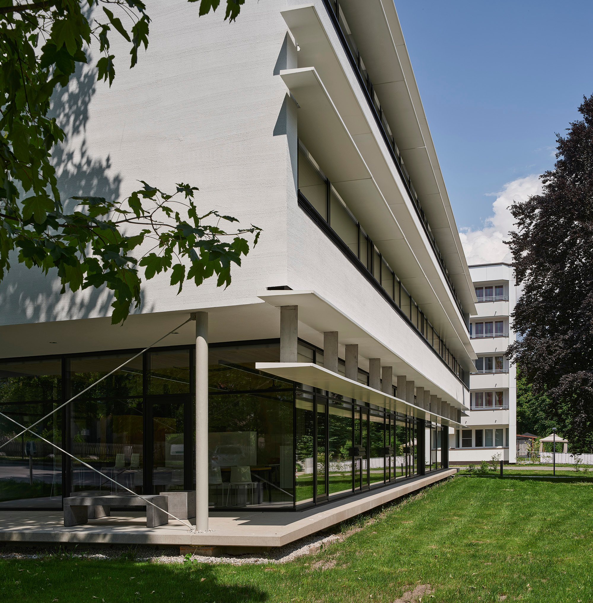 Der Neubau wurde schon im Wettbewerbsentwurf als Holzmassivbau konzipiert. Nur die unbedingt notwendigen erdberührten Bauteile (Bodenplatte) und der aussteifende Liftkern wurden in Stahlbeton ausgeführt. Brandschutztechnische Trennbauteile, insbesondere in den Anschlussbereichen zum Bestand, wurden in Trockenbauweise hergestellt. Die Dämmung der Außenhülle besteht aus recyclierter Zellulose oder nachwachsenden Rohstoffen (Holzfaser), ausgenommen die wenigen Bereiche wo eine nichtbrennbare Dämmung erforderlich ist. Die konsequente Beachtung der Ökobilanzen der eingesetzten Baustoffe und der Einsatz nachwachsender Rohstoffe sorgt in Summe für einen minimierten CO2-Fußabdruck der Konstruktion (GWP-total: -50,0 kg CO2 equ./ m² BGF, d.h. -53.850 kg CO2 equ. für die Gebäudehülle für die Phasen A1 – A3) und in der Folge für ein deutlich rascheres Erreichen des übergeordneten Ziels: die klimapositive Gesamtbilanz.