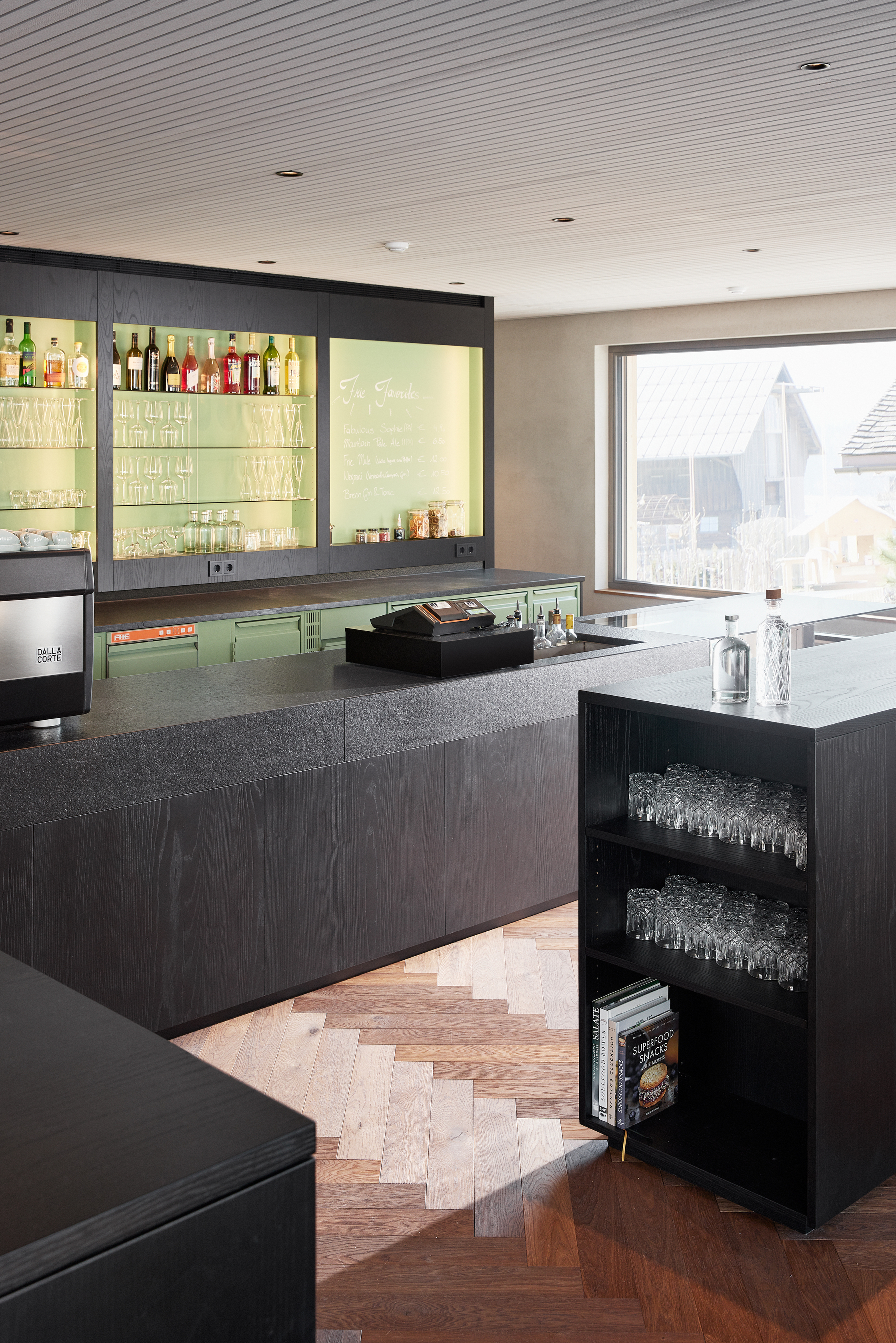 Elektroinstallationen: Elektro Meusburger, Bezau; Holzdecke: Michael Kaufmann, Reuthe; Holzböden: BenJo, Bezau; Holzmöbel: Tischlerei here, Au; Malerarbeiten, Kalkutze: Malerei Moosbrugger, Au; Raumausstattung: Troy GmbH, Stefan Troy, Bezau