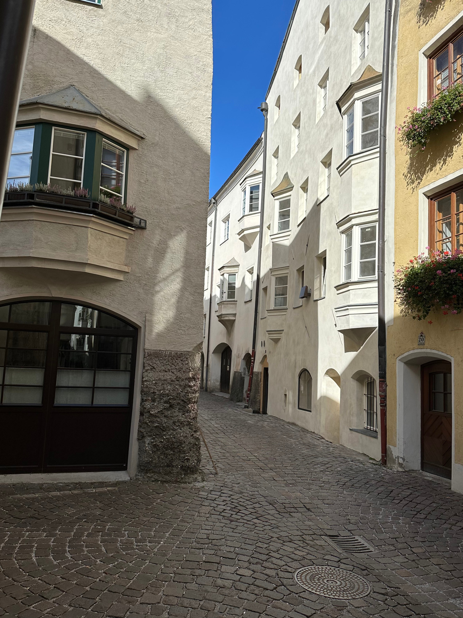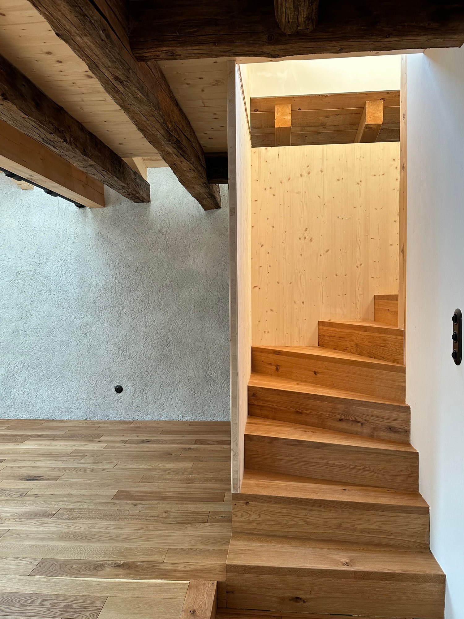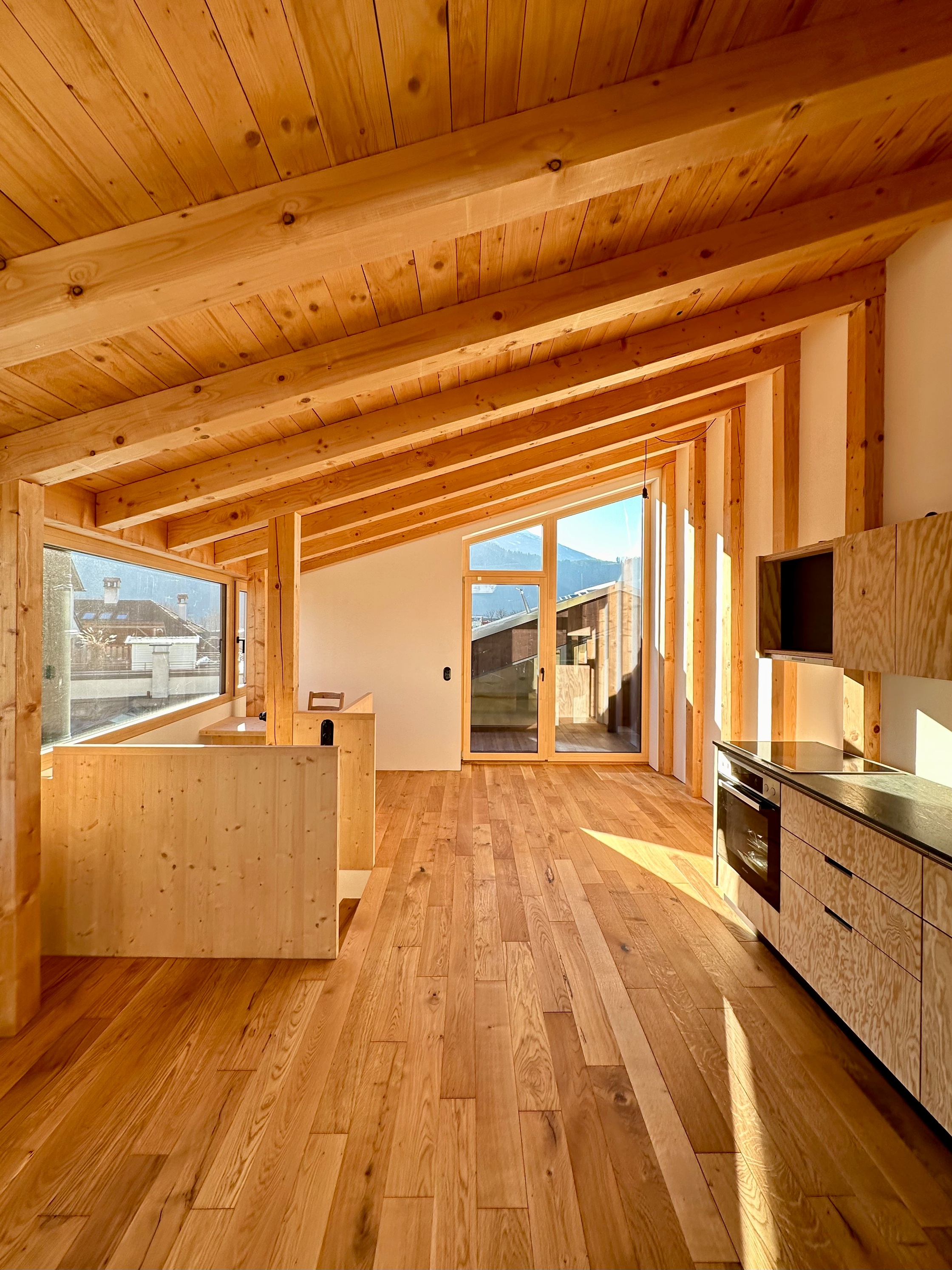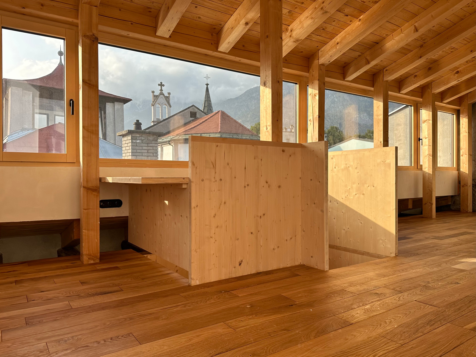 Die Sanierung der Fenster, des Dachs, der bodenberührenden Bauteile usw. entspricht trotz der strengen Vorgaben laut Denkmalsschutzgesetz dem Tiroler Niedrigeengiestandard. Auch die graue Energie – also die schon vor vielen Jahrhunderten in den Bau gesteckte Energie – bleibt für weitere Jahrhunderte von Nutzen. So wurden die Renaissance- Holztrambalkendecken aus dem Jahr 1460 statisch ertüchtigt und denkmalpflegerisch renoviert. Die vorhandene Dachkonstruktion wurde im Sinne von „urban minig“ als neue Zwischendecke bei der zurückhaltenden Aufstockung wieder verwendet“. Für die neue Dachkonstruktion waren neue Bauteile erforderlich. Diese kommen aus einem nahegelegenen Wald bei Gramartboden und wurden auf Mass nach Statiker- und Försterangaben in der Säge geschnitten und mit traditionellen Holzverbindungen in Vollholz und leimfrei vom Zimmerer errichtet. Alle Dachlatten und Schalungsbretter wurden aus den Restmengen der Dachkonstruktion gewonnen.