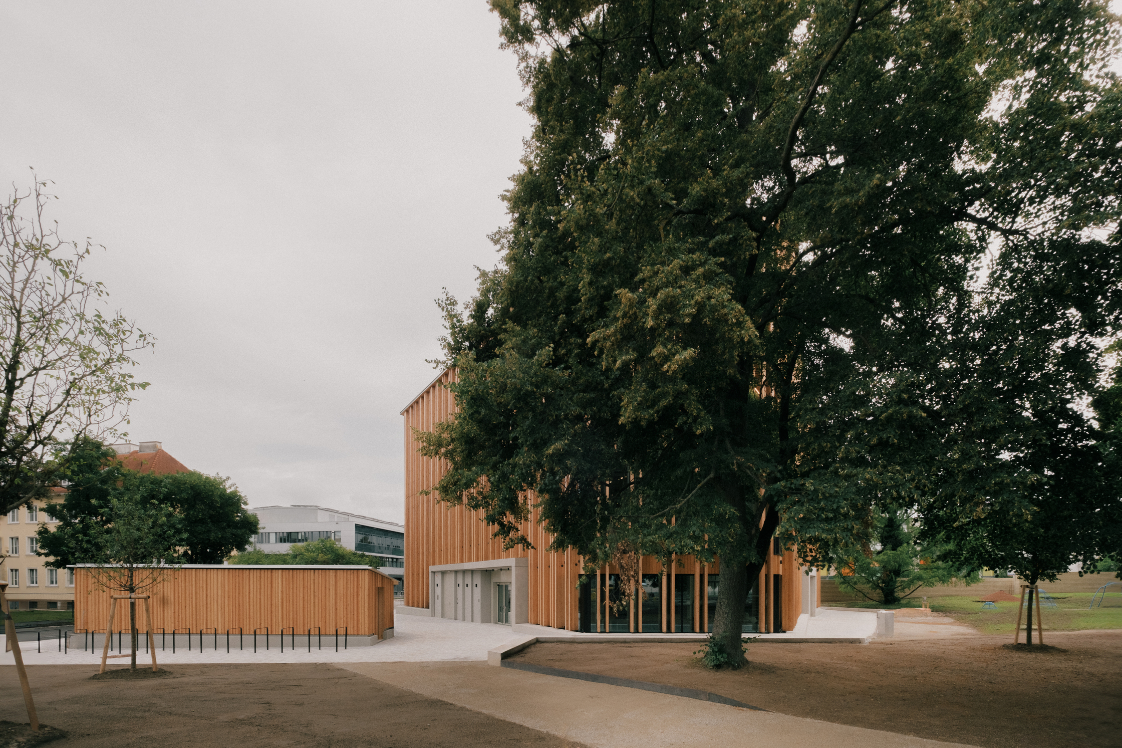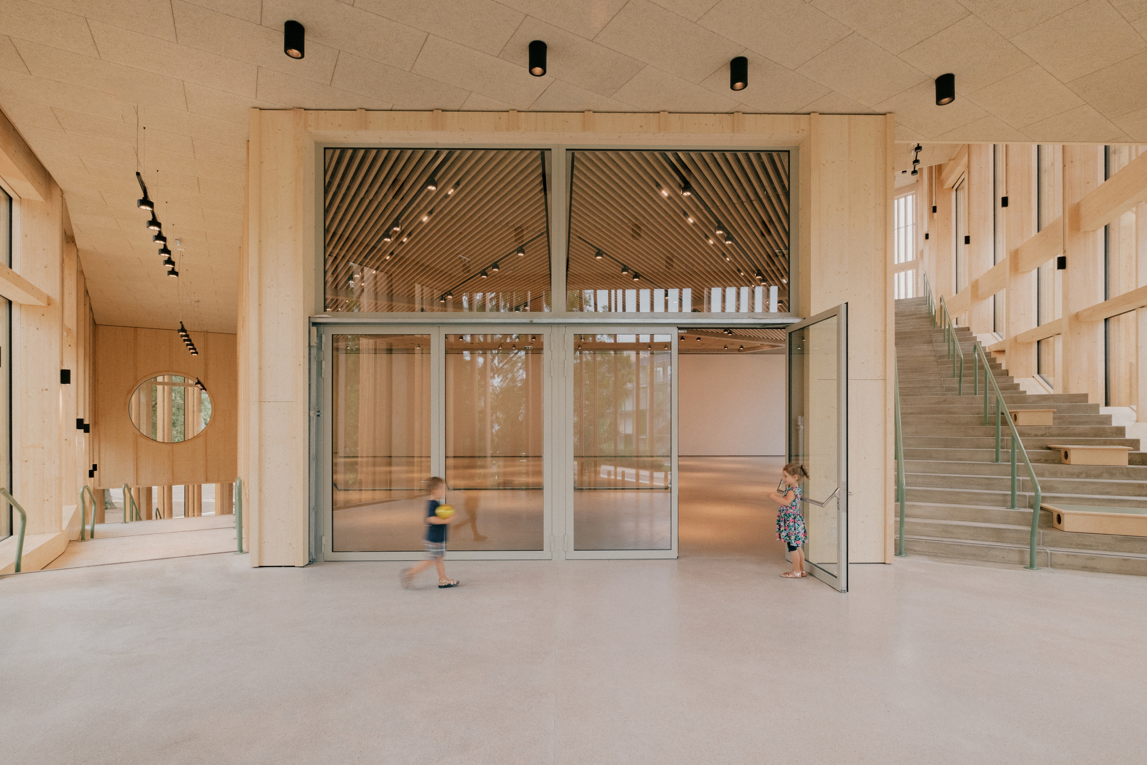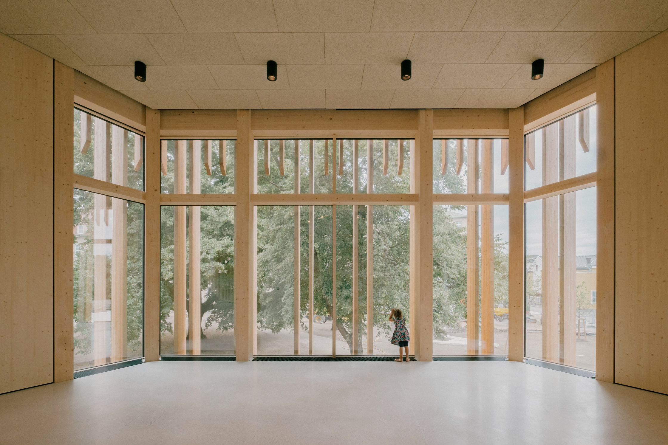 Nach außen bilden Holzlamellen einen beschattenden und durchlässigen Filter zur Umgebung. Kontrastierend zum weichen hölzernen Kleid wirken die drei Gebäudeeinschnitte mit akkurat gekanteten Gewänden würdevoll streng. Das breiteste markiert den Eingang am Vorplatz, ein Portal führt vom Park in das Café im Erdgeschoß, und das dritte dient als Fenster zum angrenzenden Indoorspielplatz, den der polnische Architekt und Künstler Jakub Szczęsny als vielseitigen Raum, der erobert werden will, gestaltet hat.
