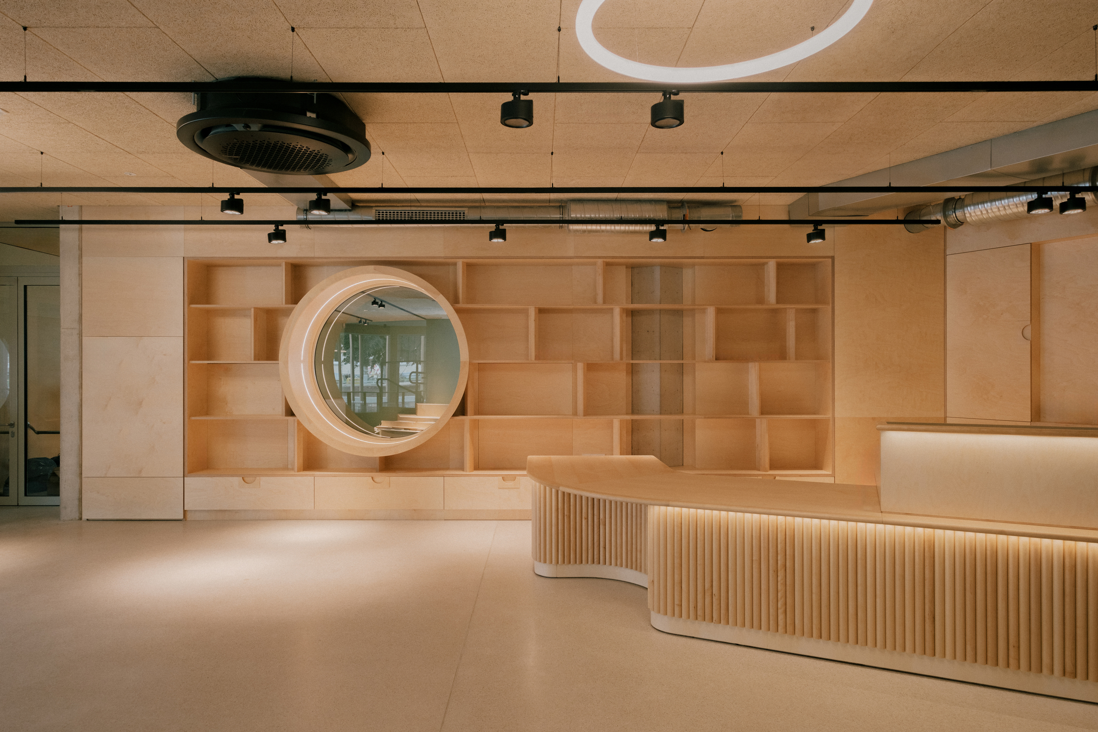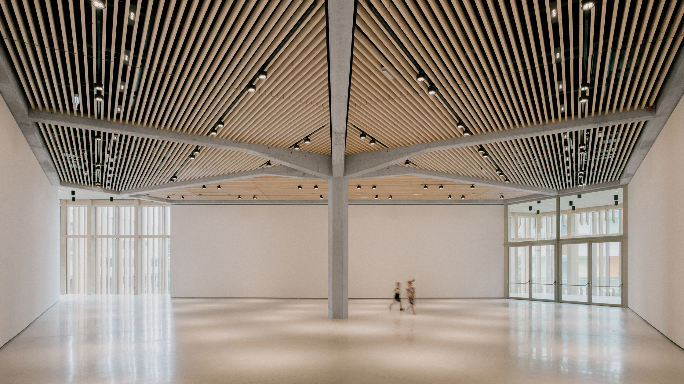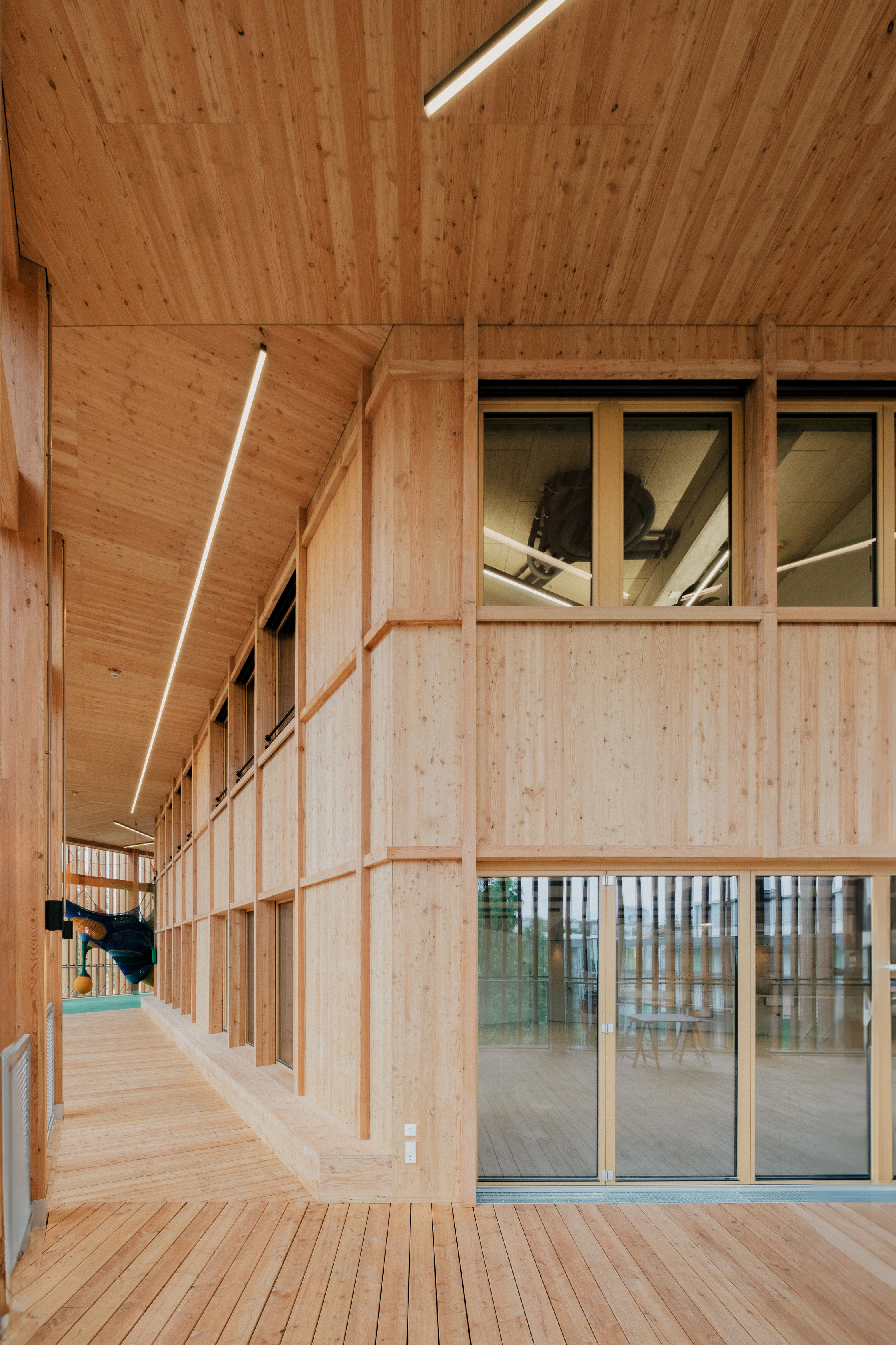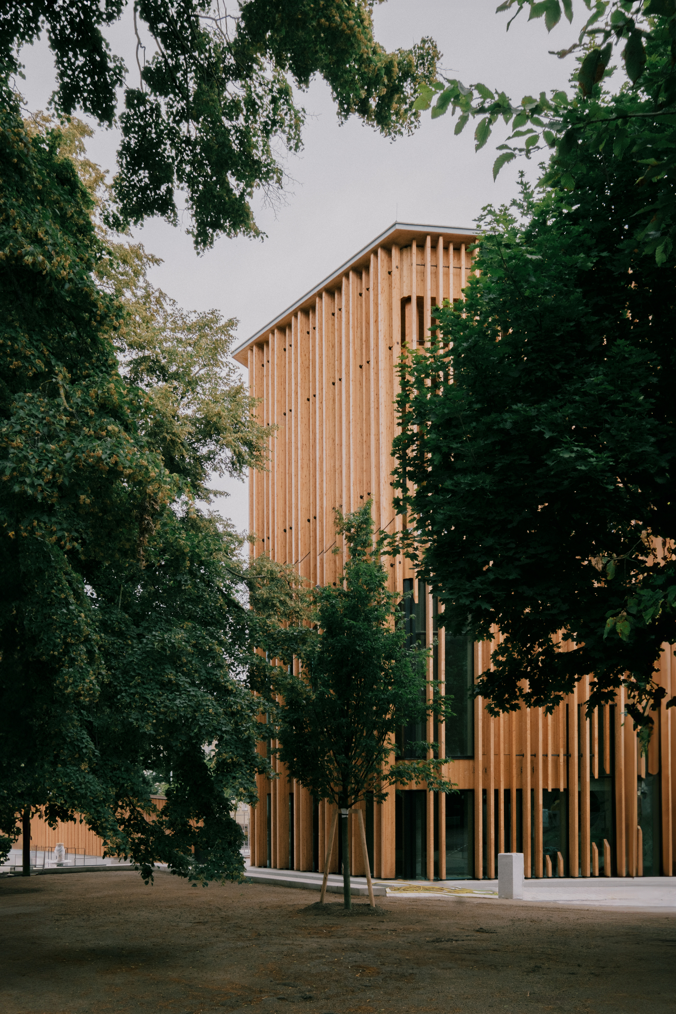 Nach außen bilden Holzlamellen einen beschattenden und durchlässigen Filter zur Umgebung. Kontrastierend zum weichen hölzernen Kleid wirken die drei Gebäudeeinschnitte mit akkurat gekanteten Gewänden würdevoll streng. Das breiteste markiert den Eingang am Vorplatz, ein Portal führt vom Park in das Café im Erdgeschoß, und das dritte dient als Fenster zum angrenzenden Indoorspielplatz, den der polnische Architekt und Künstler Jakub Szczęsny als vielseitigen Raum, der erobert werden will, gestaltet hat.