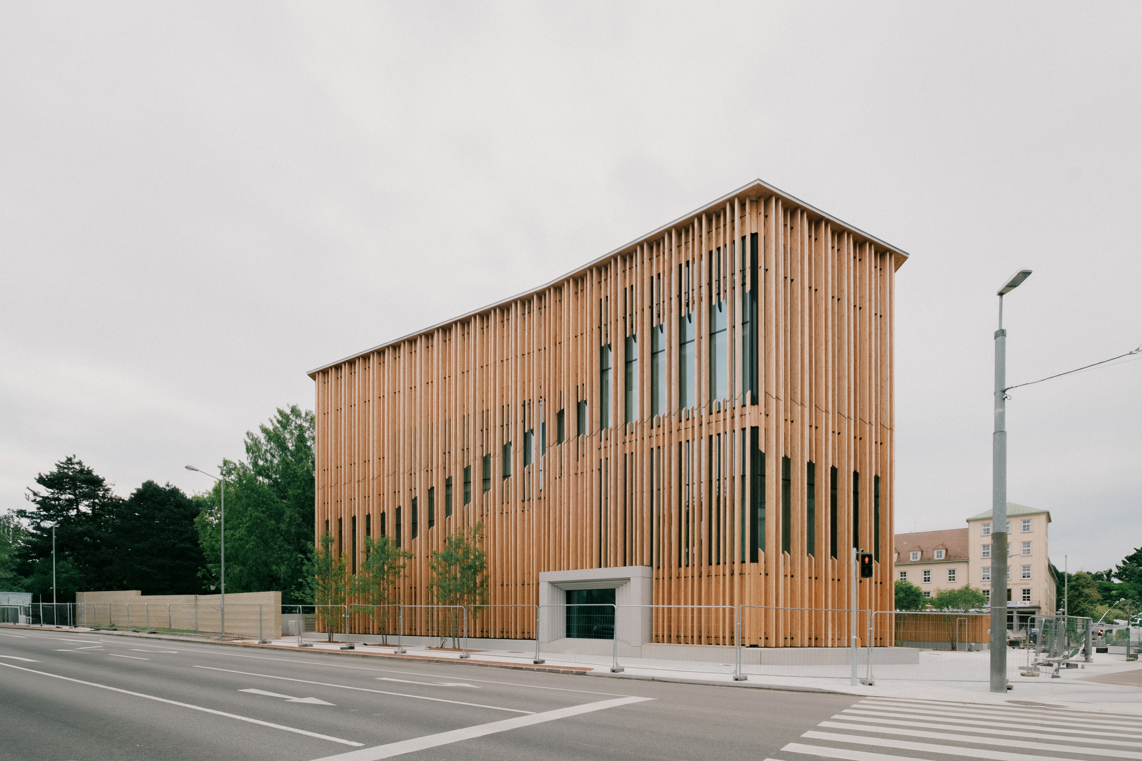 Nicht so beim jüngsten Neuzugang. Eine Art niedriger Turm, gehüllt in Holzlamellen, hinter denen Fensterflächen dunkle Diagonalen zeichnen. Der Eingang ein Trichter aus Sichtbeton, gestaffelt wie das Stufenportal einer Kathedrale. Also eine Kirche? Wobei, die Holzfassade sieht eher nach einem Forschungszentrum aus. Aber wozu dann die riesige Loggia im zweiten Stock mit Blick auf den Park und seinen alten Baumbestand? Ein Beobachtungsposten für Eichhörnchenfans? Oder doch ein Museum? Aber was für eines?