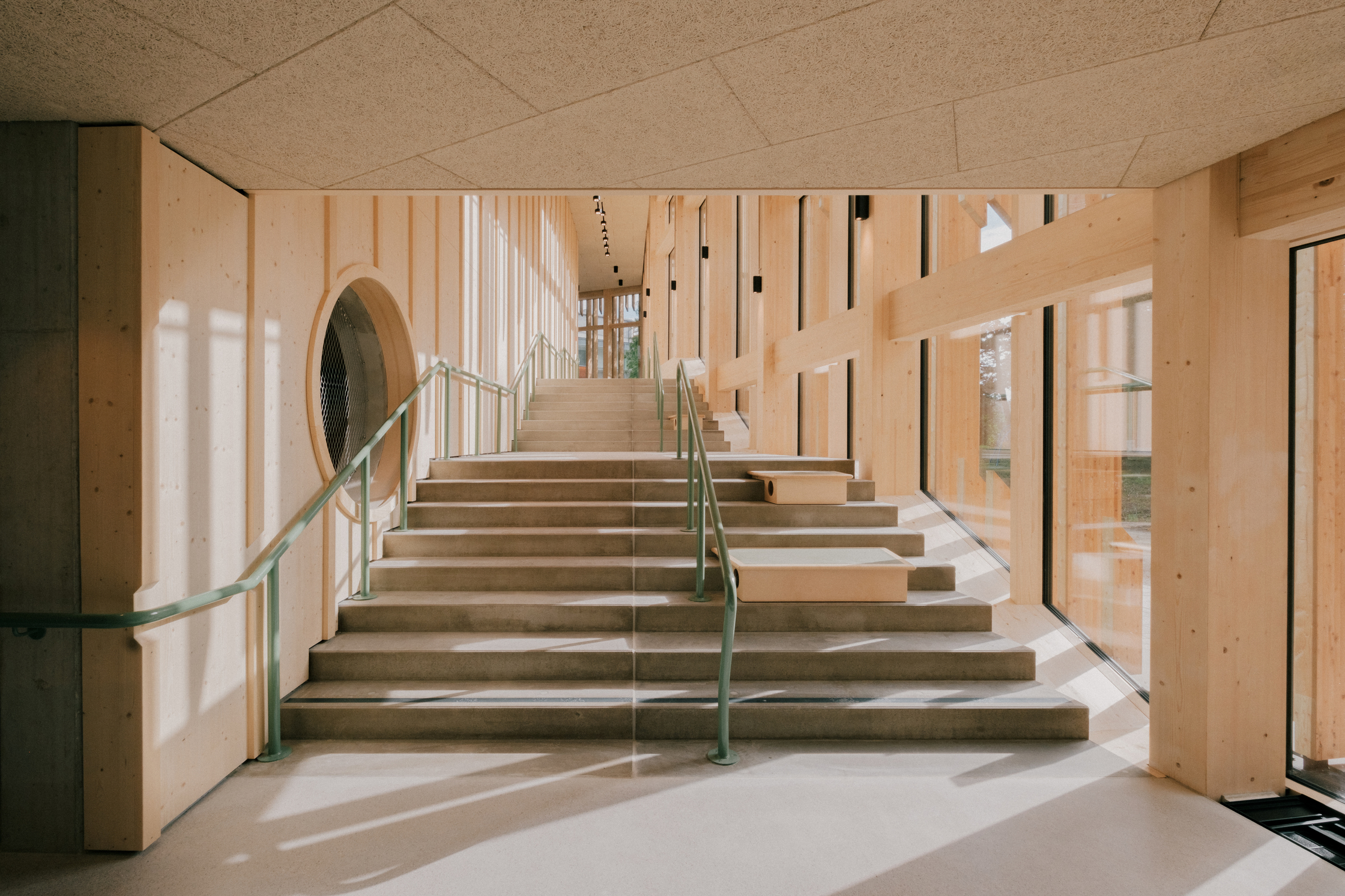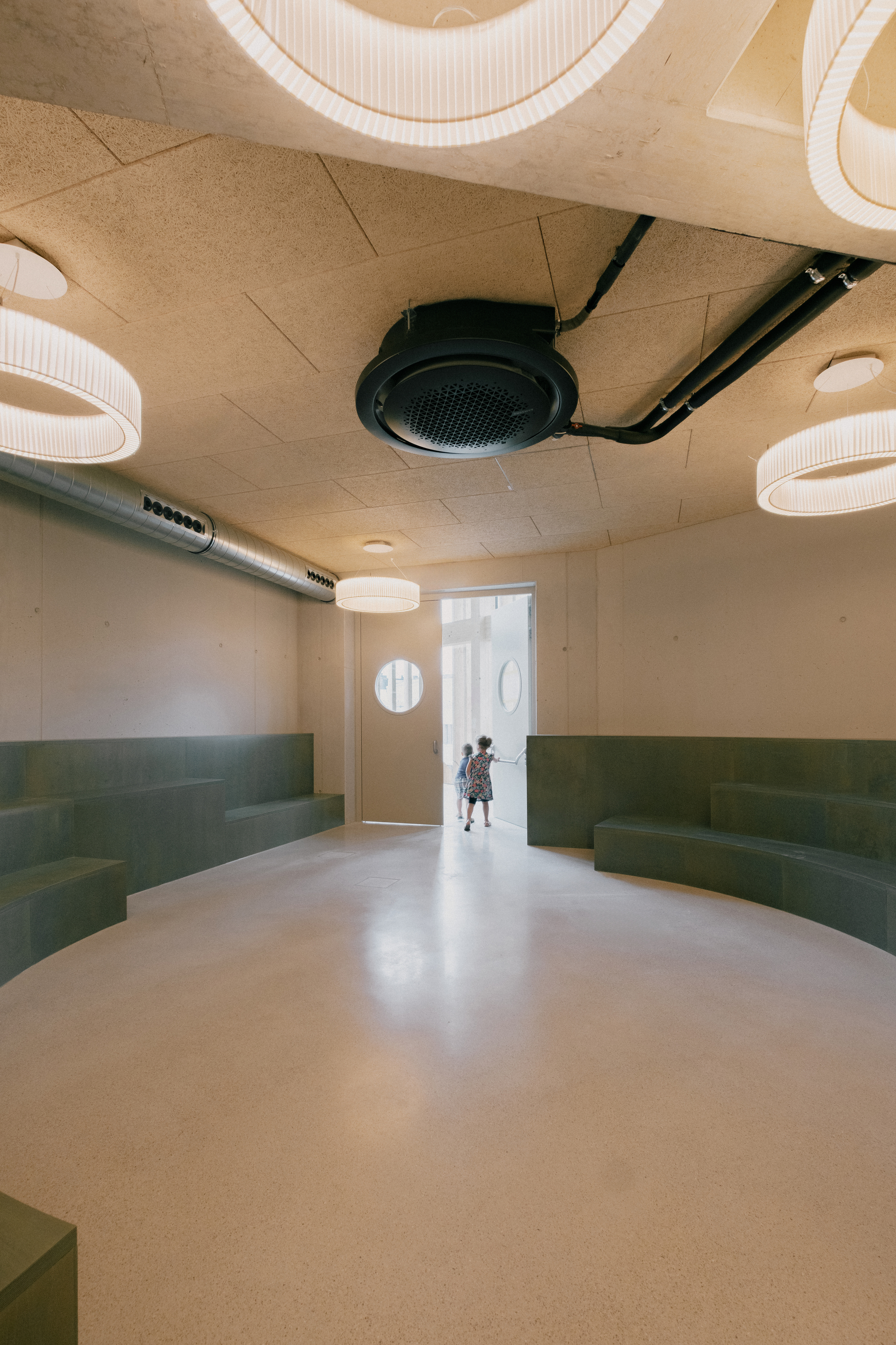 Als Form wählten sie ein gleichseitiges Dreieck mit stumpfen Ecken, an allen drei Seiten knickt die Fassade leicht nach innen. Da der Weg durchs Haus an der Fassade entlangführt, ergibt sich so eine Sogwirkung im Bewegungsablauf, ein Kontinuum an einladenden Gesten und belohnenden Blickrichtungen, Futter für unstillbare Neugier. Es sollten, sagt Michael Salvi, euphorische, feierliche Räume werden. Das mag etwas sakral klingen, bedeutet aber einfach, dem Kind nicht eine Schrumpfversion der Welt anzubieten, sondern im Gegenteil besonders große Türen in diese zu öffnen.