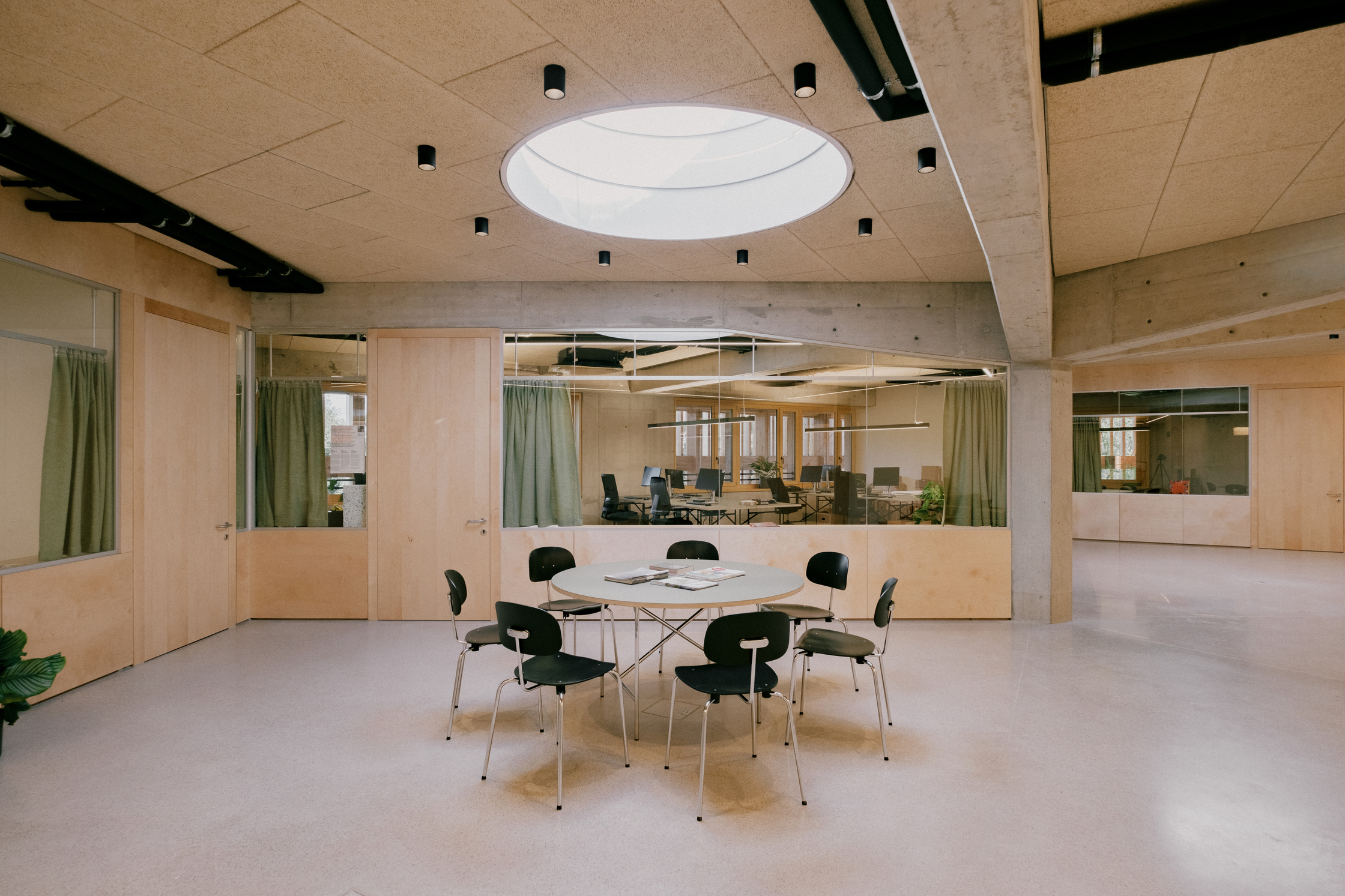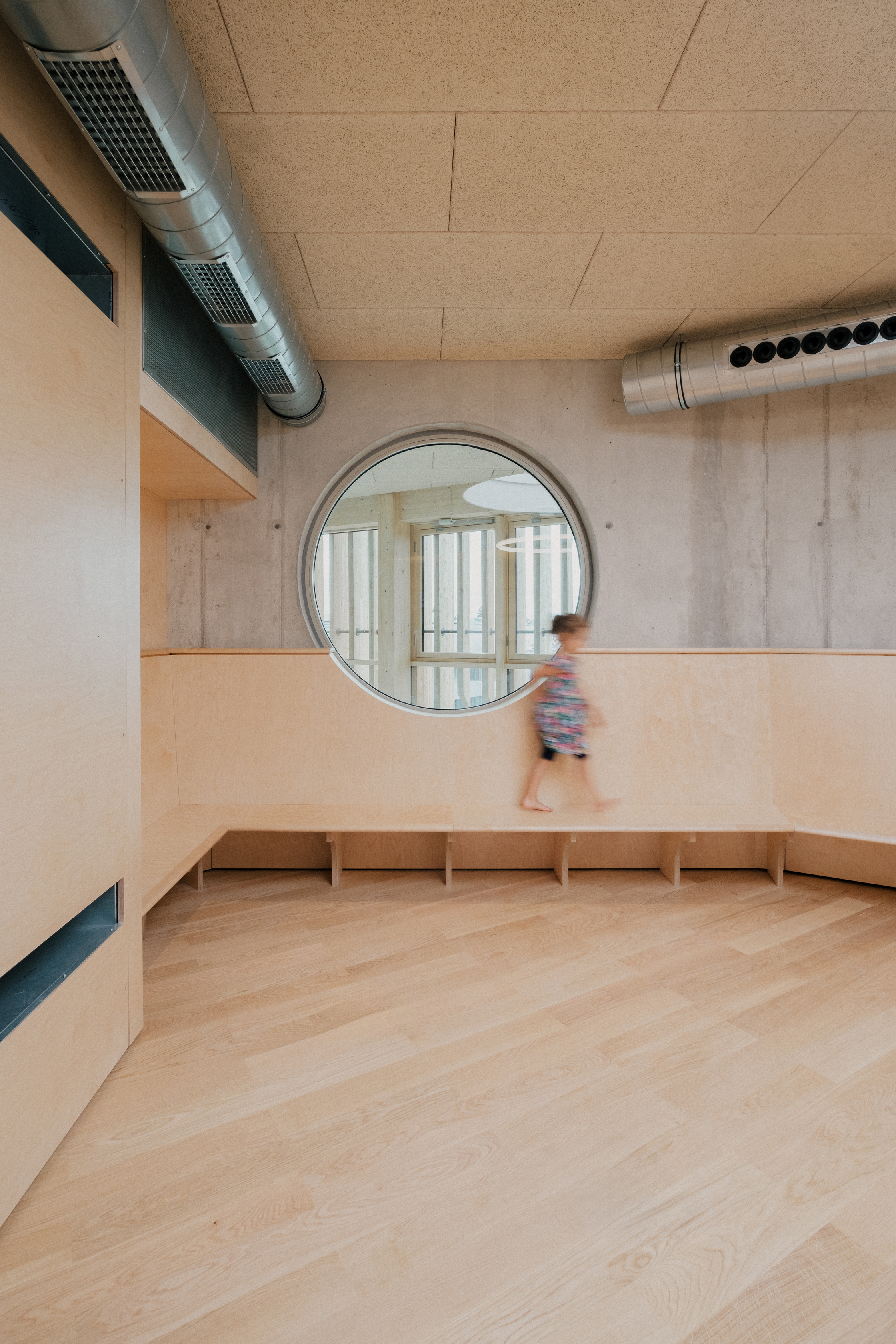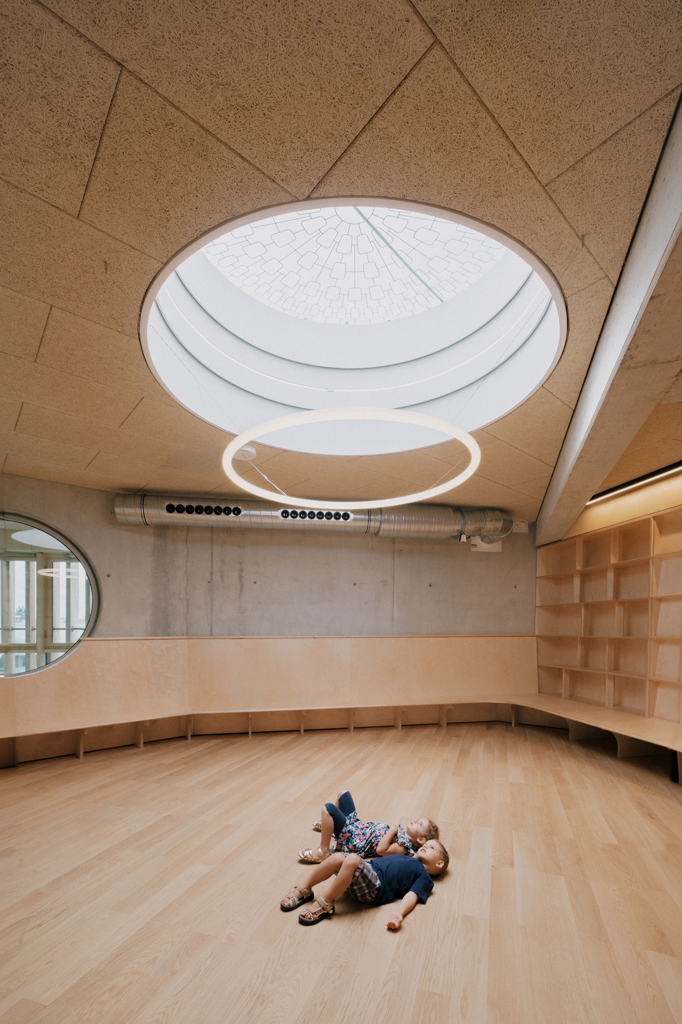Der große Ausstellungsbereich im ersten Stock wird mit einer Ausstellung der gern mit sozialen Interaktionen arbeitenden brasilianischen Künstlerin Rivane Neuenschwander nach den Sommerferien richtig in Betrieb gehen. Im Stock darüber gibt es einen Begrüßungsraum, in dem sich die Kinder sammeln können, bevor sie in den Laboren aktiv werden. Ein Highlight im obersten Stock ist die mit einem runden Oberlicht ausgestattete Kinderbücherei. Ein Gefühl des Willkommenseins ist spürbar, das Materialkonzept macht das Gebäude nahbar. „Die Kinder sollen erkennen, wie das Haus gebaut ist“, erklärt Michael Salvi. Holz und Beton sind sichtbar, ebenso die Leitungsführungen. Metalloberflächen, die berührt werden, etwa die Handläufe, erhielten einen blassgrünen Anstrich. Robuste Basisstrukturen wurden gepaart mit feinen Tischlerarbeiten in Birke.