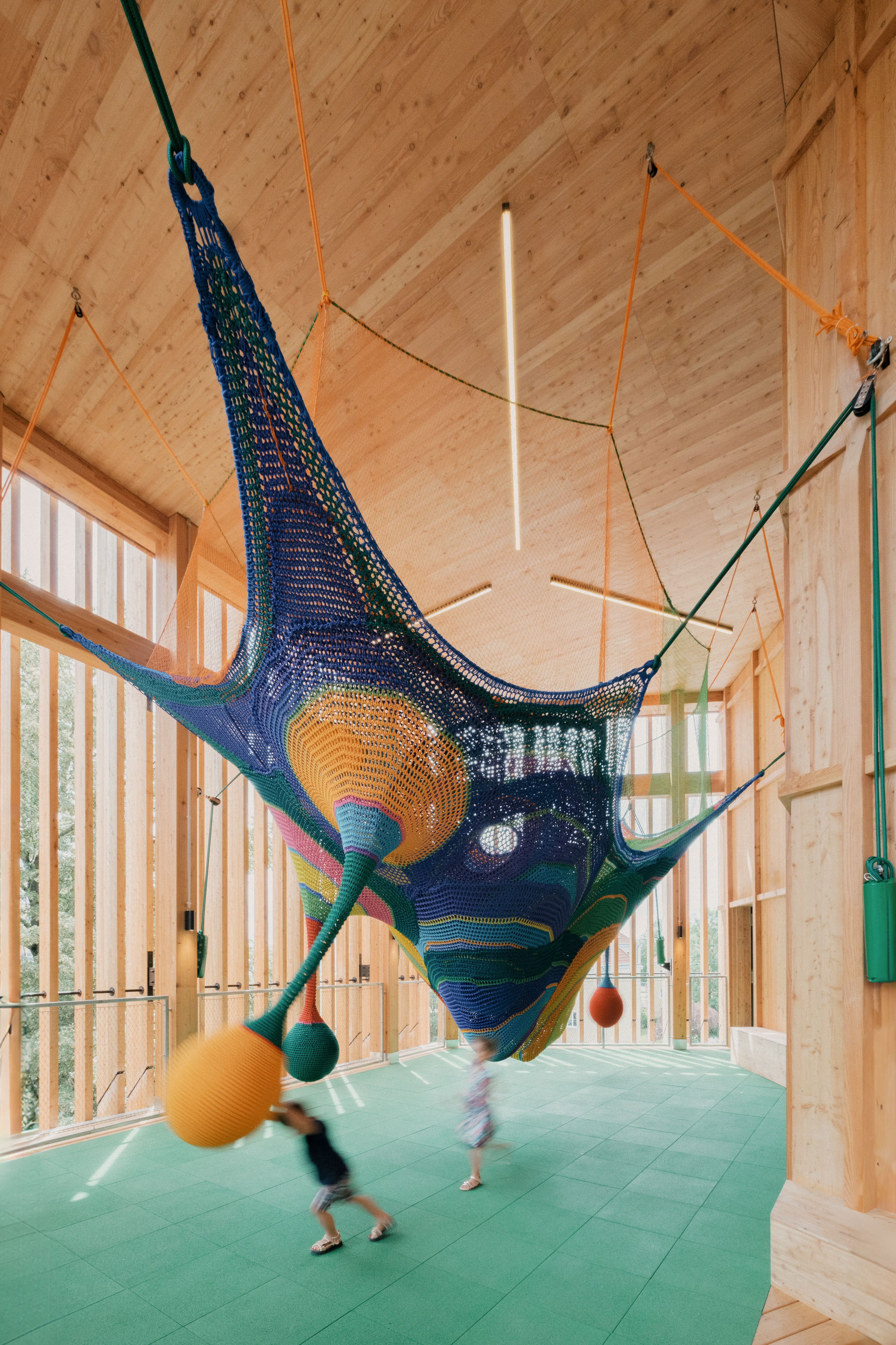 Der nach oben zu schmäler werdende Treppenraum erfüllt den Anspruch, „Möglichkeitsräume“ bereitzustellen, zweimal weitet sich die Zone zwischen innen und außen zu zweigeschoßigen Loggien. „Etwas zum Klettern“ wollten die Kinder. Mit diesem Wunsch konfrontiert, entdeckte Mona Jas die Arbeiten der Japanerin Toshiko Horiuchi MacAdam. Die Kinder waren begeistert, und mit ihrem Votum im Rücken kontaktierte Mona Jas die Künstlerin, die für einen der Bereiche ein riesiges buntes Kletternetz häkelte, „das gut erklärt, wofür das Kinderkunstlabor steht“: höchste künstlerische Qualität und immersive Erfahrung. Treppenkonzerte sind geplant, und auch sonst kann sich hier noch vieles entwickeln.