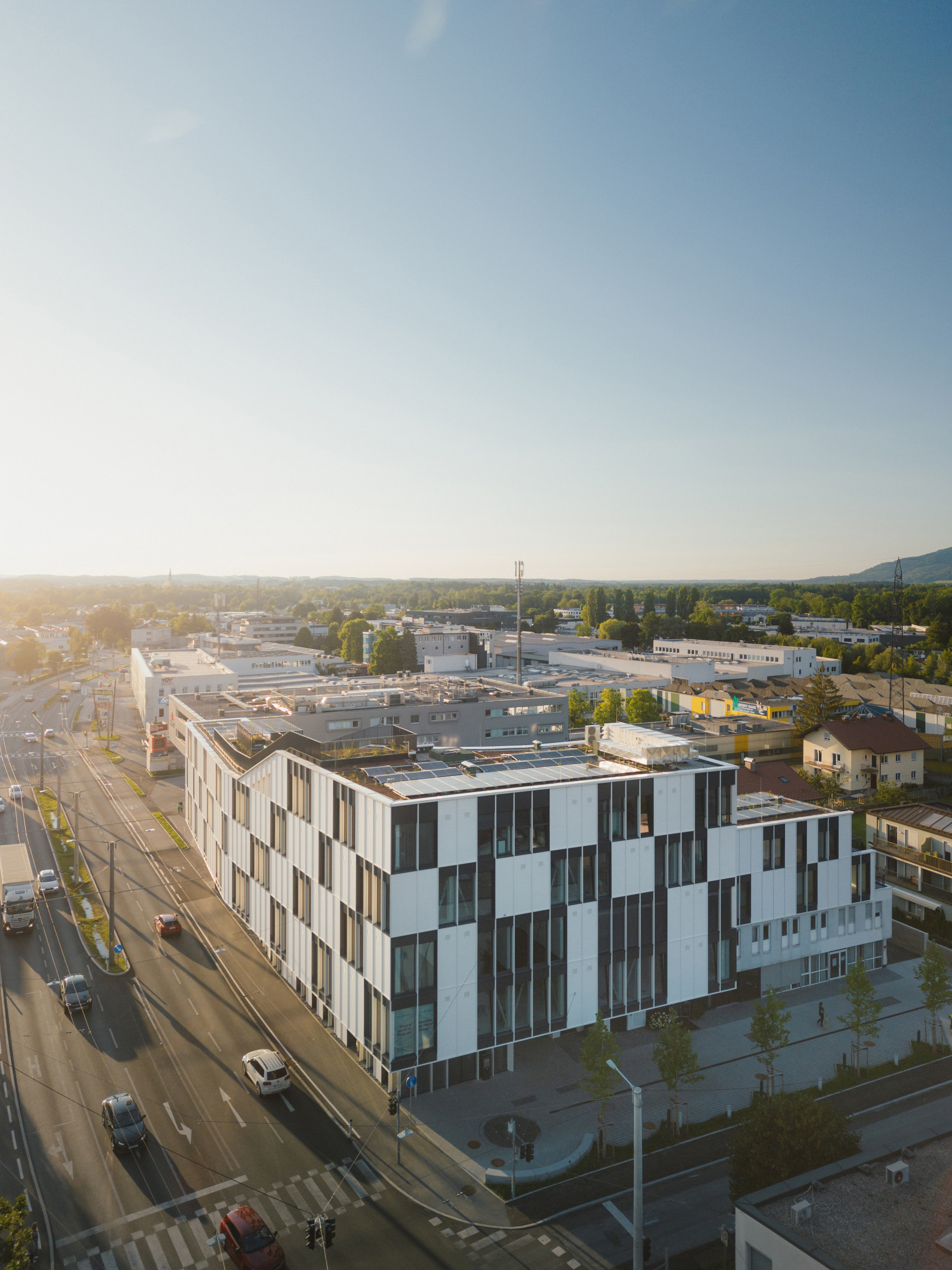 Das Gebäude nutzt Erdwärme, Wärmepumpen und PV-Paneele auf den begrünten Dächern, Fassadenbegrünung und zwei neu gepflanzte Baumreihen und ist von „Klimaaktiv“ Österreich zertifiziert.