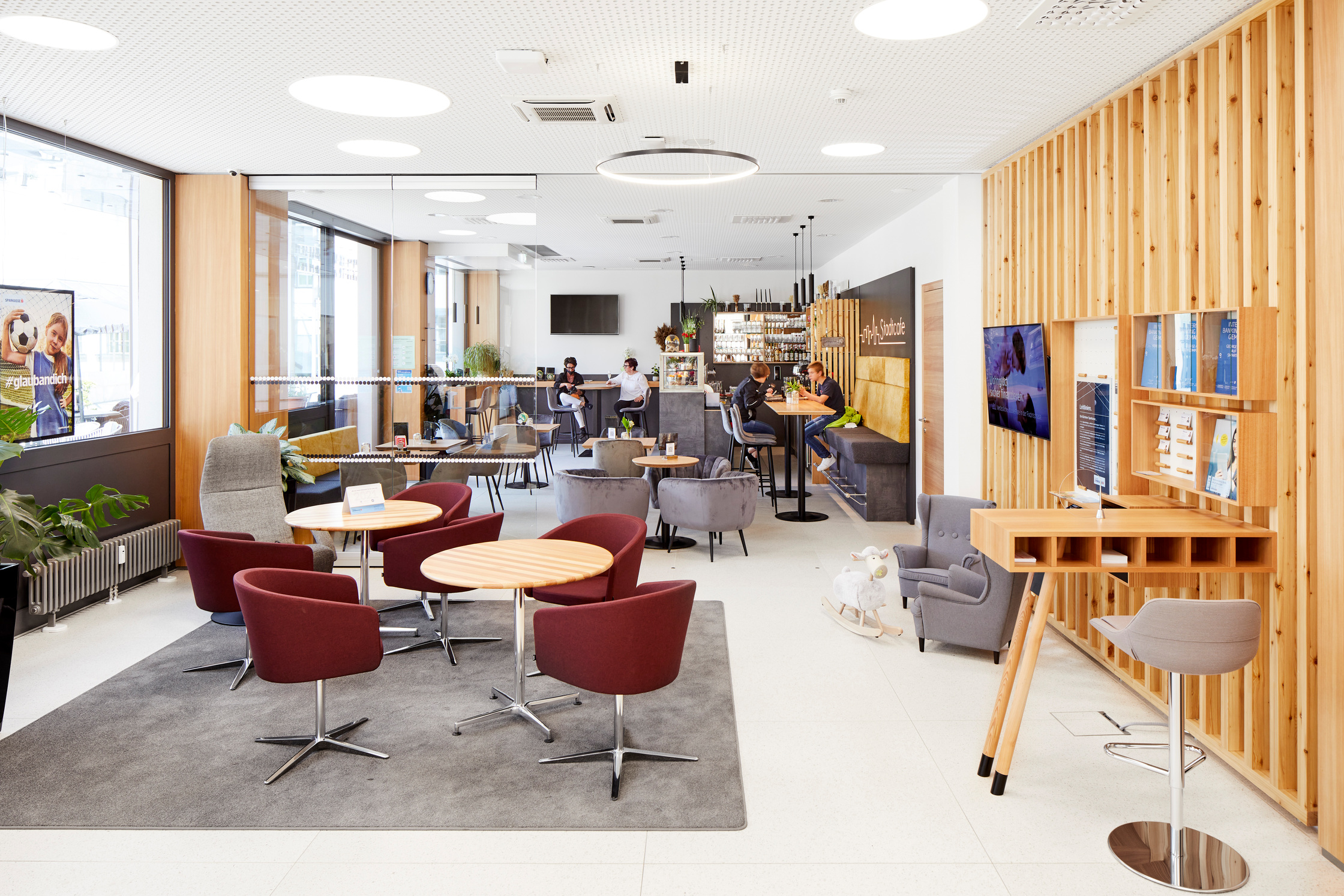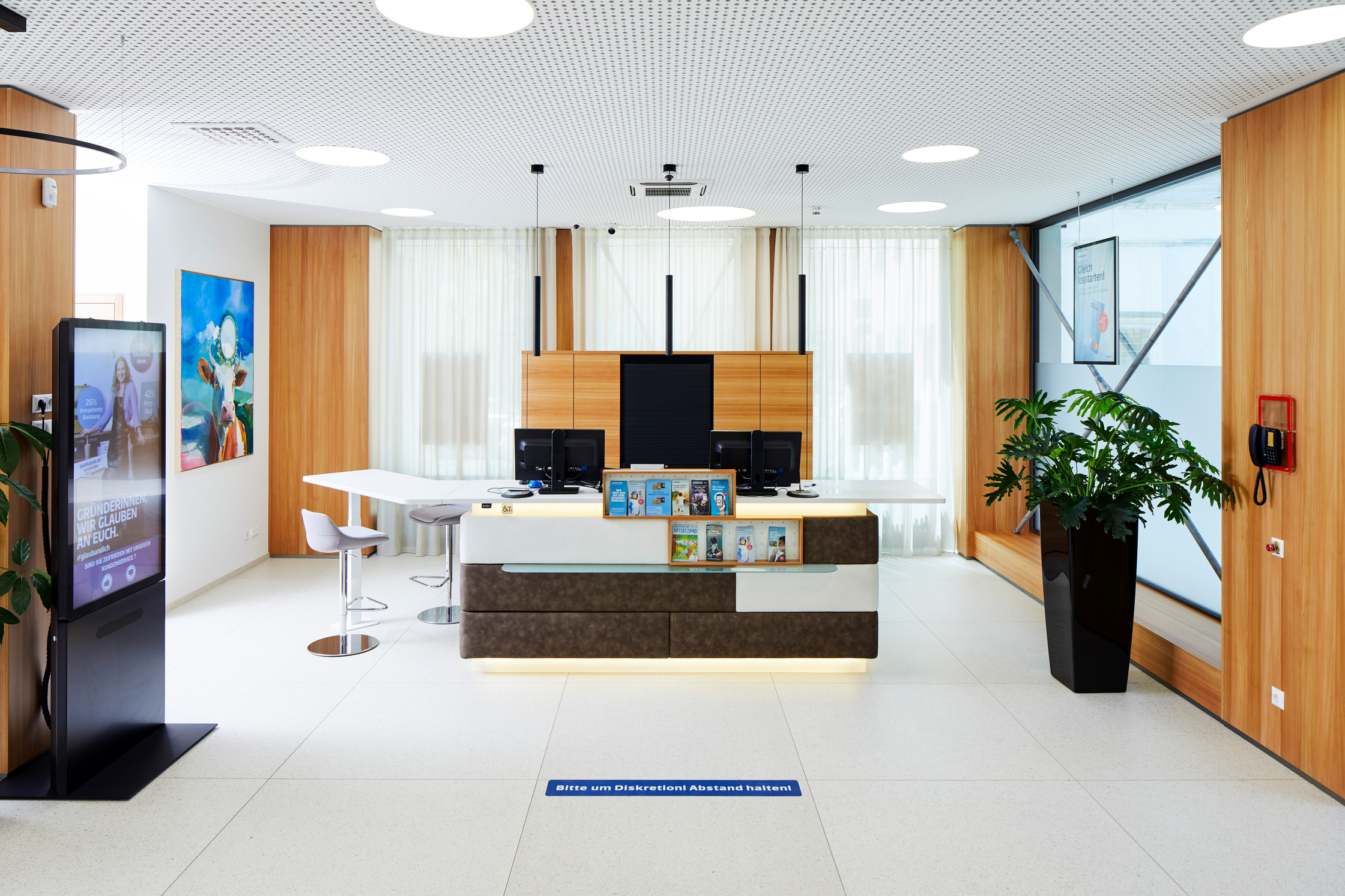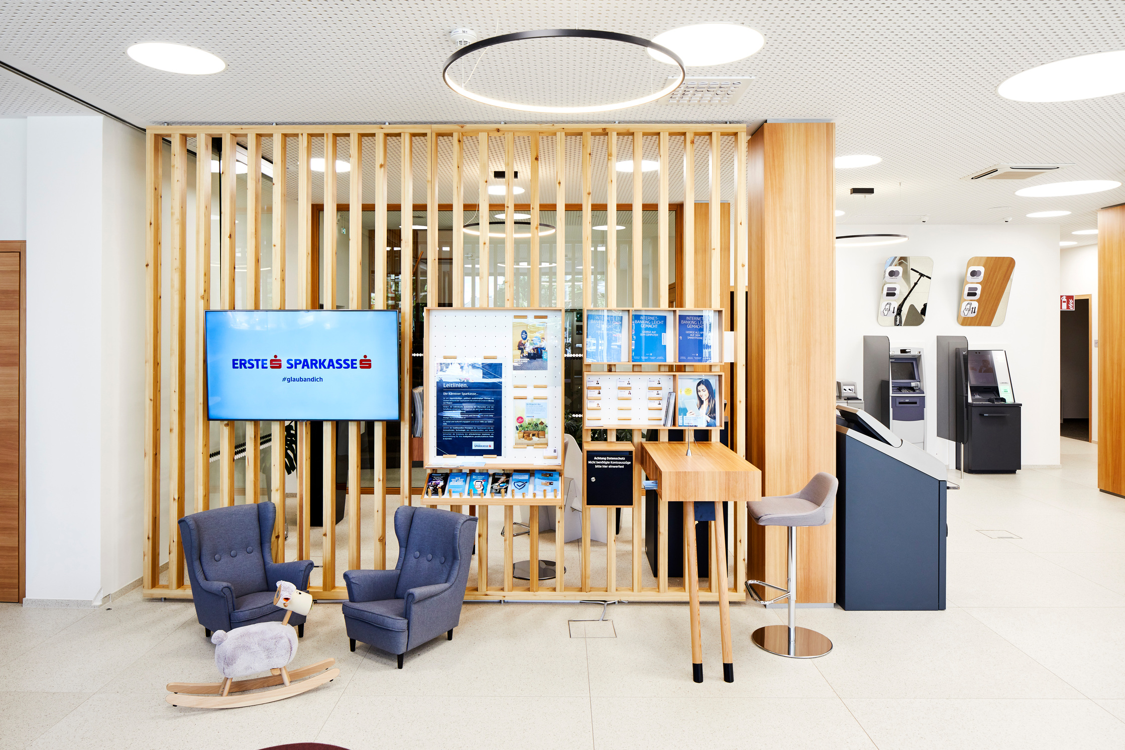 Die neue Beleuchtung der Filiale soll mittels LED Leuchtmittel zur Energieeffizienz beitragen. Durch die neuen Sonnenschutzläden kann der sommerlichen Überhitzung entgegengewirkt werden.