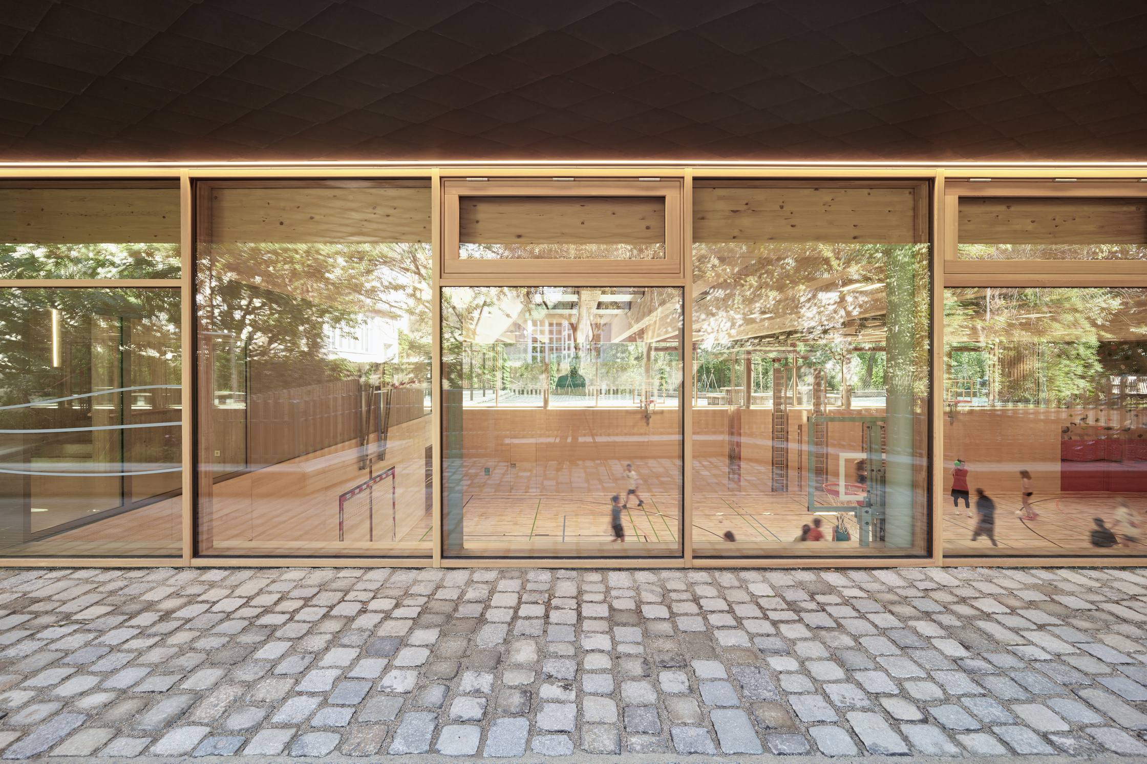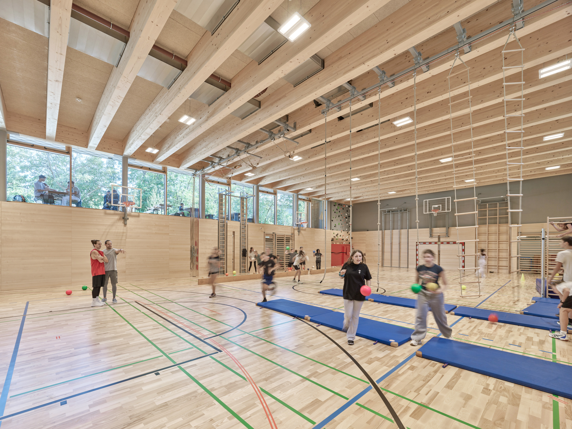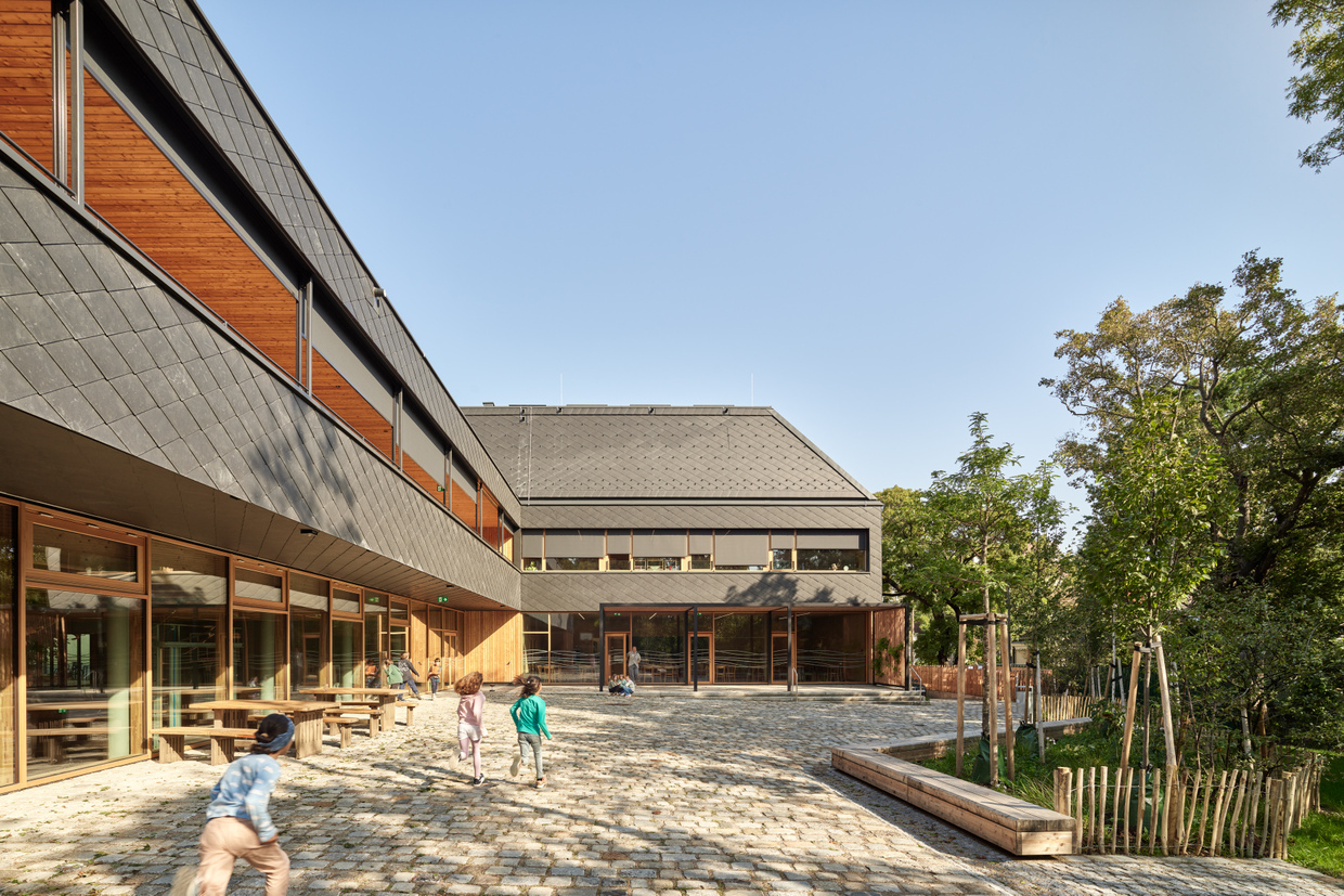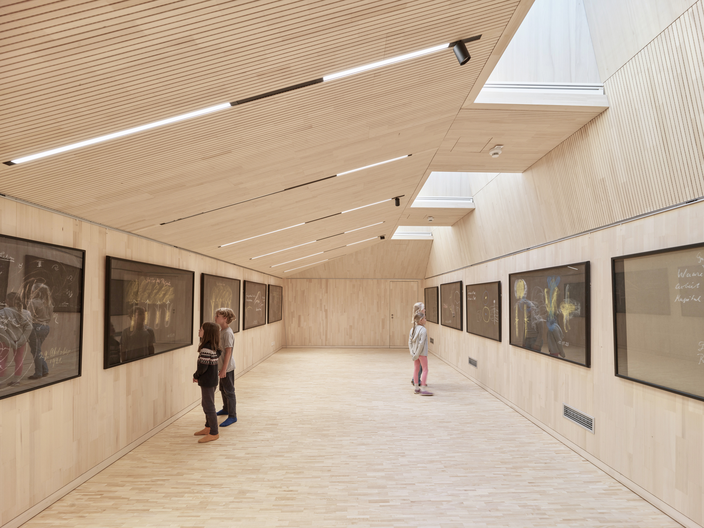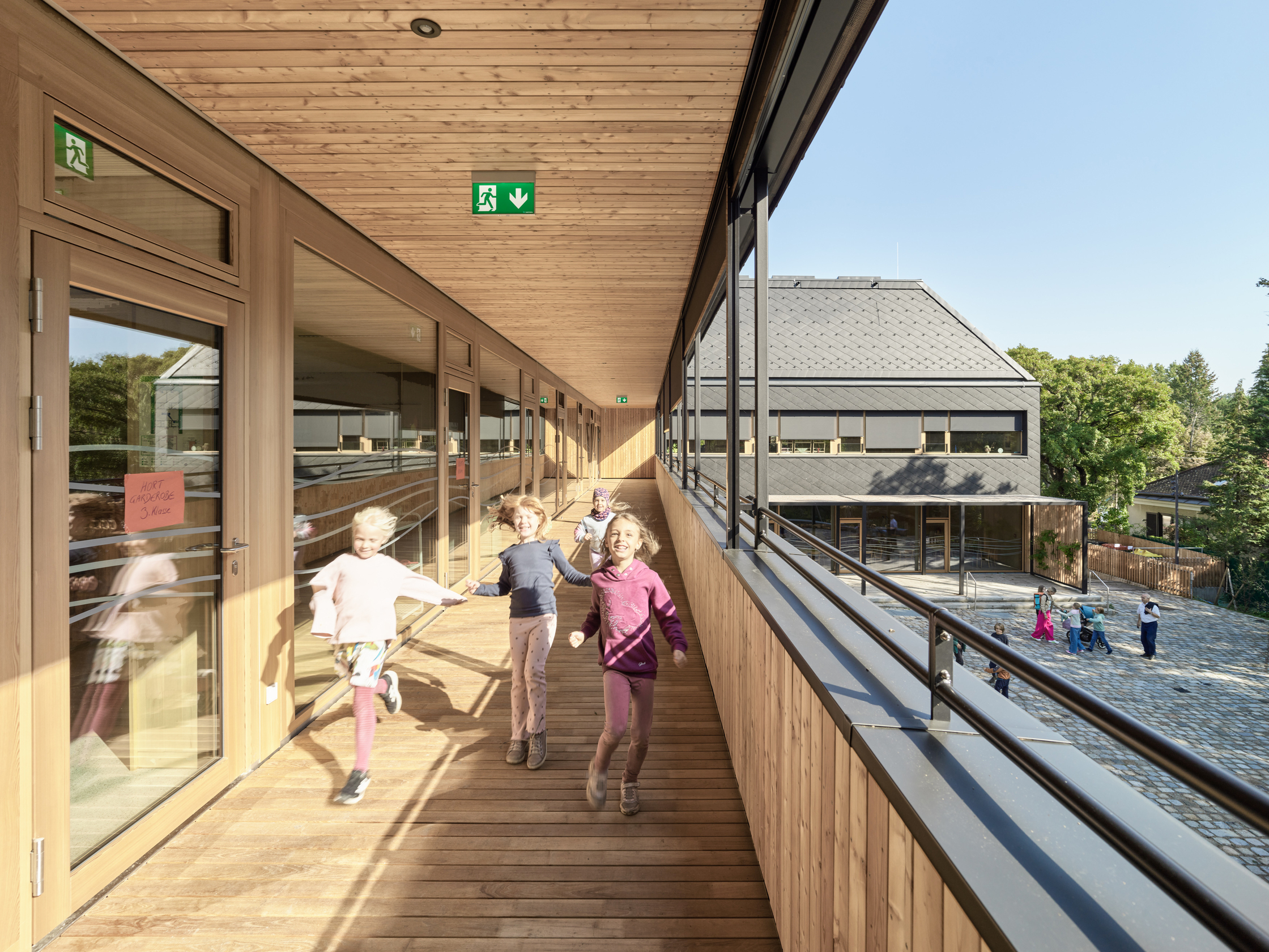 Zum ProduktDer Neubau wurde in Holz aus Rippen- und Hohlkastenelementen errichtet, mit natürlichen Dämmstoffen als Wärmeschutz. Die Holzbauelemente können einfach wieder rückgebaut und recycelt werden.