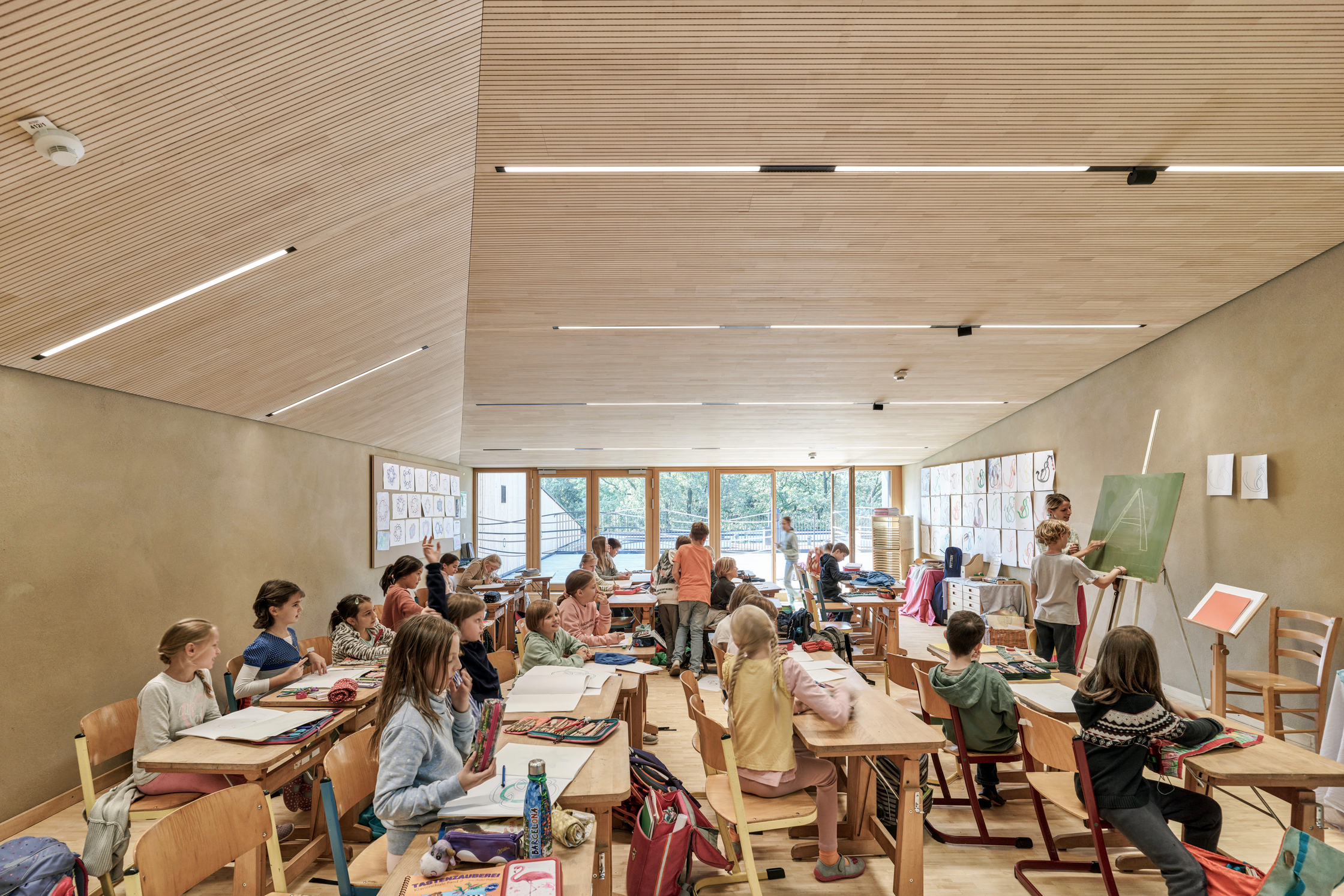 Der Innenausbau erfolgt mit Lehmbauplatten und verputzten Lehmoberflächen. Ziel war es, weitgehend chemiefreie Innenräume zu schaffen. Für die Lehmoberflächen wurde das Aushubmaterial vor Ort verwendet. Holz und Lehm haben eine niedrige Herstellungsenergie und sind regional verfügbar.