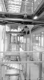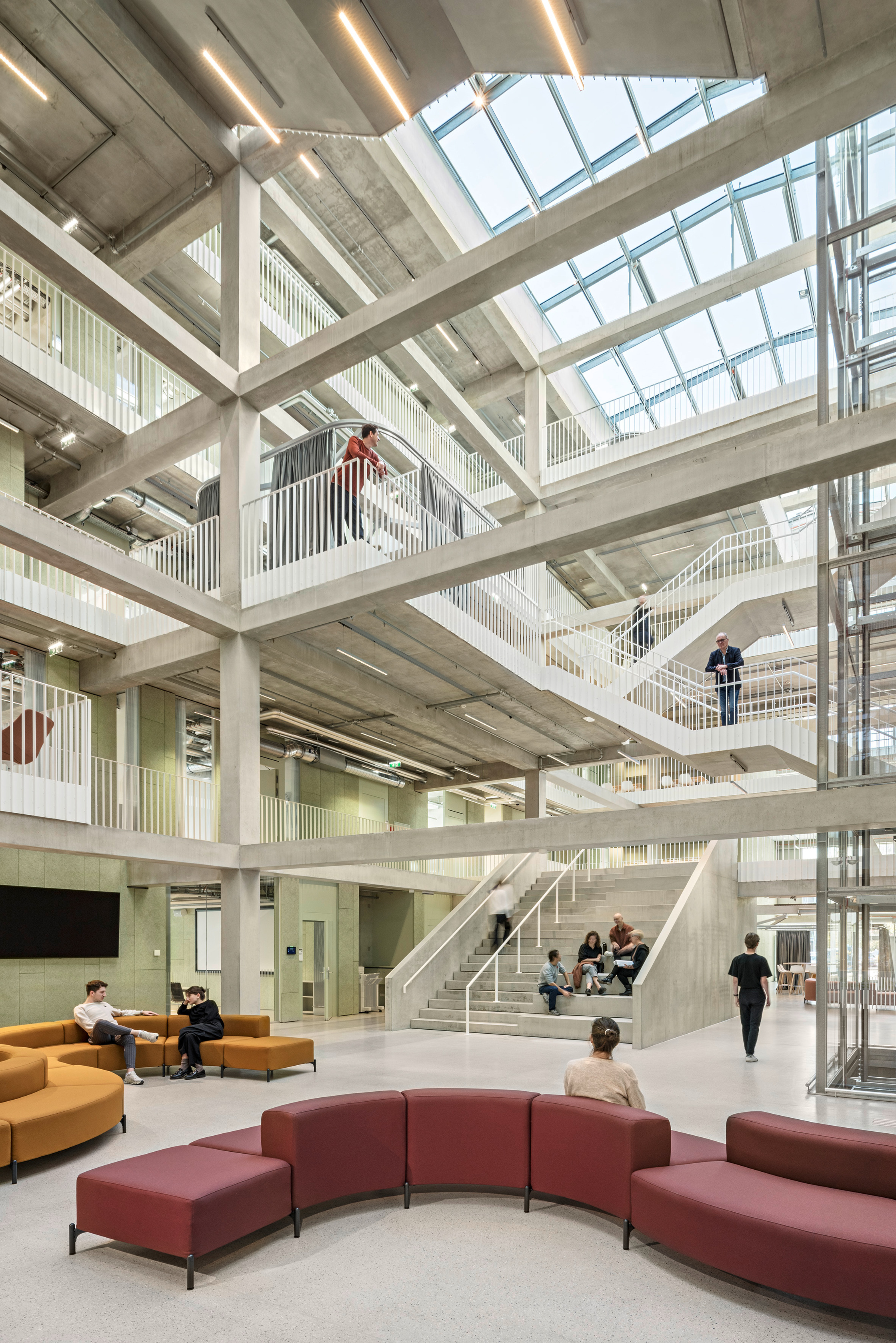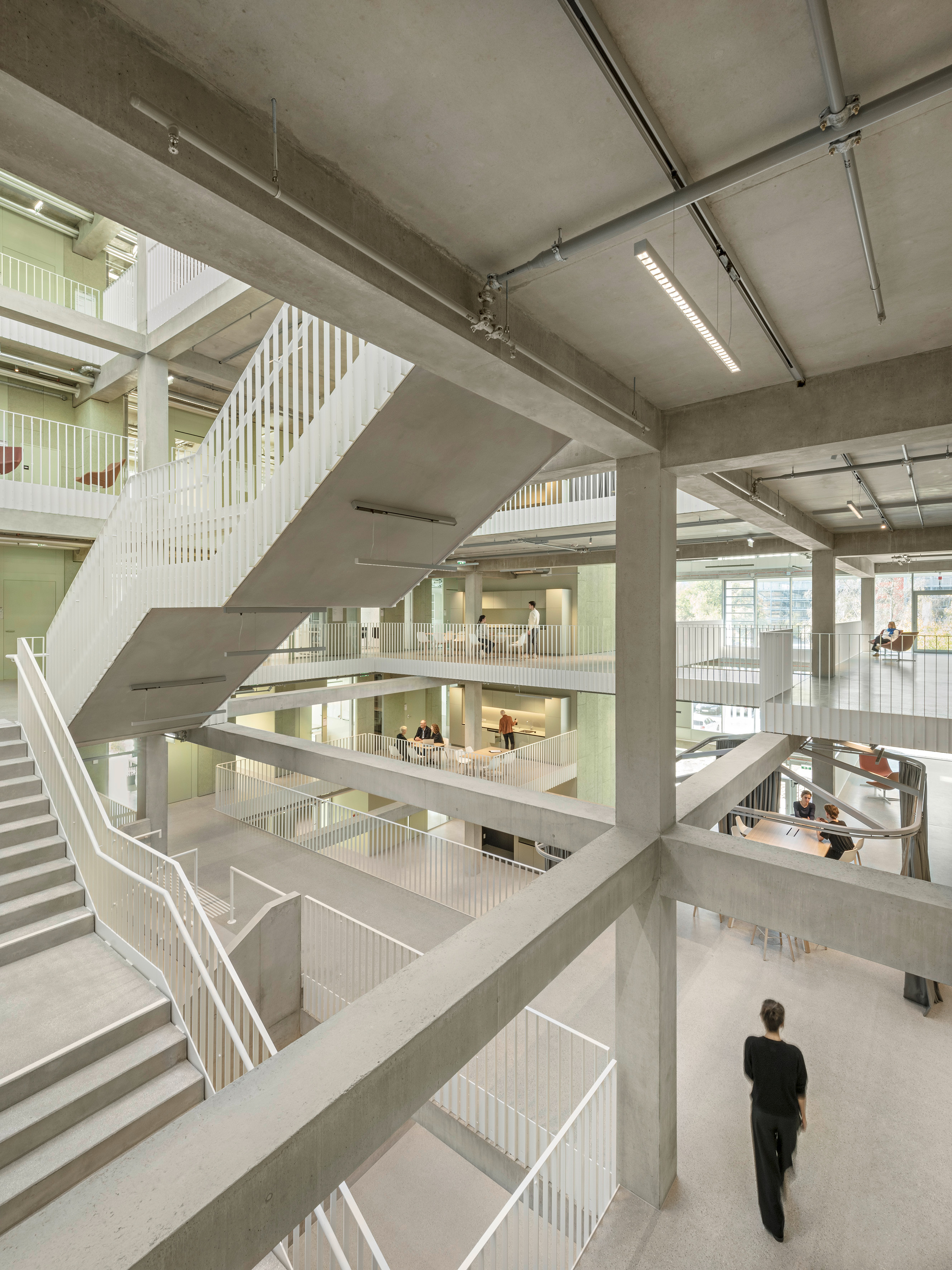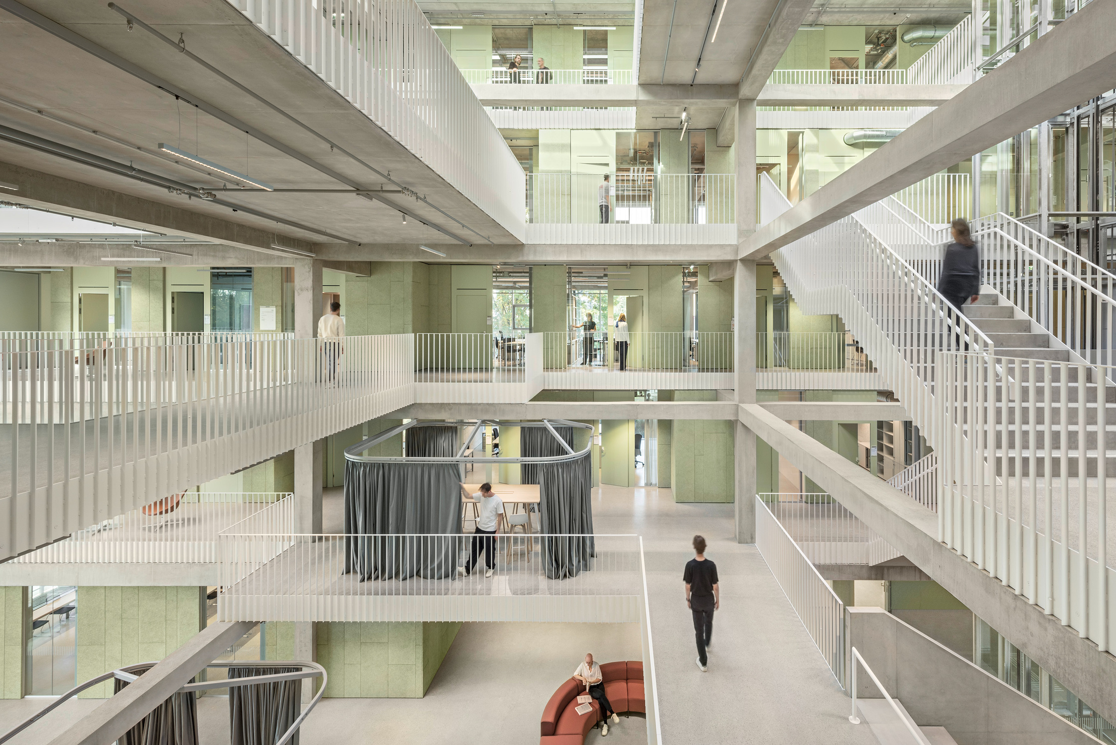 Als Hauptmotivator soll hier der Raum dienen, der sich zwischen den Büros der Forschenden und Lehrenden aufspannt. Ein luftiges Atrium voller Tageslicht, in dem sich Stiegen, Galerien, Podeste und Stege übereinanderschichten, farblich dezent untermalt durch die in Chirurgenkittelgrün gehaltenen Innenwände der Büros. Während die zweischichtige Außenhülle aus weißem Stahl sich um Sonnenschutz und grüne Berankung kümmert, spannt im Inneren ein Stahlbetongerüst mit luftiger Zehn-Meter-Spannweite einen großen Raum auf, in dem man zwanglos an den hier angesiedelten Instituten vorbeiflanieren kann. Ein House für die Schools.
