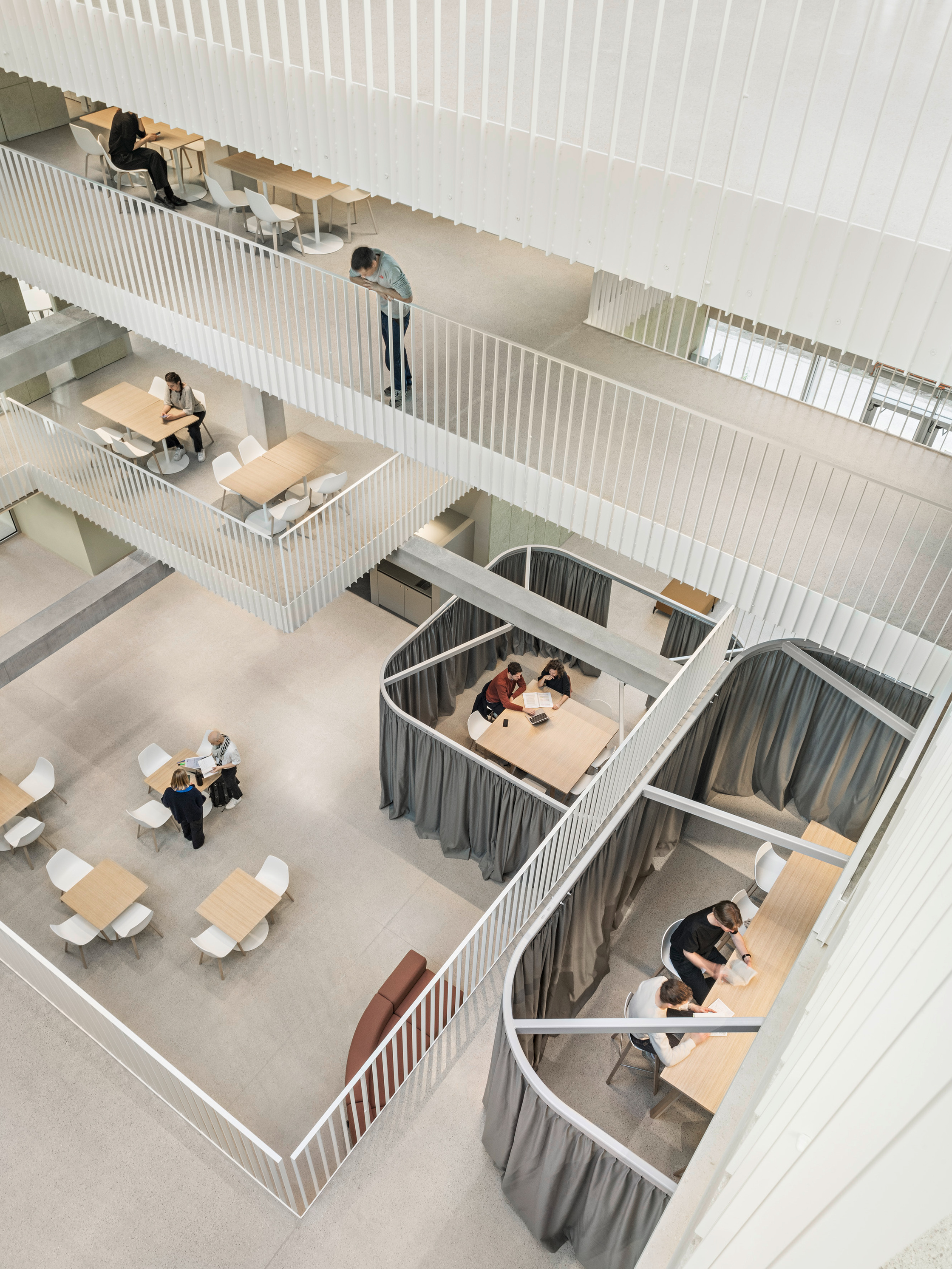 Im Foyer fläzt sich eine Gruppe Studierender entspannt debattierend auf gemütlichen Fauteuils, andere sind am Tisch in ernsthafte Gruppenarbeit vertieft. Aufgefächerte Konzeptpapiere, Fachdialoge in oberösterreichischem Dialekt. Weiter oben besiedeln ovale Besprechungsinseln die Plattformen, bei Benutzung zieht man einfach den Vorhang zu. Klettert man ein Geschoß weiter, kann man von oben hineinspähen. In der Lounge in der vierten Etage zeugt ein offenbar liebevoll gepflegtes Zitronenbäumchen schon von der Aneignung durch die Benutzer. Eine Mischung aus Werkstatt und Wohnzimmer, mit vielen Durchblicken in die Büros und von dort ins Freie.