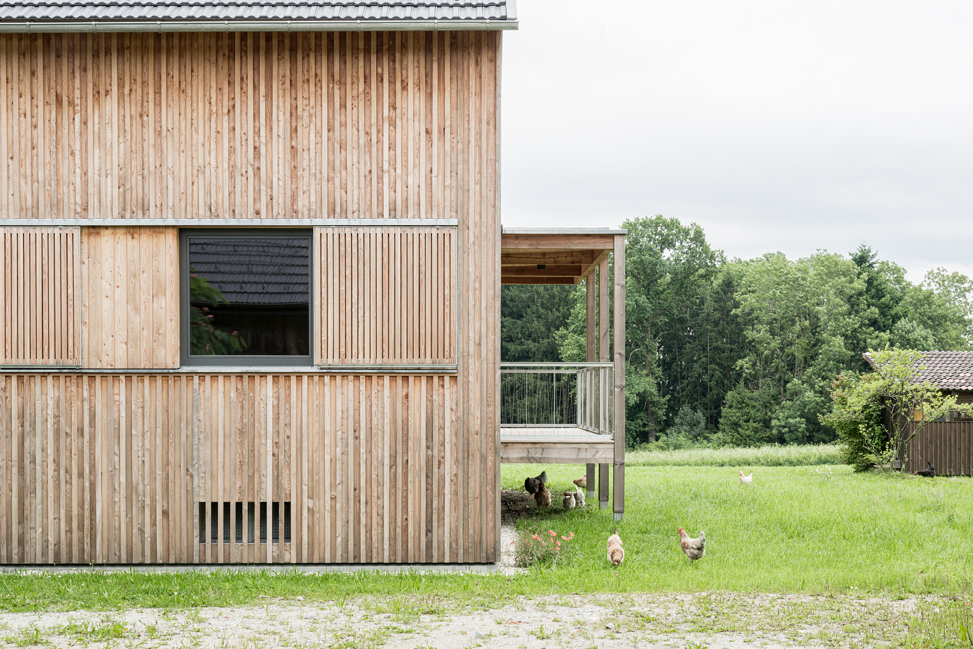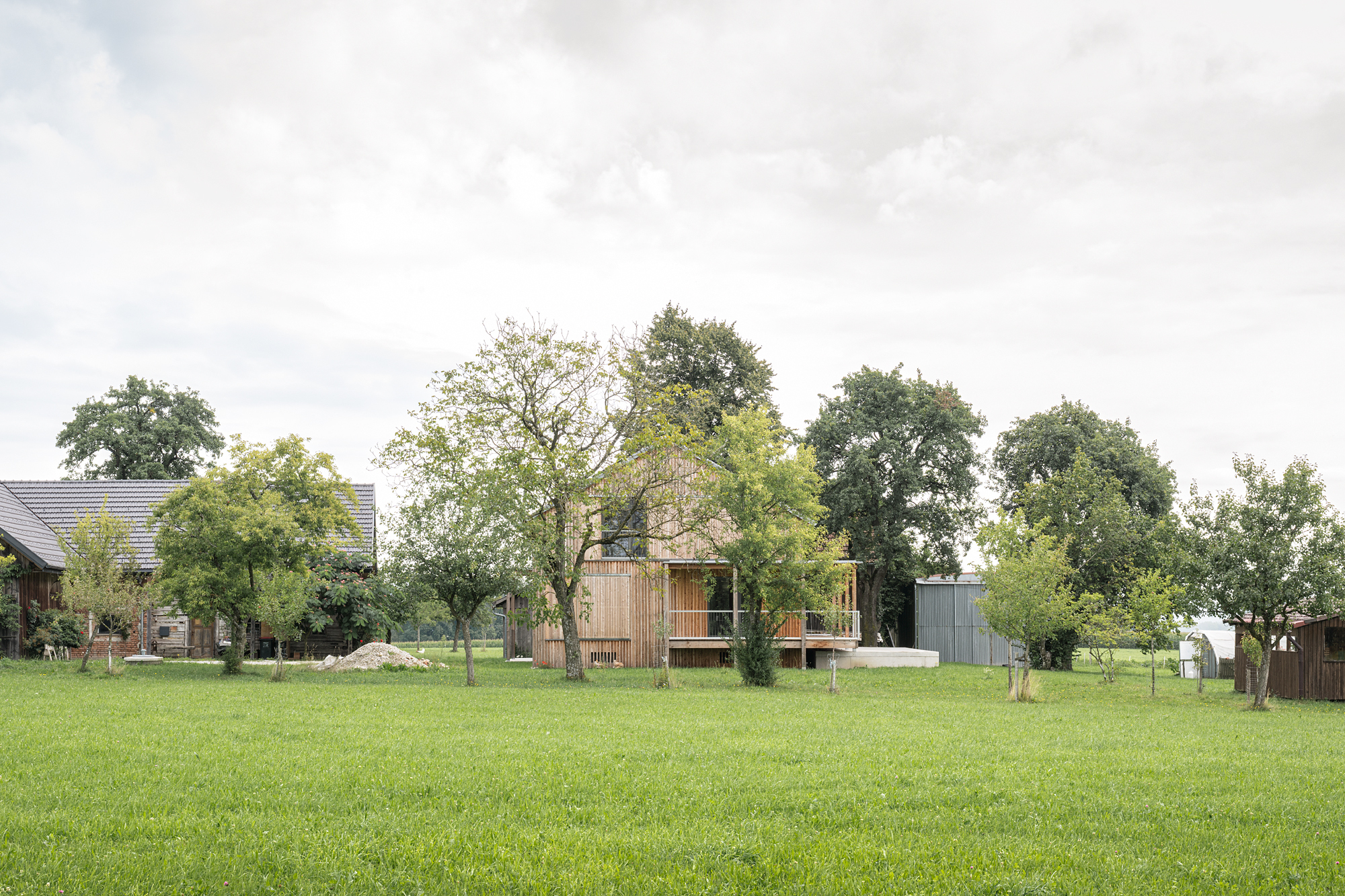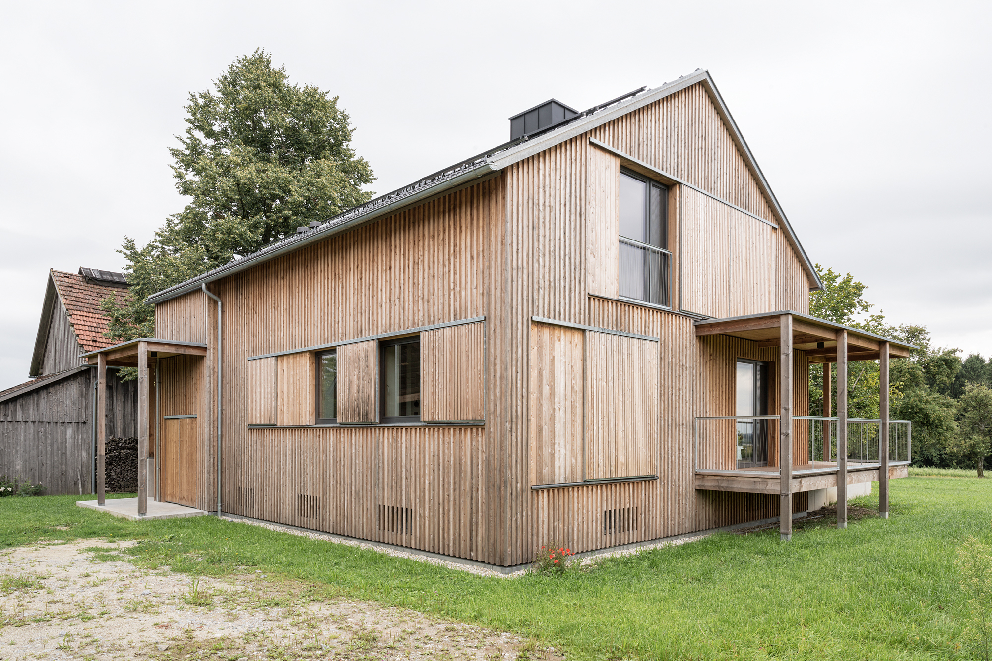 keine weitere Bodenversiegelung, ökologische Baumaterialien (Holzfenster, Holzinnentüren, Lehmputz, Holzfassade sägerauh, Möbel aus dem eigenen Holz etc.);