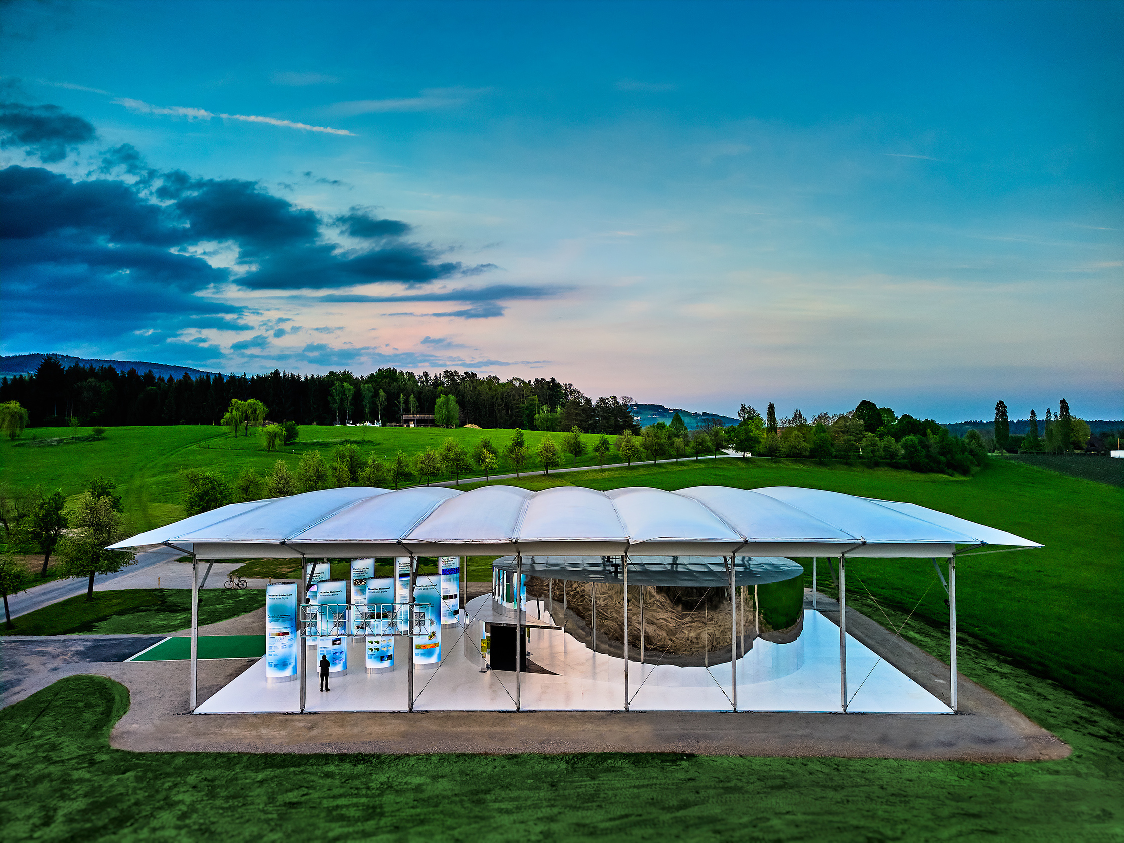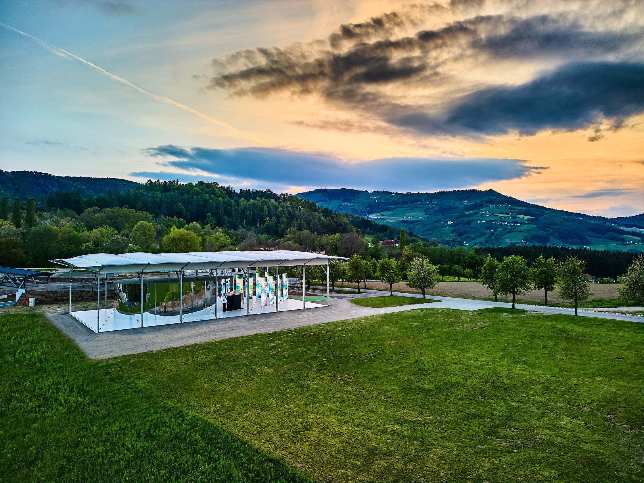 Überdachter Vorbereich mit Bezug zum Stadt- und Naturraum und Black Box für Filmpräsentationen