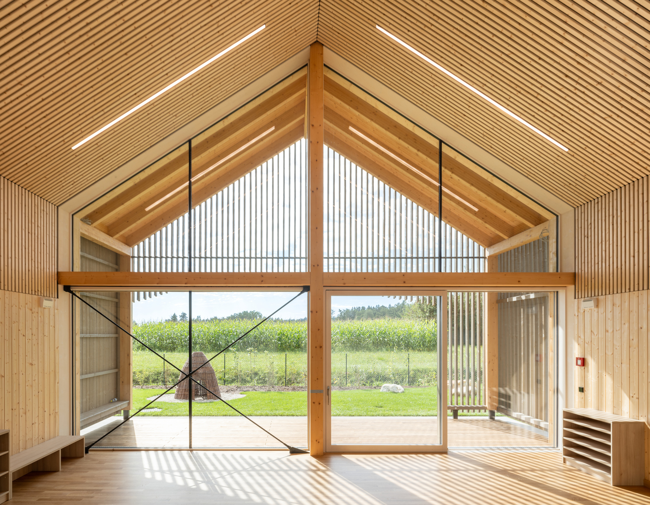 Holz wurde nicht nur als zentrales Konstruktionsmaterial eingesetzt, sondern ist auch im Innenraum sichtbar und sorgt für eine warme, behagliche Atmosphäre.