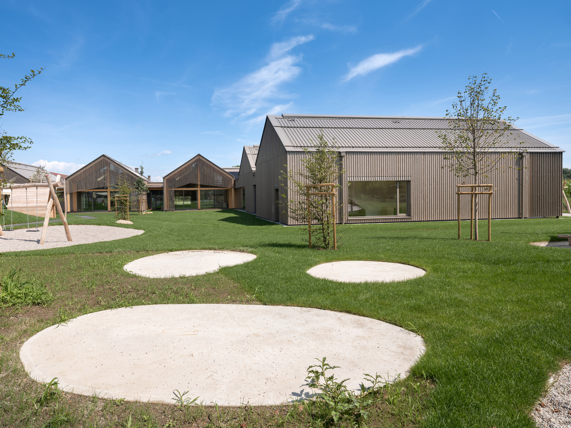 Die Außenanlagen sind eng in das Gesamtkonzept eingebunden und bieten mit naturnahen Spielgeräten, Grünflächen und schattigen Rückzugsorten vielfältige Möglichkeiten für Bewegung, Spiel und Naturerfahrung. Die Gestaltung fördert eine enge Verbindung zur Umwelt und unterstützt das pädagogische Konzept des Hauses in besonderem Maße.