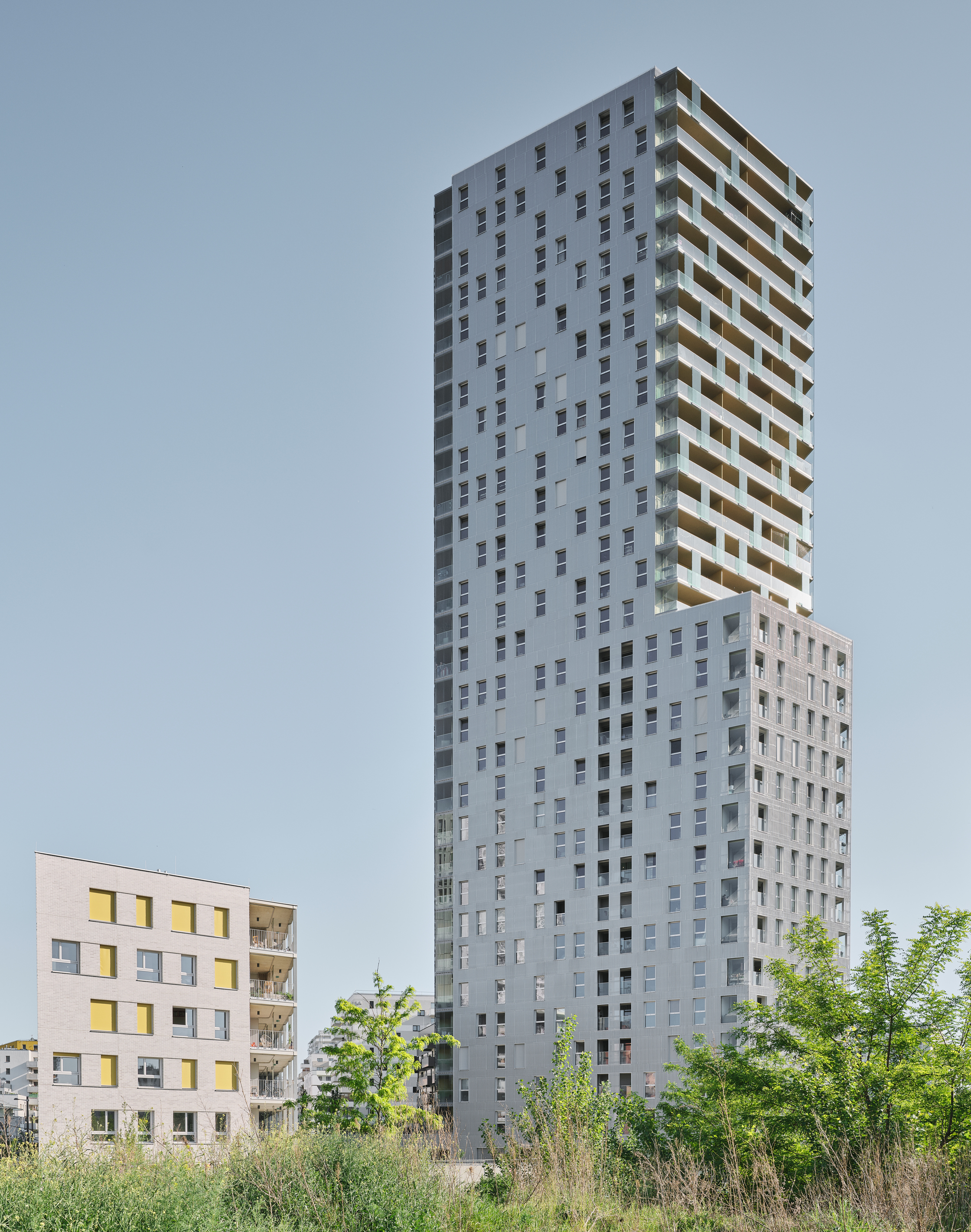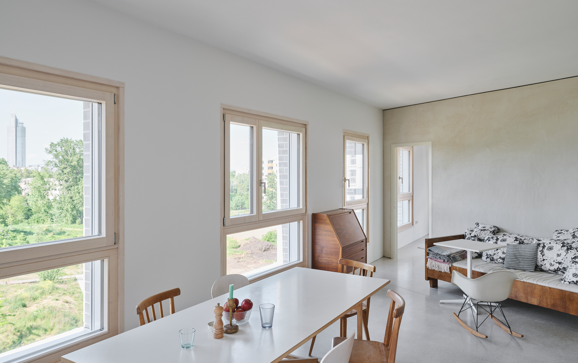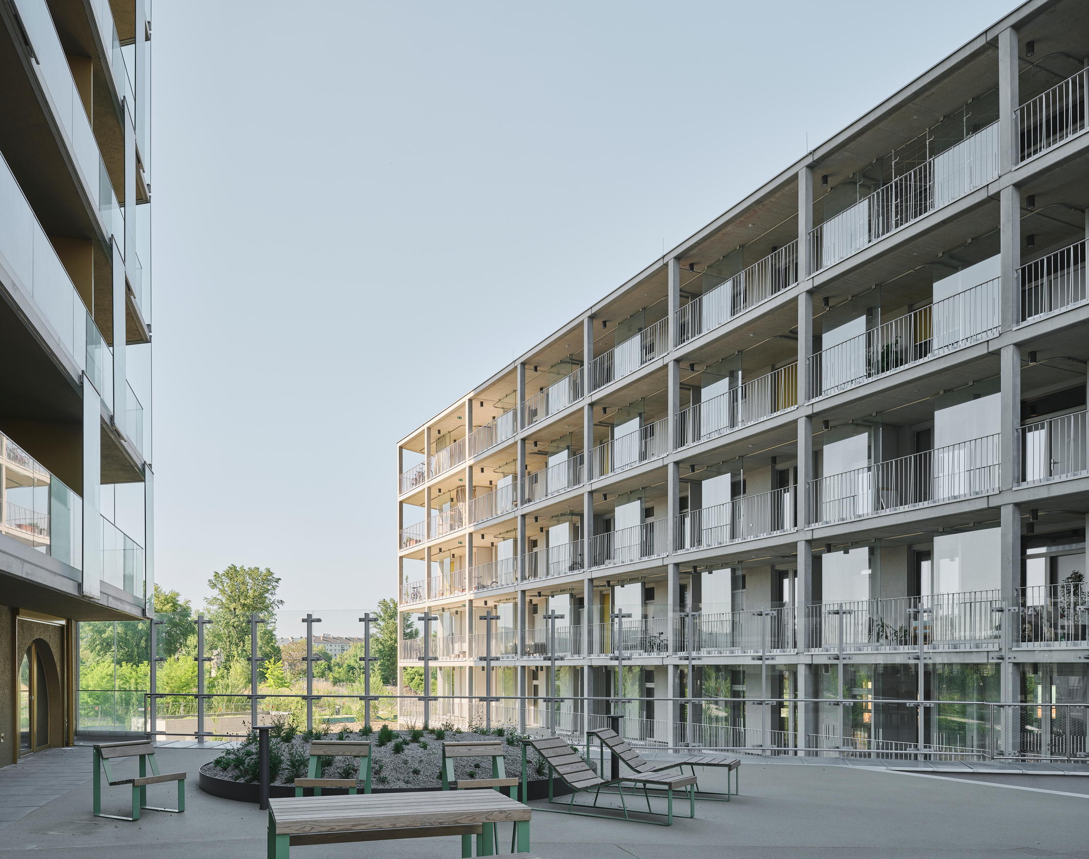 Die gleichzeitige Nutzung der zentralen Schächte sowohl zur Lastabtragung als auch für die technische Versorgung reduziert den Materialeinsatz weiter.