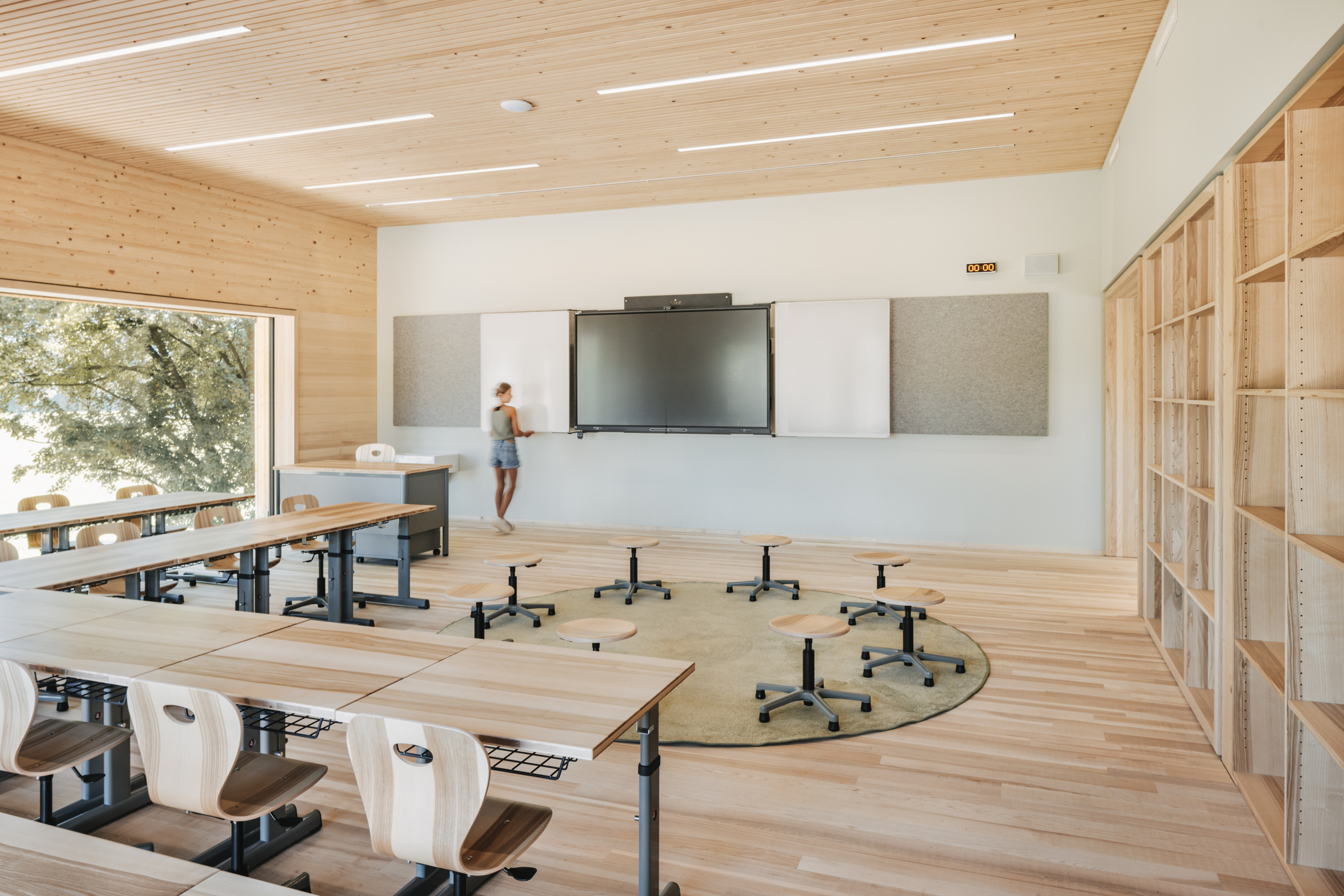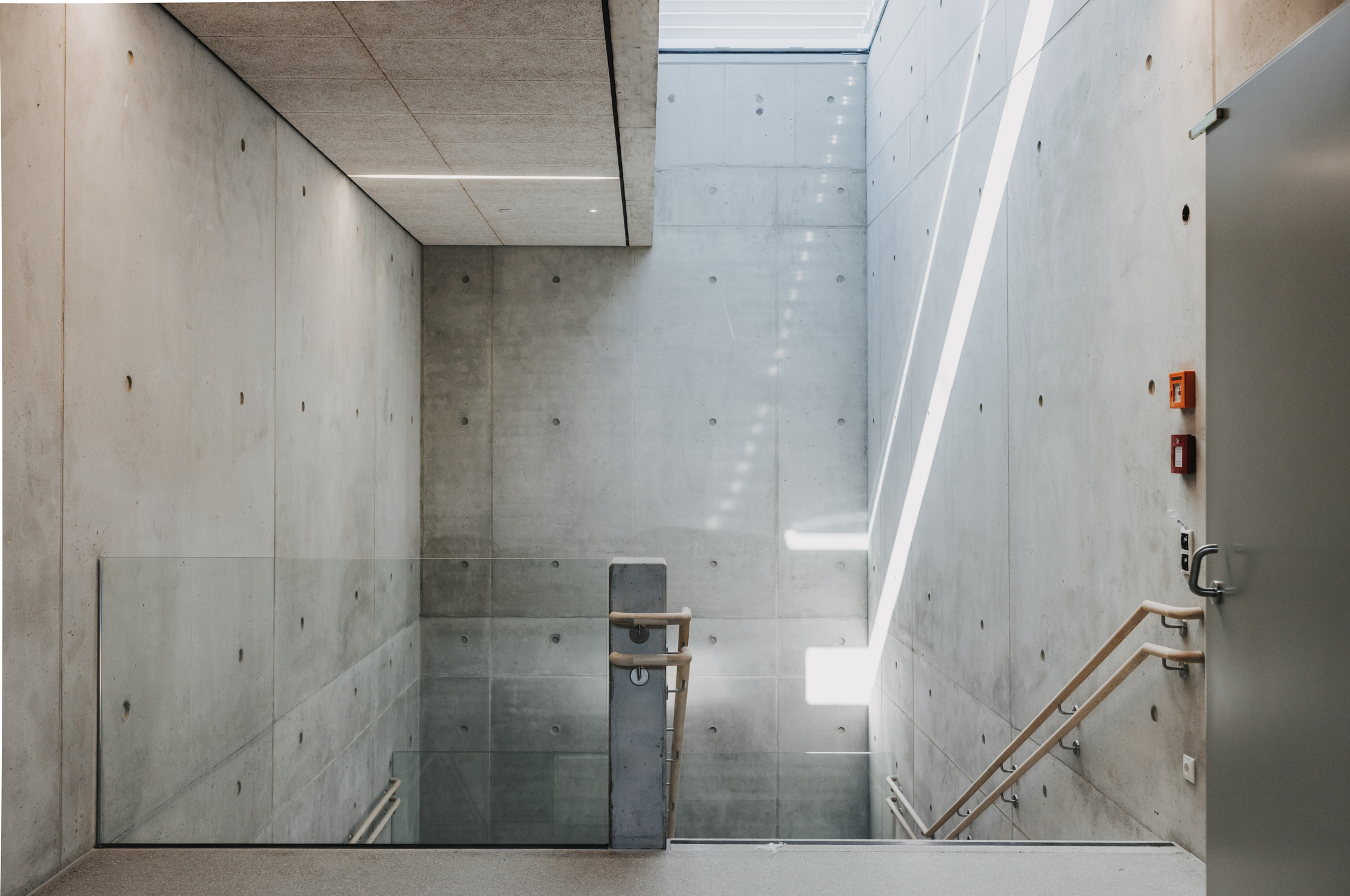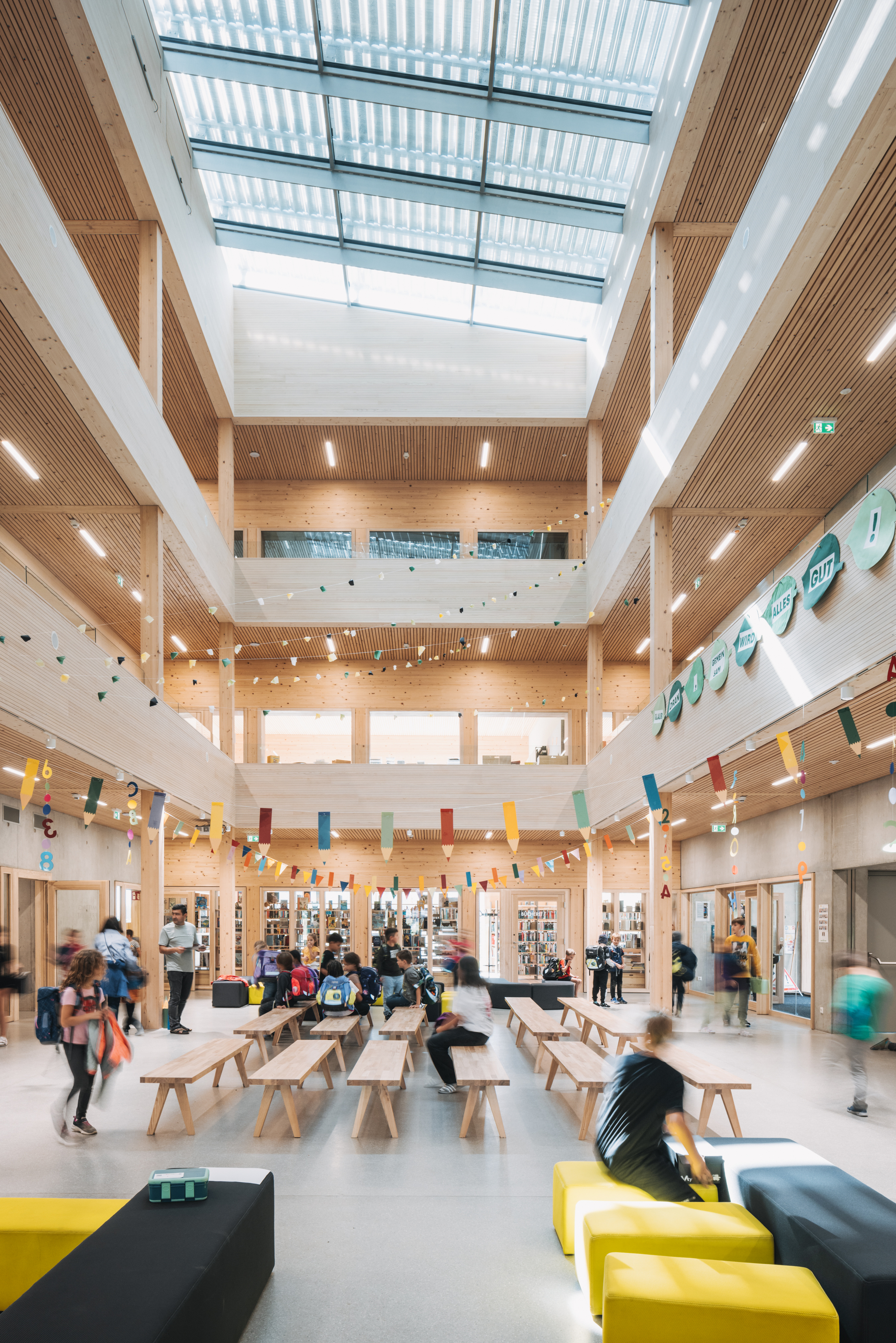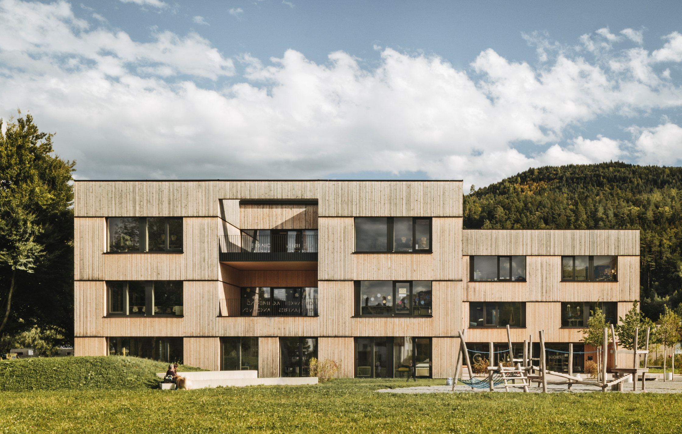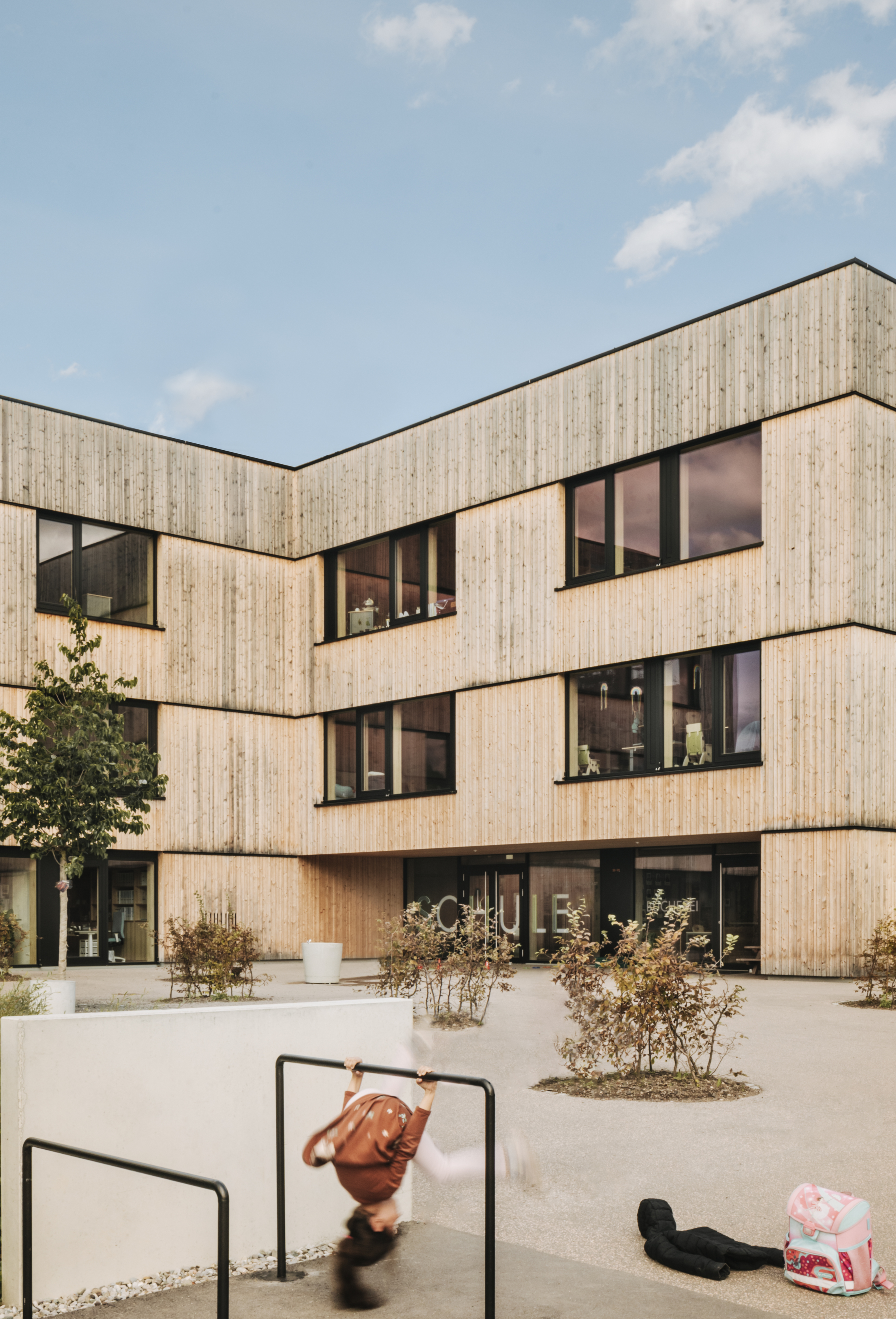 Konstruktion: das Gebäude wurde im Wesentlichen als konstruktiver Holzbau konzipiert. Die Stützen-Träger-Konstruktion ist im Innenraum ablesbar und dient gleichzeitig als Ordnungssystem von Stauraumelementen bzw. Rahmung der Fensterelemente. Die Materialisierung im Innenausbau setzt auf möglichst unbehandelte Oberflächen und Naturmaterialien. Die Fassade besteht aus einem vertikalen, naturbelassenen Holzschirm. Die Dächer sind extensiv begrünt und teilweise als Biodiversitätsdach ausgeführt. Wärmepumpen mit Grundwassernutzung stellen die Energie für die Fußbodenheizungen zur Verfügung. Mit demselben System kann im Sommer eine passive Kühlung ergänzend zur automatisierten Nachtlüftung betrieben werden. Eine kontrollierte Be- u. Entlüftung mit Wärmerückgewinnung sorgt für konstant gute Luftraumqualität. Das Projekt erreicht in Summe insgesamt 954 KGA-Punkte.