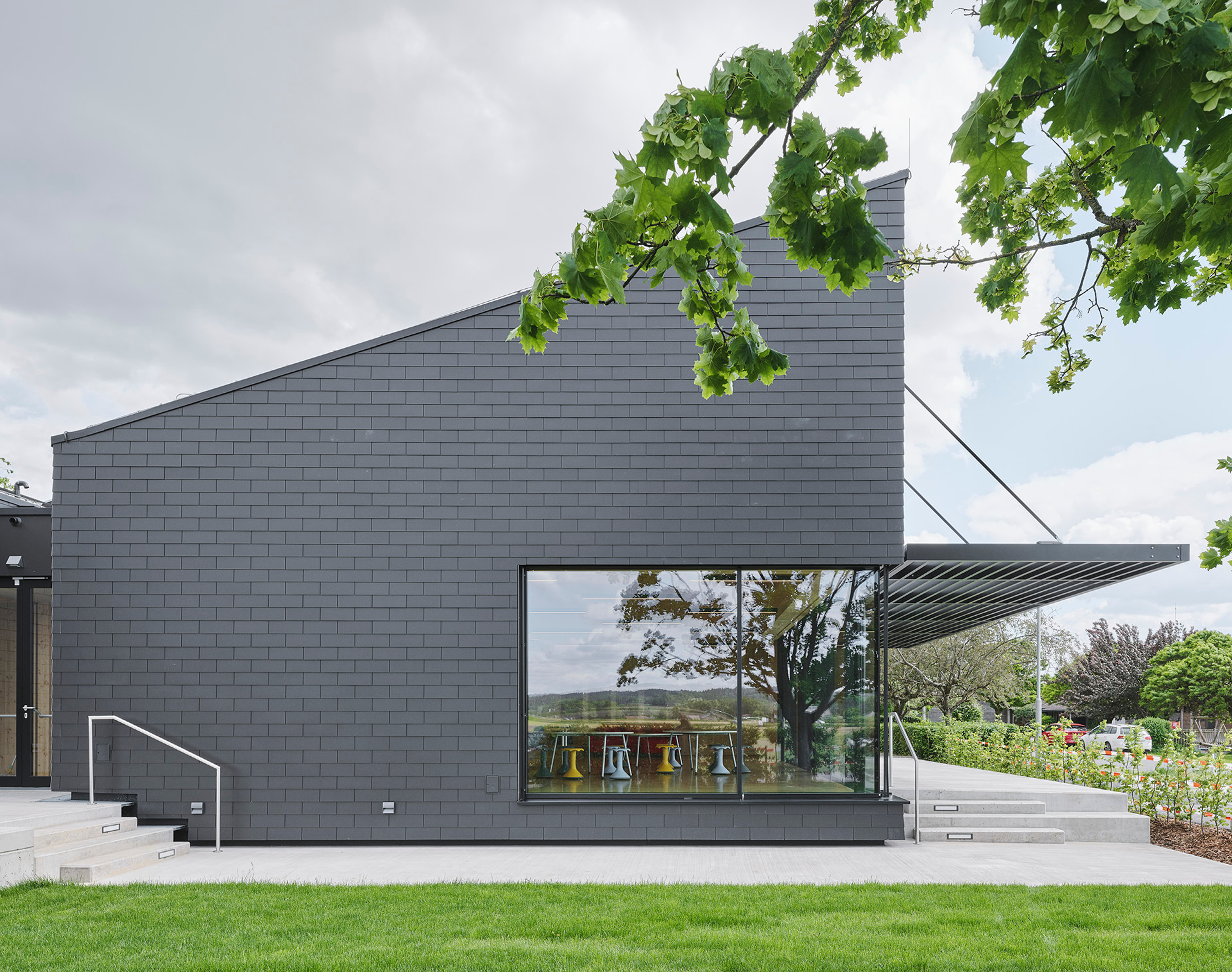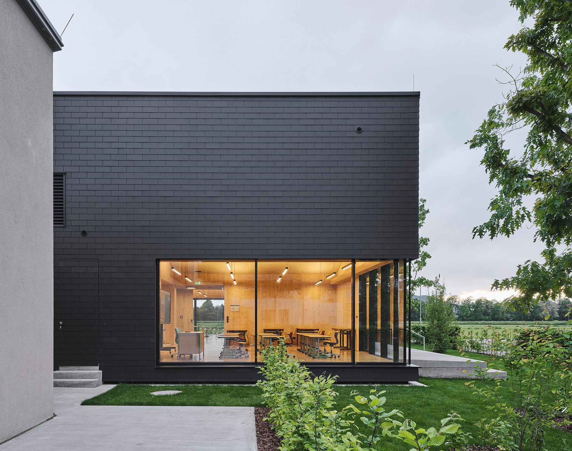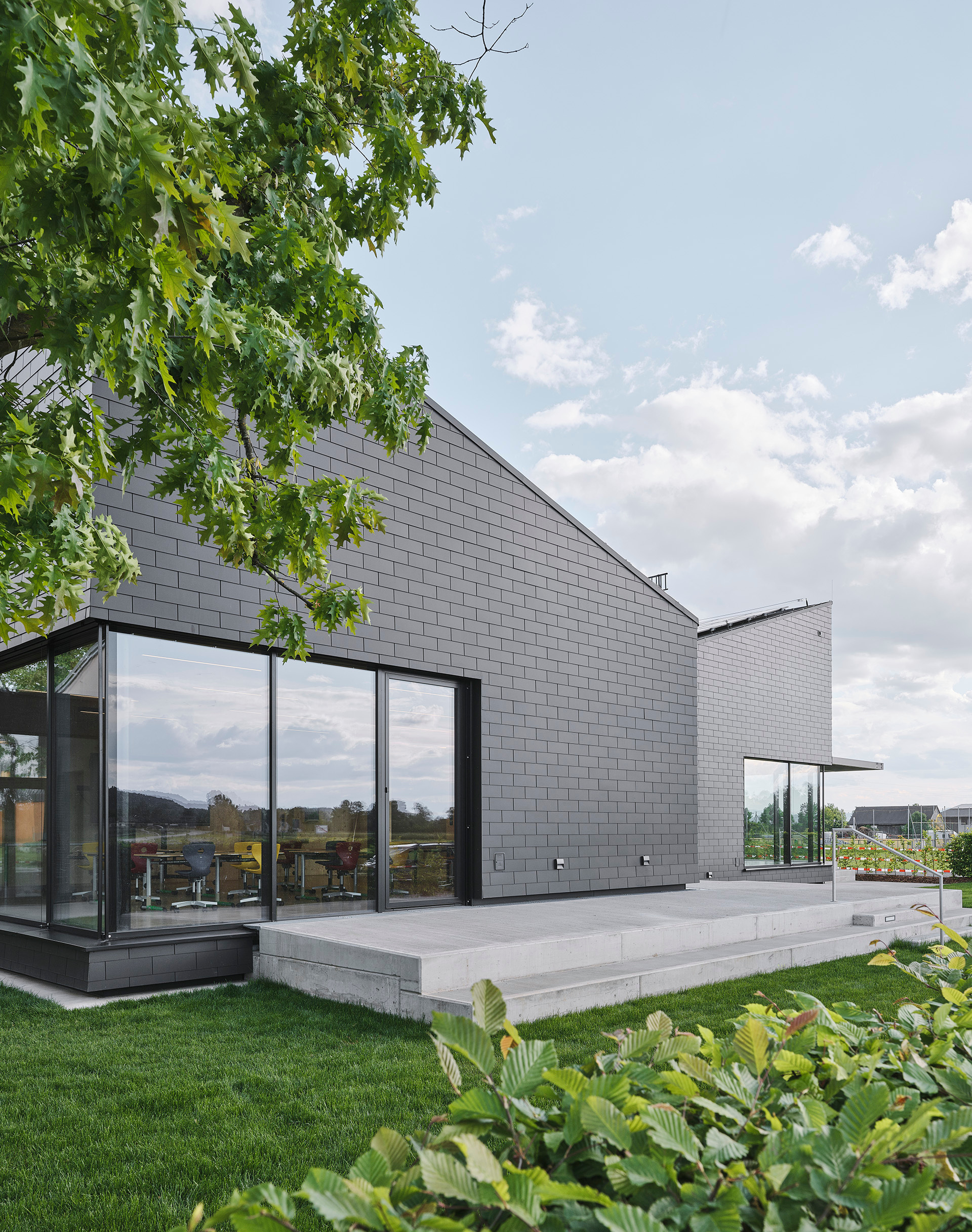 Der Neubau der GTS ist energieautark: Heizung und Kühlung werden mittels Luftwärmepumpe und Fußbodenheizung bereitgestellt, der dazu nötige Strom wird über PV-Module auf den Schrägdächern gewonnen. Überschüssige Stromgewinne werden einem Stromspeicher zugeführt und bei Bedarf zur Beheizung der bestehenden Volksschule (Elektro-Fußbodenheizung) verwendet. Auch eine geplante E-Ladestation im Bereich der bestehenden PKW-Parkplätze kann zukünftig mitversorgt werden.