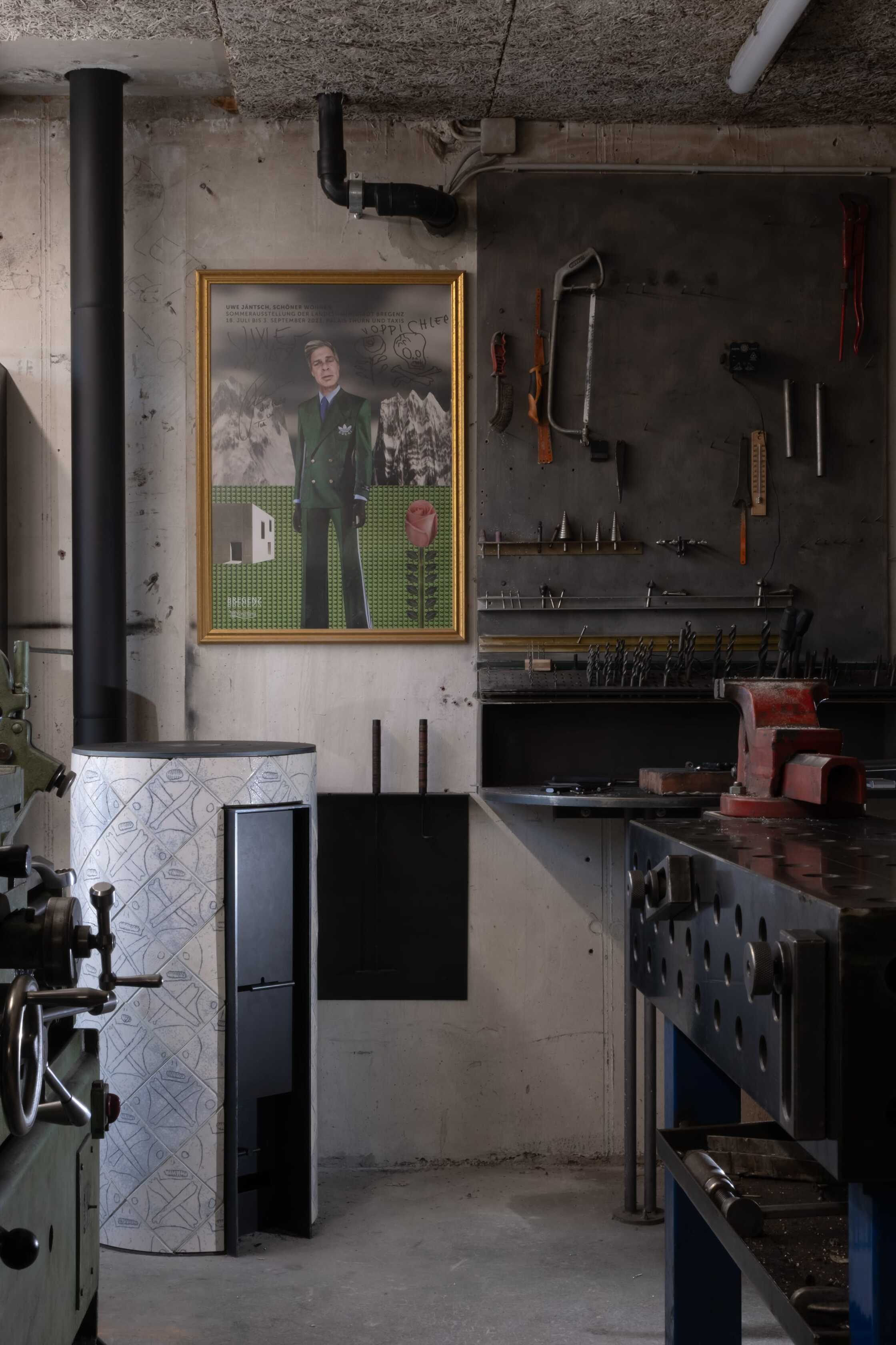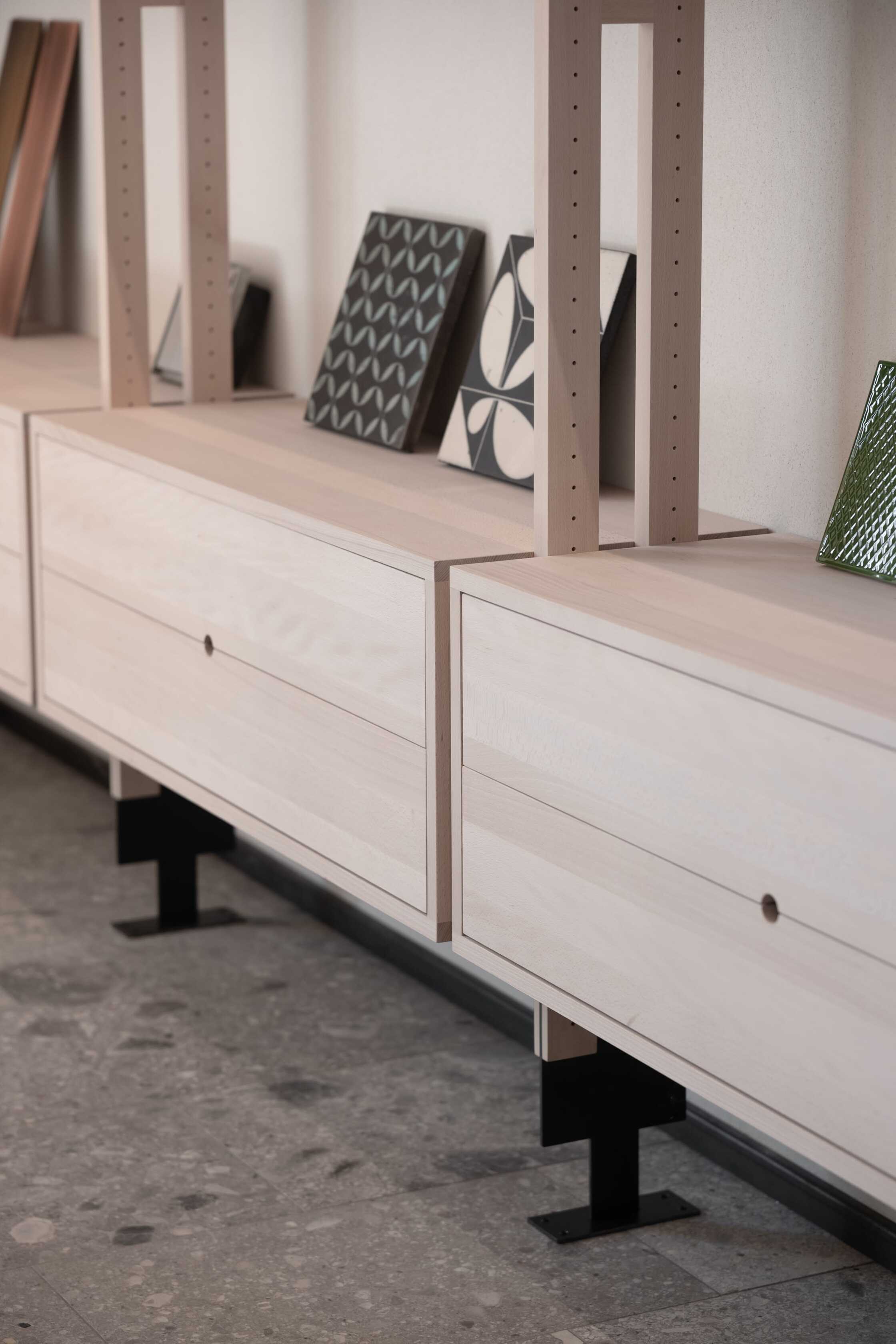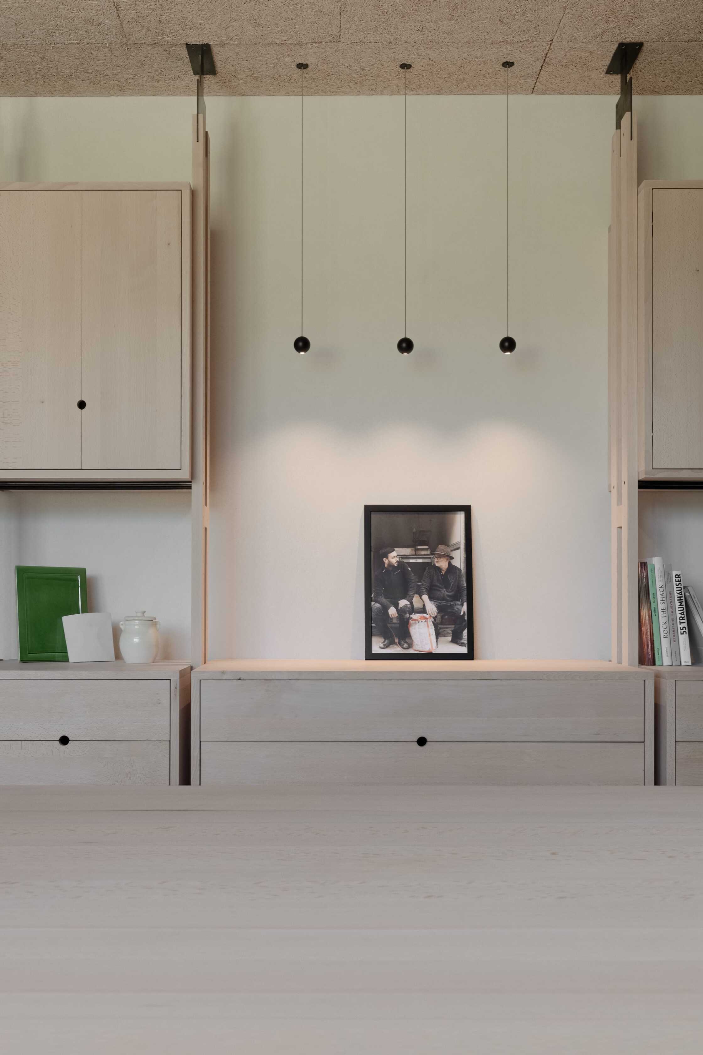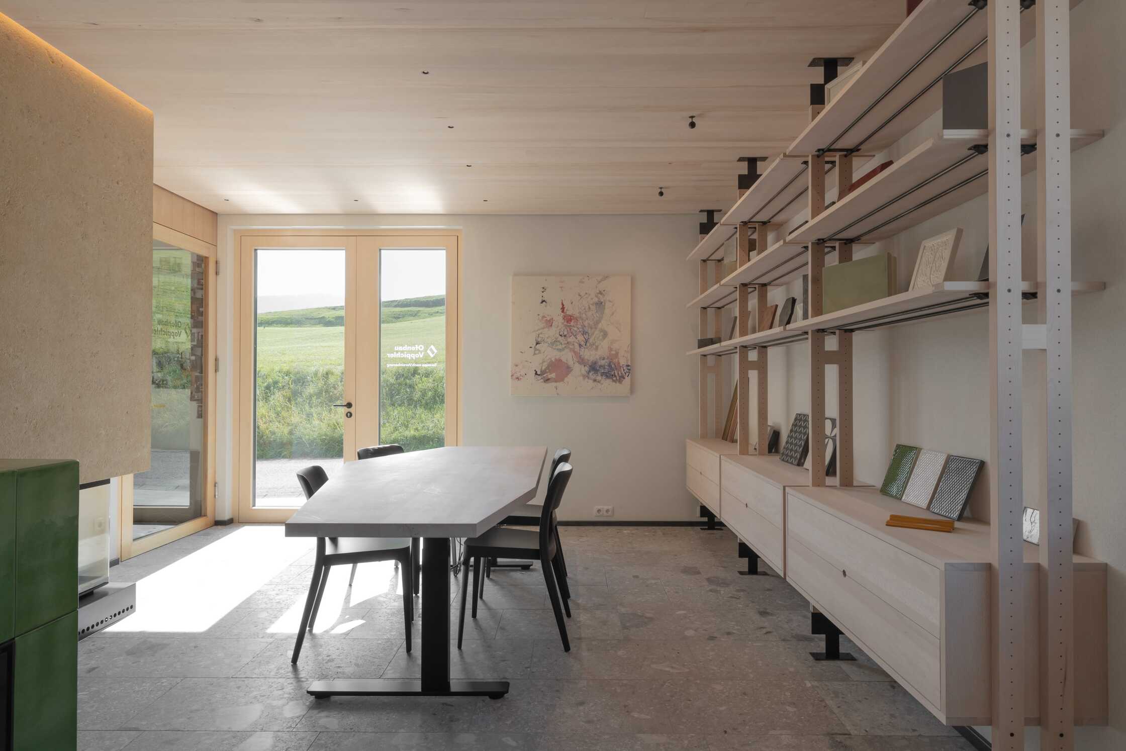 Ein besonderes Augenmerk lag auf der Auswahl der Materialien und deren Ausführung. Alle neu eingebauten Elemente aus Holz wurden im eigenen Wald geschlagen und in der Säge im Ort vorbereitet. Fichte als Konstruktions- und Fassadenholz sowie Buche für Oberflächen und Möbel im Innenraum prägen die Sanierung des Objektes. Alle neu eingebauten Elemente hatten zudem den Anspruch und die Anforderung, dass sie sortenrein verwendet, geschraubt und somit wiederverwendet werden können. Ein Regalsystem, das diesen Grundgedanken verfolgte, wurde eigens für den Betrieb zusammen mit der Bauherrschaft, befreundeten Handwerkern und der Planung entwickelt und im gesamten Gebäude verbaut.