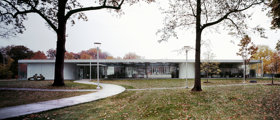 Die Wirkungsweise der 46 m weit spannenden Brückenkonstruktion lässt sich auf zwei substanzielle Elemente abstrahieren: eine gefaltete Platte als stützender Sockel – der eigentliche «Torbogen» – und die Wandscheiben (vgl. Abb.). Die beiden 45 und 27 Grad geneigten Druckplatten des «Torbogens» sind an ihren Füssen über die Decke des Untergeschosses miteinander verbunden. Diese Untergeschossdecke als Bodenplatte in der Verbindung zum Park ist vorgespannt und funktioniert statisch als Zugband. Die Decke ist somit Raumabschluss und Tragelement zugleich.