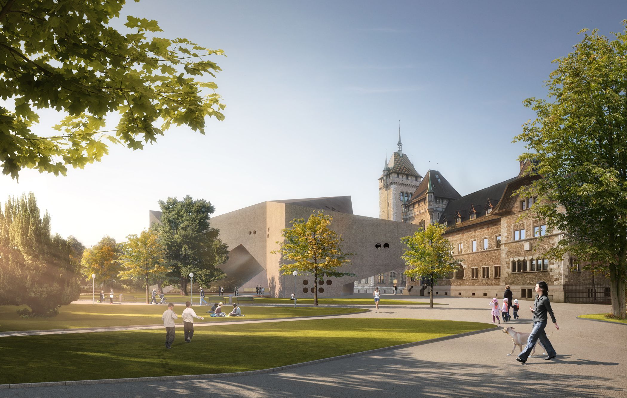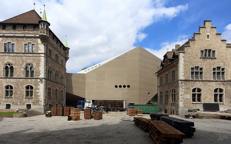 Die Umbauarbeiten am Landesmuseum Zürich auf der Halbinsel zwischen Limmat und Sihl hinter dem Hauptbahnhof haben einen Meilenstein erreicht: Nach 15 Jahren Ausschreibung, Wettbewerb[1], Planung, Vor- und Bauprojekt sowie Ausführung ist der fünfgeschossige Erweiterungsbau von Christ & Gantenbein Architekten seit Juli 2016 eröffnet. Die in Grund- und Aufriss mehrfach geknickte Erweiterung dockt an den Bestand von 1898 an und schliesst den U-förmigen Haupttrakt des Altbaus von Gustav Gull. Sie behebt den Platzmangel des Museums – Ausstellungsflächen, eine Bibliothek und ein Auditorium für öffentliche Veranstaltungen finden darin Platz – und ermöglicht erstmals einen Rundlauf durch alle Ausstellungsräume.