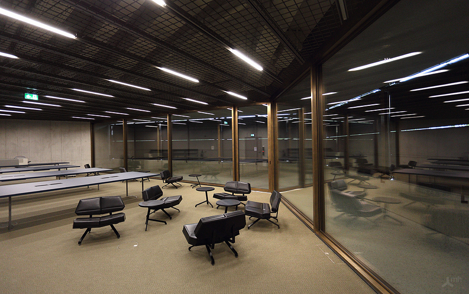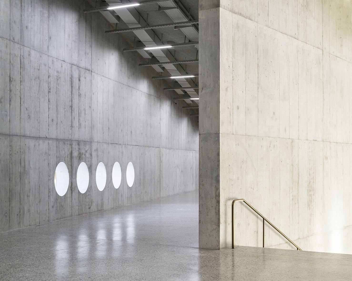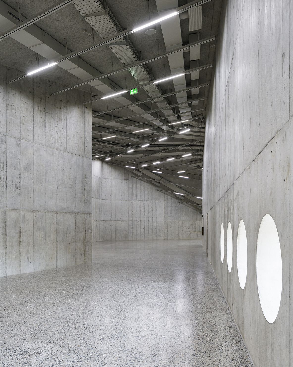 Beidseitig dockt die Erweiterung zwar wie eine Landungsbrücke am West- und Ostflügel des bestehenden Baus an. Doch weil die bestehende Bausubstanz und ihre Fundation nicht für zusätzliche Lasten ausgelegt sind und um aufwendige Verstärkungsmassnahmen im Altbau zu verhindern, überträgt der Neubau keine Lasten: Der flach mit partiellen Vertiefungen fundierte Massivbau, der durch die Betonscheiben der Aussen-, Treppen- und Liftwände horizontal ausgesteift ist, steht grundsätzlich nur auf zwei Füssen und kragt gegen den Altbau beidseitig aus – am einen Ende mit einer Auskragung, die einen zweiten Durchgang kreiert, am anderen Ende – weil so kurz – nur im statischen System sichtbar.