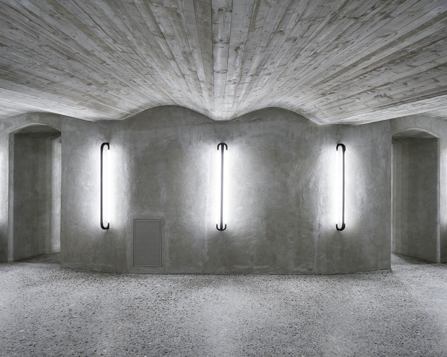 Die Wirkungsweise der 46 m weit spannenden Brückenkonstruktion lässt sich auf zwei substanzielle Elemente abstrahieren: eine gefaltete Platte als stützender Sockel – der eigentliche «Torbogen» – und die Wandscheiben (vgl. Abb.). Die beiden 45 und 27 Grad geneigten Druckplatten des «Torbogens» sind an ihren Füssen über die Decke des Untergeschosses miteinander verbunden. Diese Untergeschossdecke als Bodenplatte in der Verbindung zum Park ist vorgespannt und funktioniert statisch als Zugband. Die Decke ist somit Raumabschluss und Tragelement zugleich.