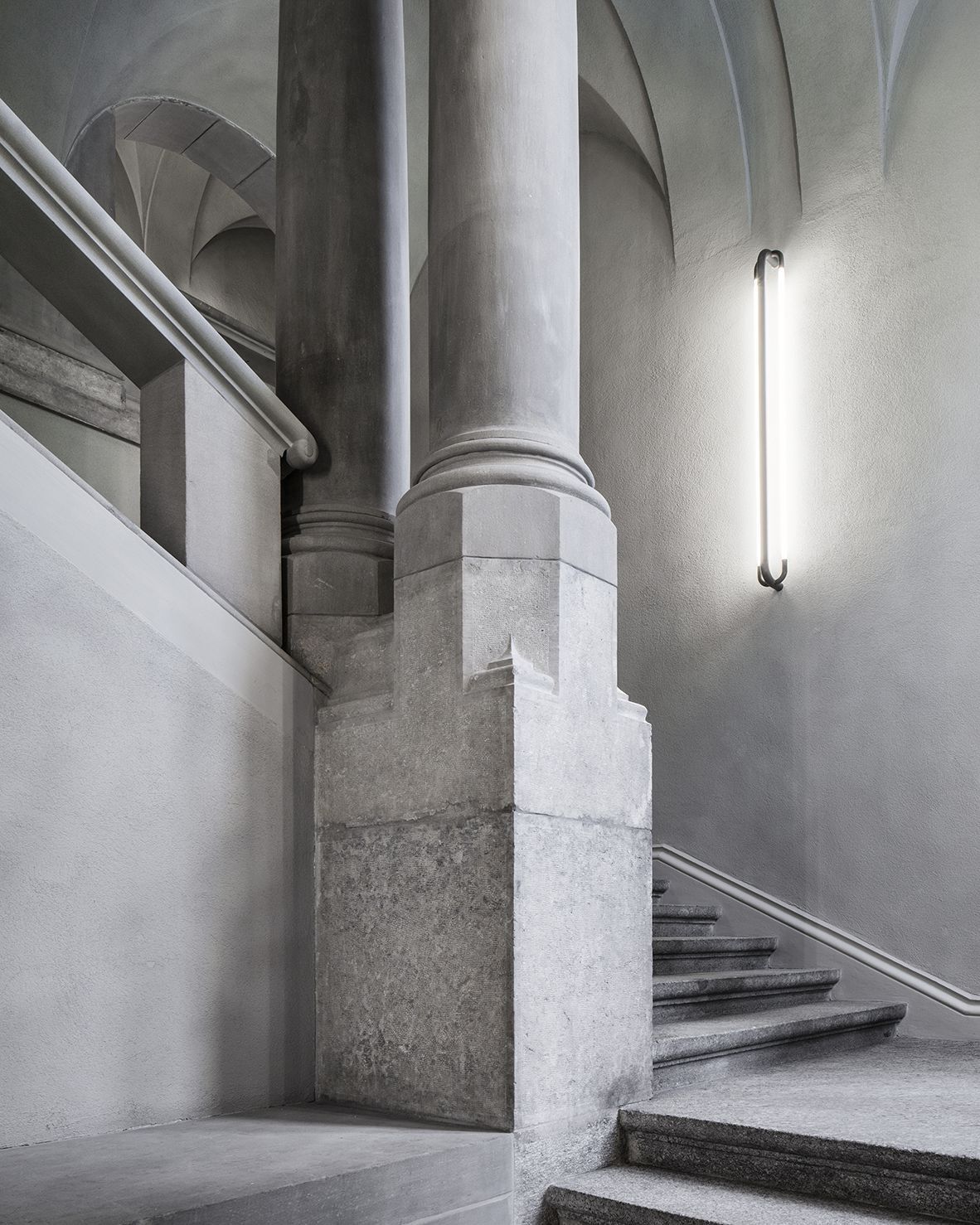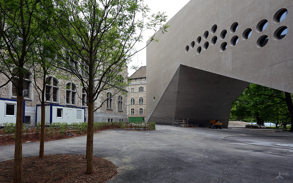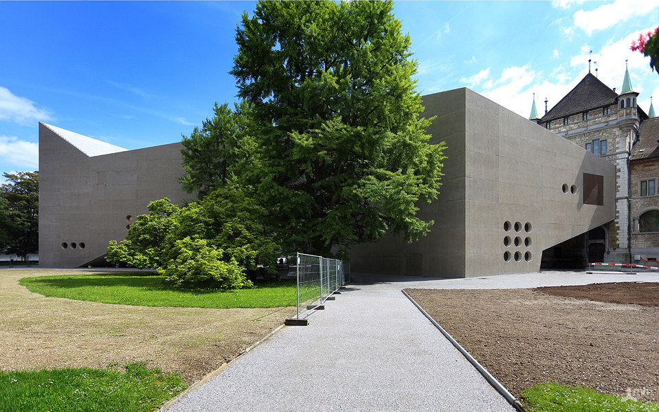 Die Umbauarbeiten am Landesmuseum Zürich auf der Halbinsel zwischen Limmat und Sihl hinter dem Hauptbahnhof haben einen Meilenstein erreicht: Nach 15 Jahren Ausschreibung, Wettbewerb[1], Planung, Vor- und Bauprojekt sowie Ausführung ist der fünfgeschossige Erweiterungsbau von Christ & Gantenbein Architekten seit Juli 2016 eröffnet. Die in Grund- und Aufriss mehrfach geknickte Erweiterung dockt an den Bestand von 1898 an und schliesst den U-förmigen Haupttrakt des Altbaus von Gustav Gull. Sie behebt den Platzmangel des Museums – Ausstellungsflächen, eine Bibliothek und ein Auditorium für öffentliche Veranstaltungen finden darin Platz – und ermöglicht erstmals einen Rundlauf durch alle Ausstellungsräume.