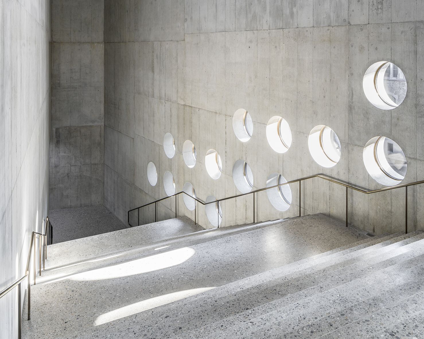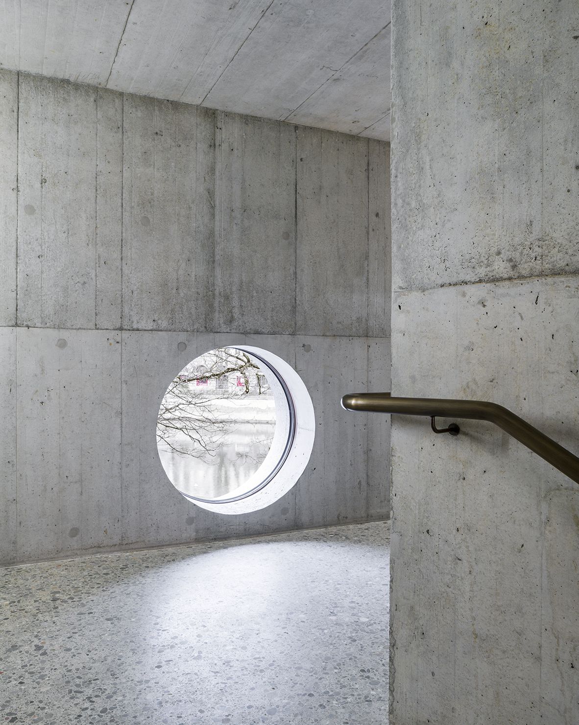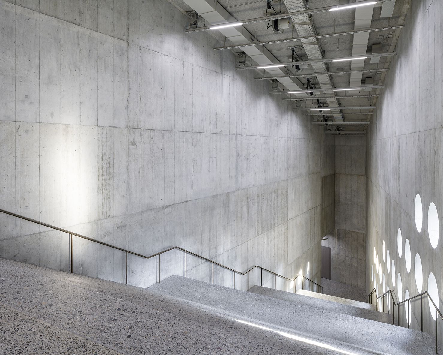 Beidseitig dockt die Erweiterung zwar wie eine Landungsbrücke am West- und Ostflügel des bestehenden Baus an. Doch weil die bestehende Bausubstanz und ihre Fundation nicht für zusätzliche Lasten ausgelegt sind und um aufwendige Verstärkungsmassnahmen im Altbau zu verhindern, überträgt der Neubau keine Lasten: Der flach mit partiellen Vertiefungen fundierte Massivbau, der durch die Betonscheiben der Aussen-, Treppen- und Liftwände horizontal ausgesteift ist, steht grundsätzlich nur auf zwei Füssen und kragt gegen den Altbau beidseitig aus – am einen Ende mit einer Auskragung, die einen zweiten Durchgang kreiert, am anderen Ende – weil so kurz – nur im statischen System sichtbar.