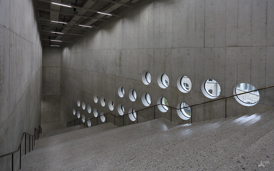 Während den Altbau eine historistische, feingliedrige Fassade auszeichnet, prägen grossflächige, wuchtig anmutende und schlichte Sichtbetonfassaden den Neubau. Diese sind weitgehend geschlossen, denn die Ausstellungsräume gegenwärtiger Museen benötigen kaum natürliches Licht. Einzig Bandfenster in der nordöstlichen Gebäudeecke und 69 Rundfenster, die einzeln und gruppiert in allen Ansichten angeordnet sind, durchbrechen die Fassade. Die Bandfenster zeigen, wo die Bibliothek platziert ist. Als Einschnitte in den geschlossenen Kubus sind sie vorab als Aussparungen in die Schalung eingelegt worden. Die Rundfenster lassen erahnen, wo sich der Neubau im Innern erschliesst. Sie wurden nachträglich als Kernbohrungen in die Fassade gebohrt und lassen punktuell die Sicht von innen nach aussen – weniger von aussen nach innen – zu.